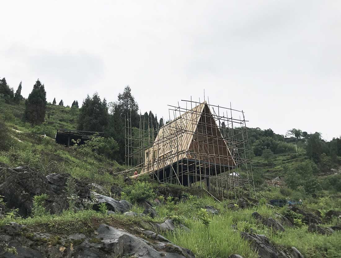 地形是场地中最大的约束,所有建材皆由人工搬运上山。因此木屋酒店主体采用木结构,以挑高的钢结构平台作为基座,提高施工效率的同时尽量不破坏原有的岩石地貌,使建筑及流线与原生态岩石群形成互动。外墙的淬火木以现场制作的方式完成,减少运输成本,并采用简易的工法达到设计效果。