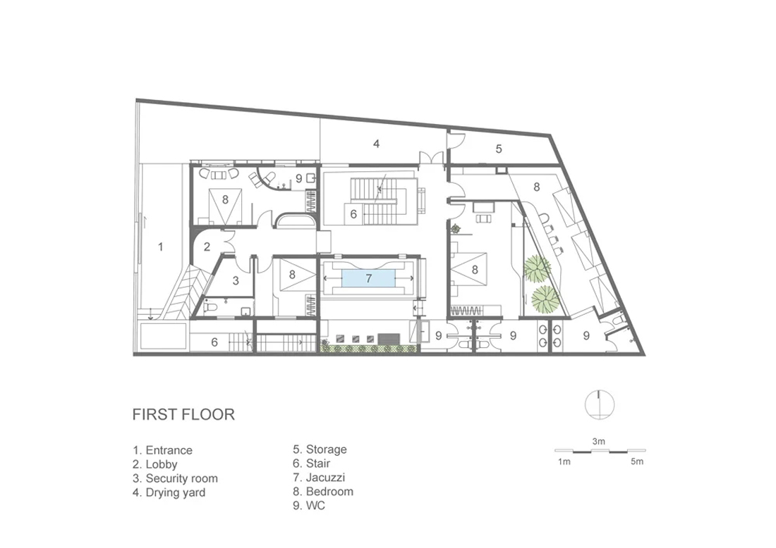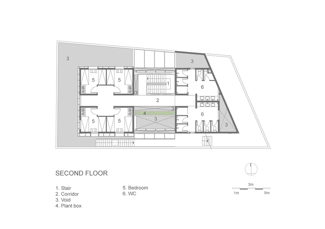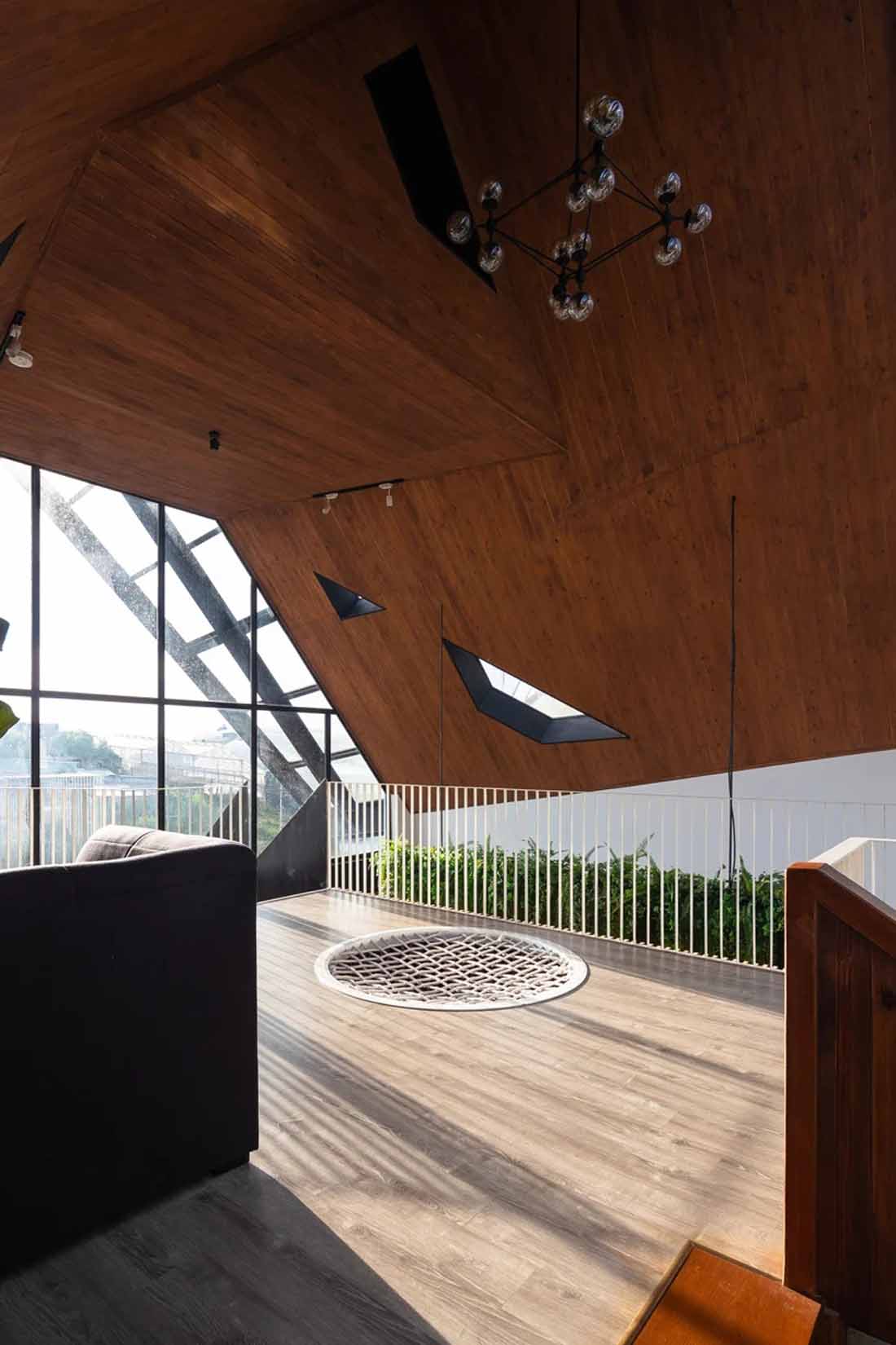 Le House在“午憩小居”外部包裹了一层CNC切割且设计独特的图案穿孔的钢板,钢板可用于抵抗该地区的多雨天气和高度潮湿。该建筑坐落于一处斜坡上,两侧毗邻不同的地形,由此形成了相似却又各具特色的立面,立面之间通过玻璃和钢结构进行连接。当夜幕降临,室内的灯光透过旅馆的穿孔表皮,将其变成一座明亮的灯笼。