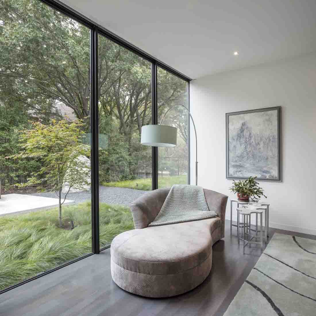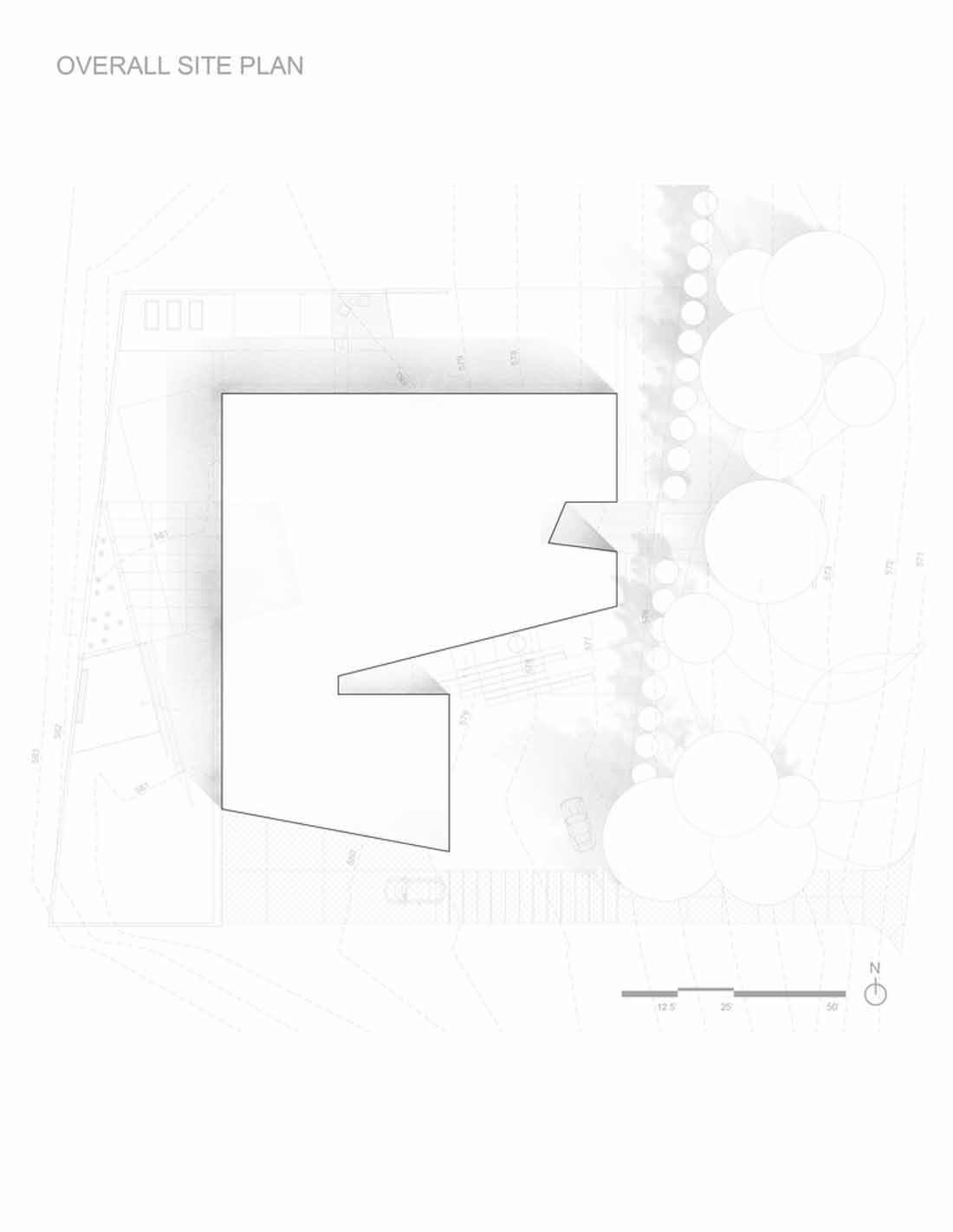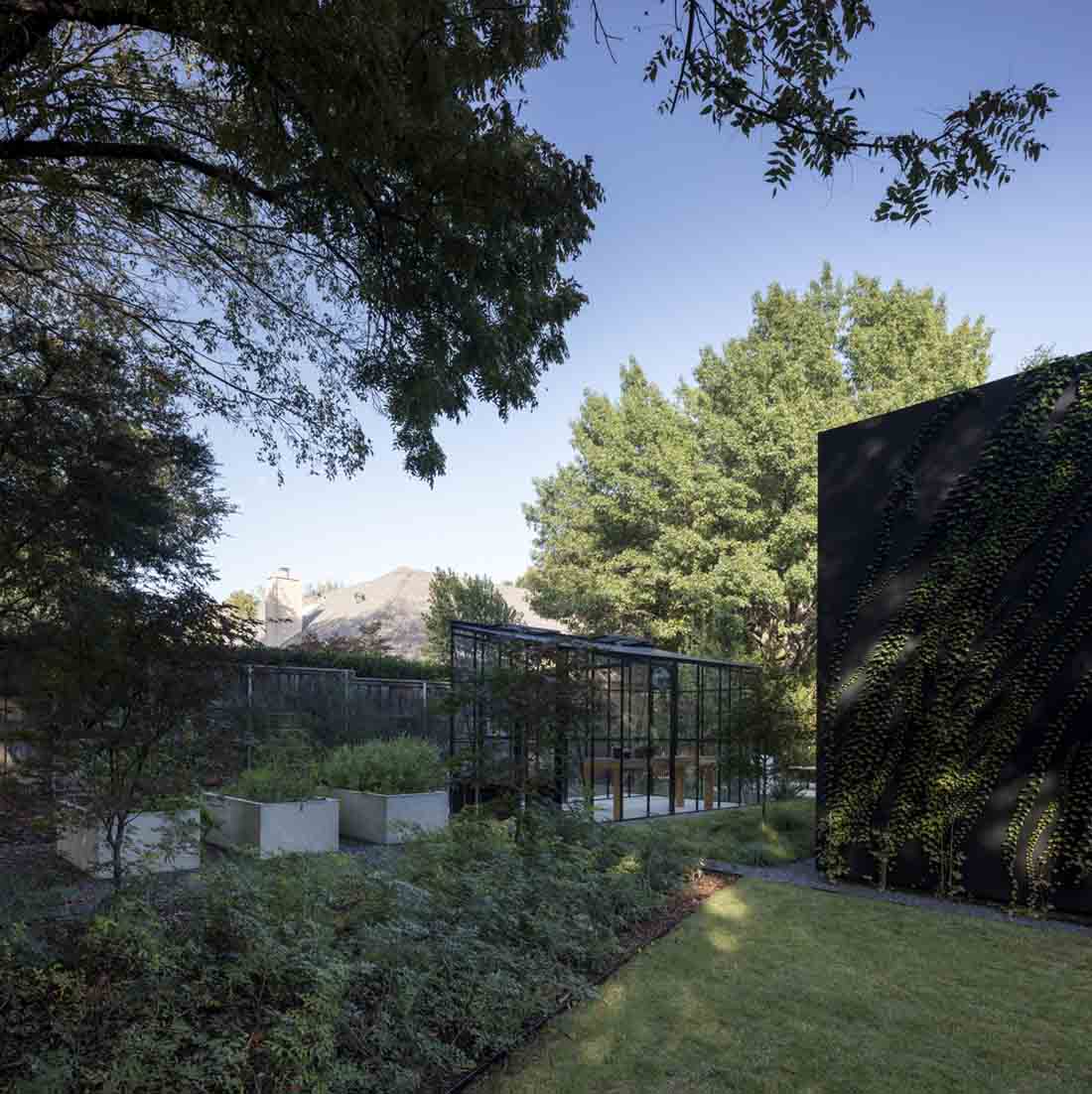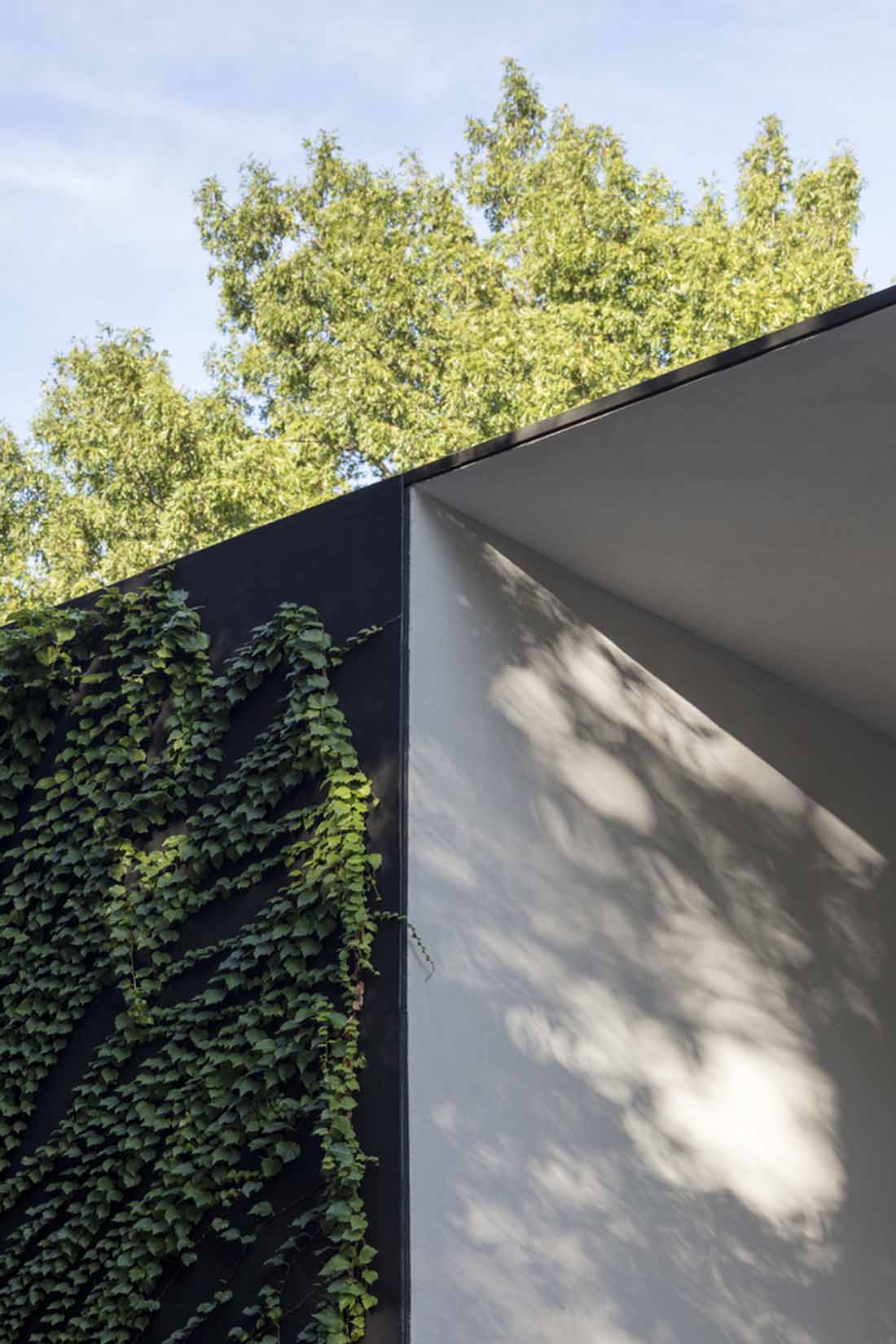 在光滑的反光室内石膏中进行渲染,自然的户外条件使表面具有微妙的色彩。外墙为黑色石膏,预计攀登的波士顿常春藤将超过超时时间;外表面的阴暗黑色使人真正享受到光线,而不是阴影,穿过树木。