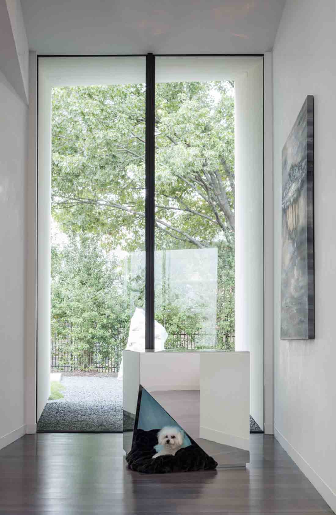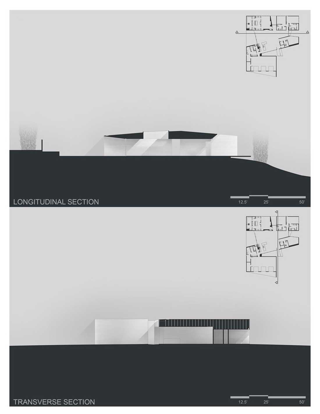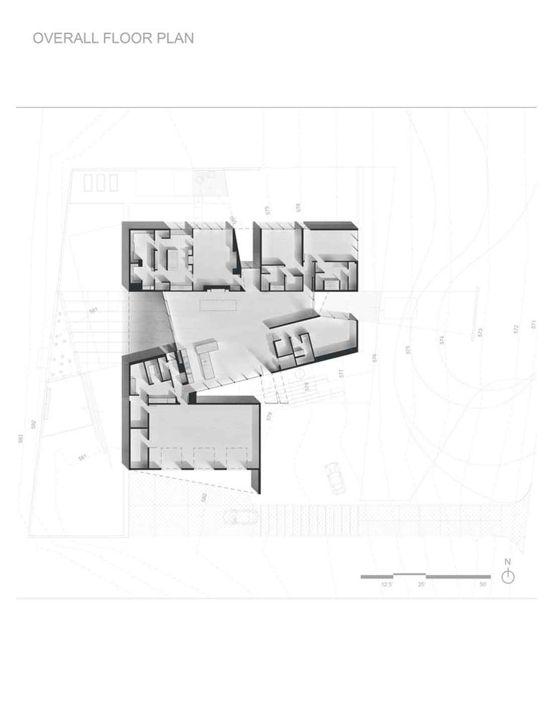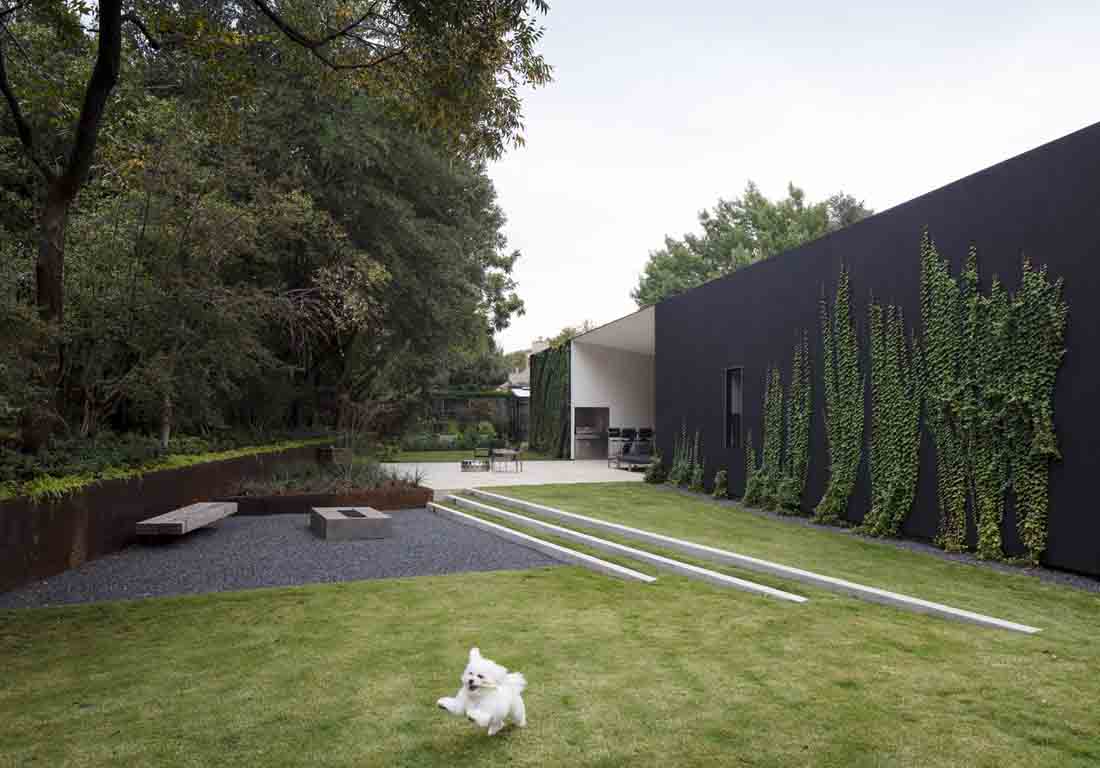在光滑的反光室内石膏中进行渲染,自然的户外条件使表面具有微妙的色彩。外墙为黑色石膏,预计攀登的波士顿常春藤将超过超时时间;外表面的阴暗黑色使人真正享受到光线,而不是阴影,穿过树木。