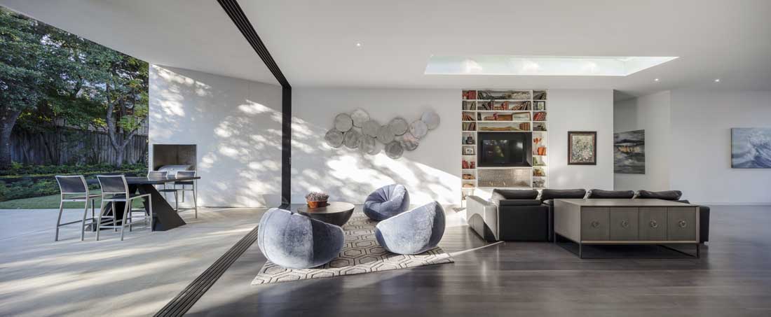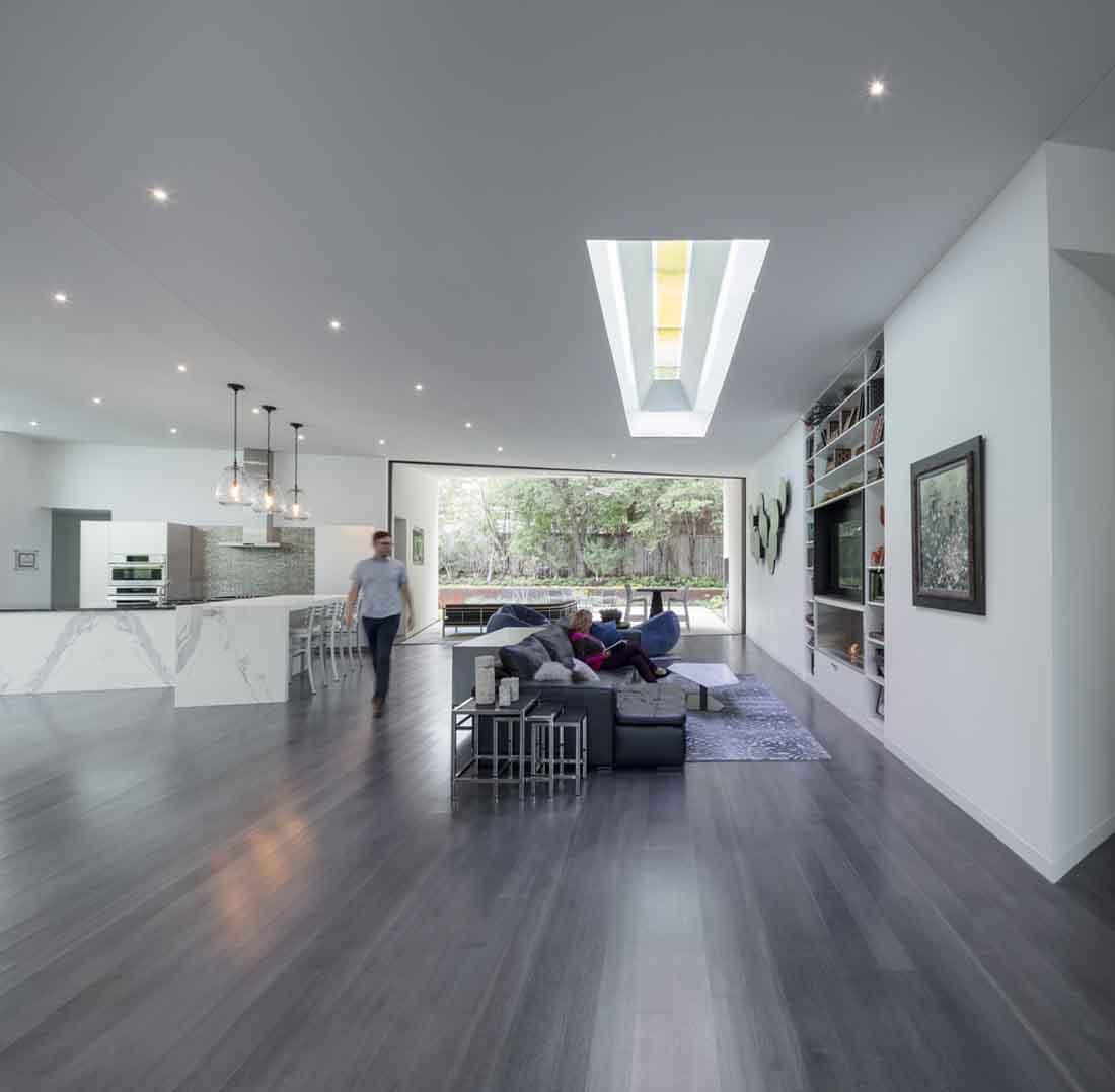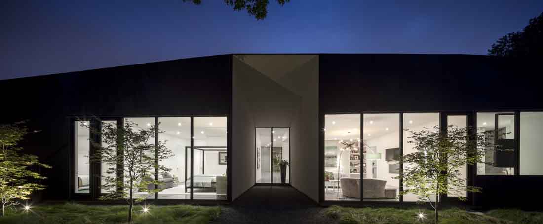 建筑的外壳是一个坚实的黑色石膏块,坐落在一个封闭的花园中,从中雕刻出外部空隙以在建筑和自然之间形成过渡区域。从房屋内部,到外部的所有视点都在郁郁葱葱的景观中终止。滑动玻璃门将整个宽度完全打开,进入房屋相对两端的墙壁上的集成袋,以使自然通风穿过主要居住区。内部建筑是一个简单,清晰的空间,通过全高的窗户和宽大的天窗,光线充足。
