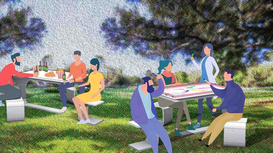 iTable设想了公园桌子,这些桌子可以充当一个地方的日常角色,与他们聊天,交谈和分享美食,但可以翻转以显示电子墨水板,以分享创造力和想法。