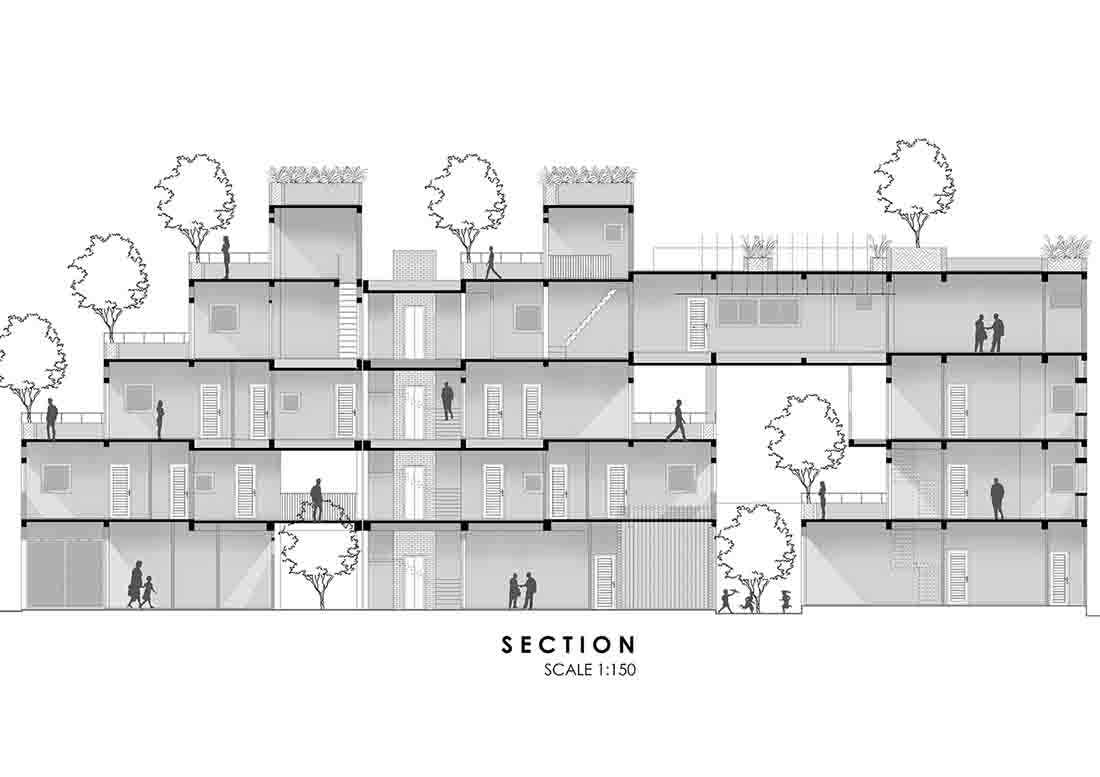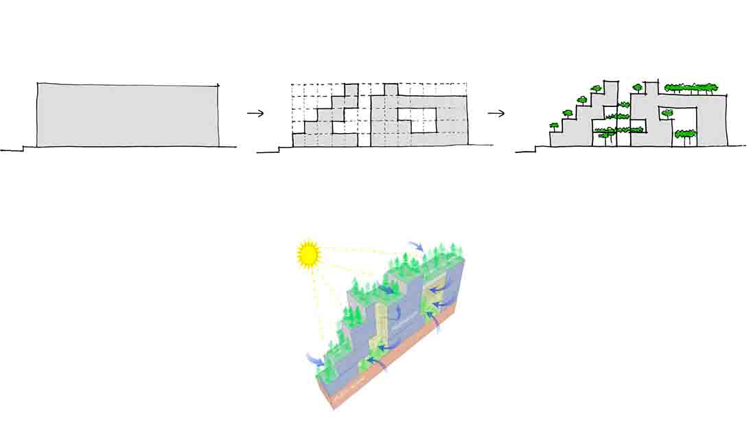 该项目的主要概念来源于梯田。住宅单元相互堆叠,各单元自带的阶梯式露台为室内引入充足的光线。建筑内部设有中庭,以获得自然光并保证空气流通。阶梯式平台加强了人们之间的联系,也提高了垂直互动的可能性。平台提供了小的公共空间和花园,让人们聚集在一起。