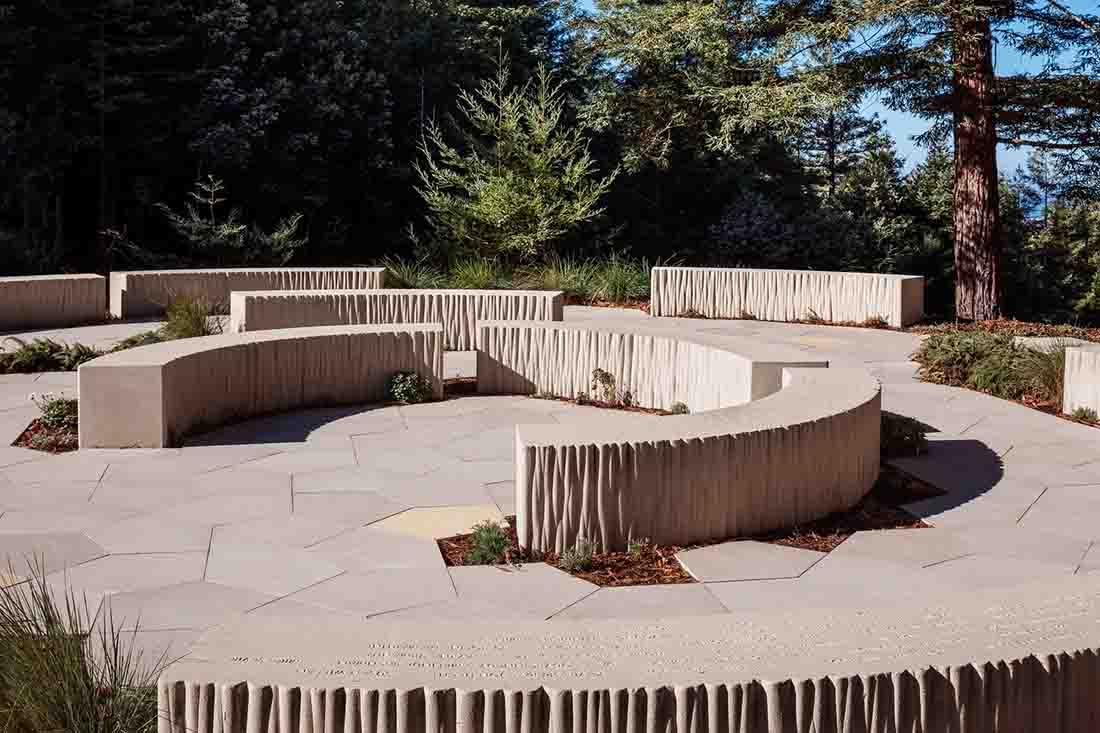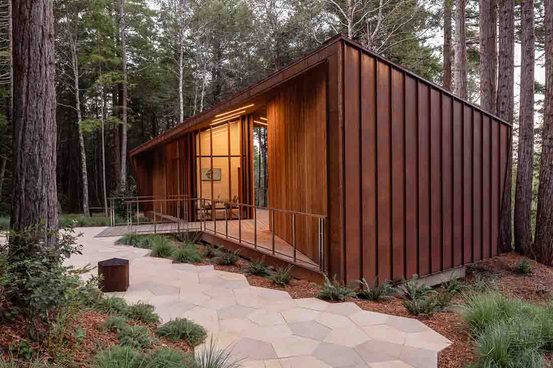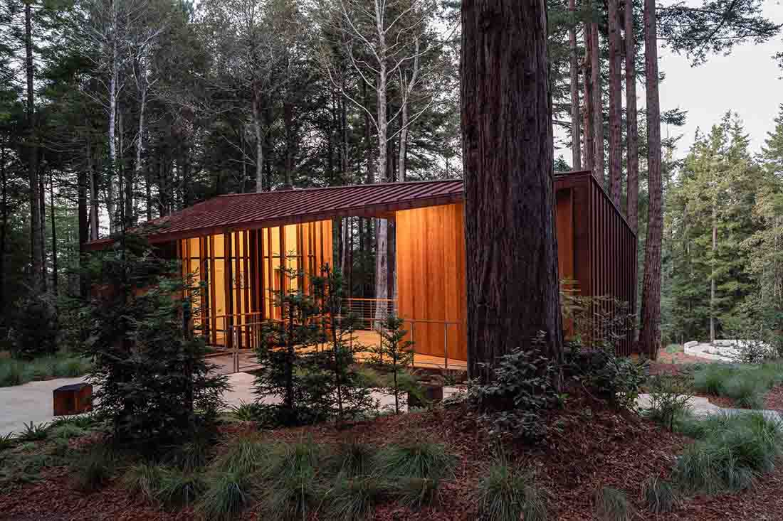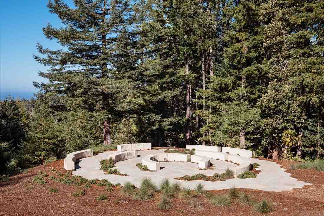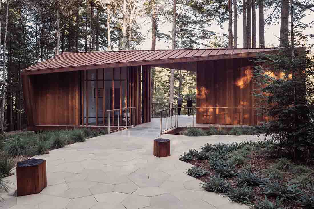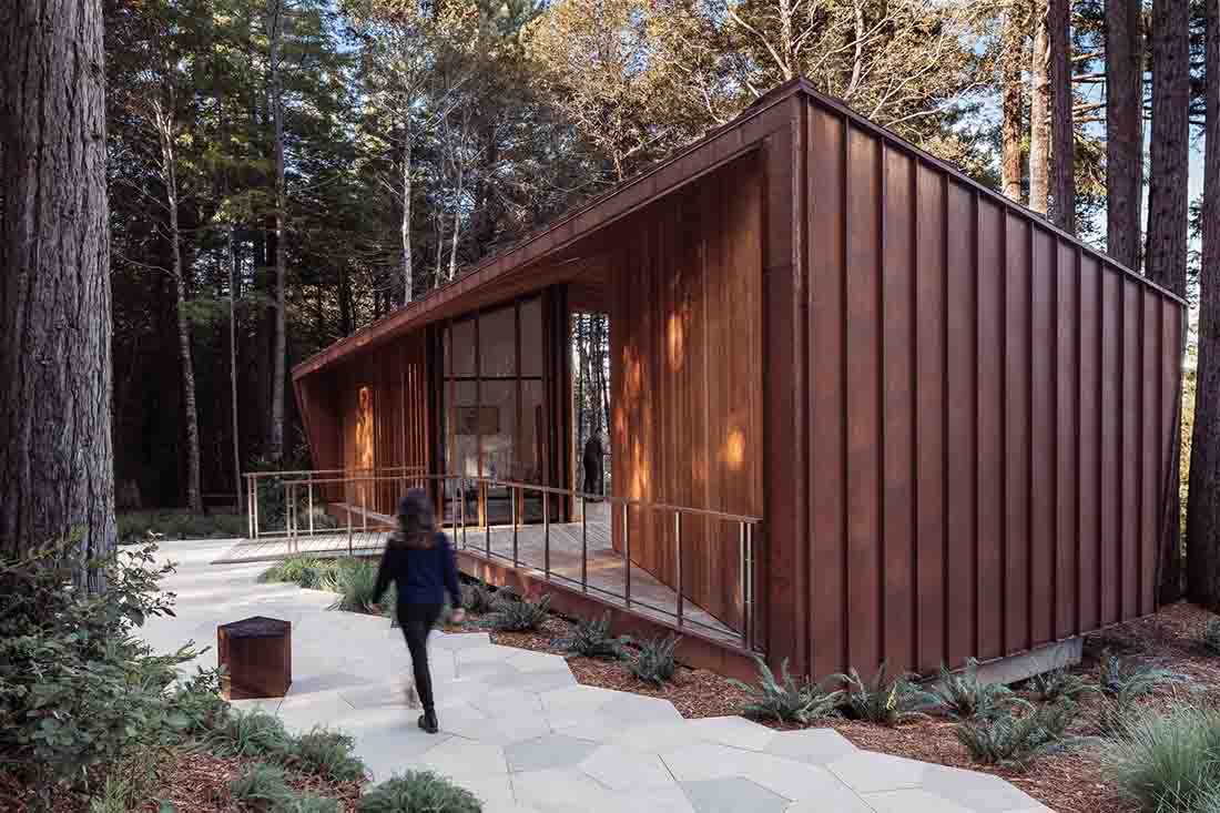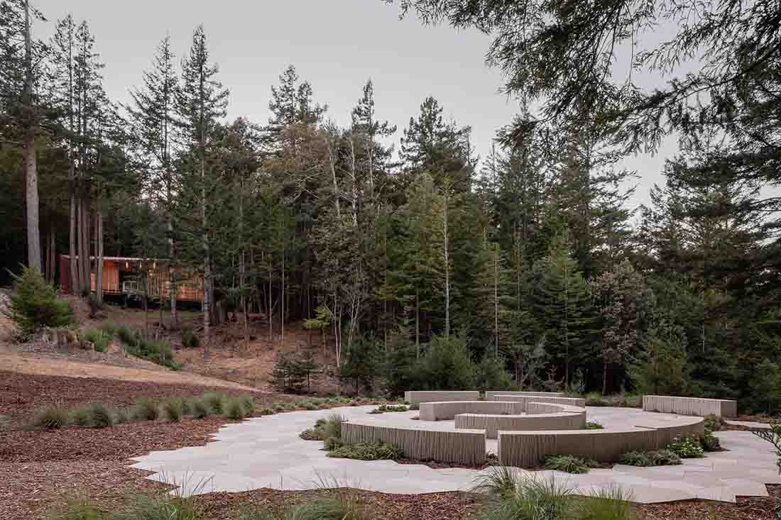 加州竞技场岬(Point Arena)的Better Place森林游客中心坐落在一座郁郁葱葱的山顶上,人们可以由此俯瞰下方草场的景致,建筑标志着进入纪念林旅程的起点。这里提供可持续的替代丧葬方式。在这些被保护的森林中,家庭可以选择一棵树安置亲人们的骨灰。