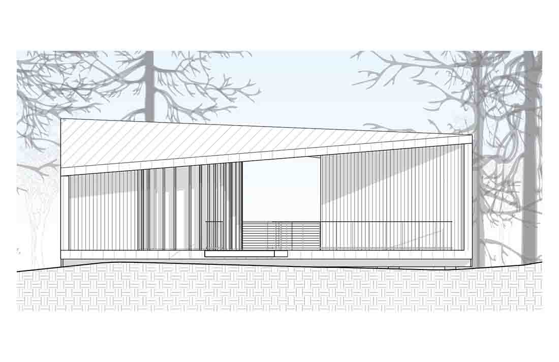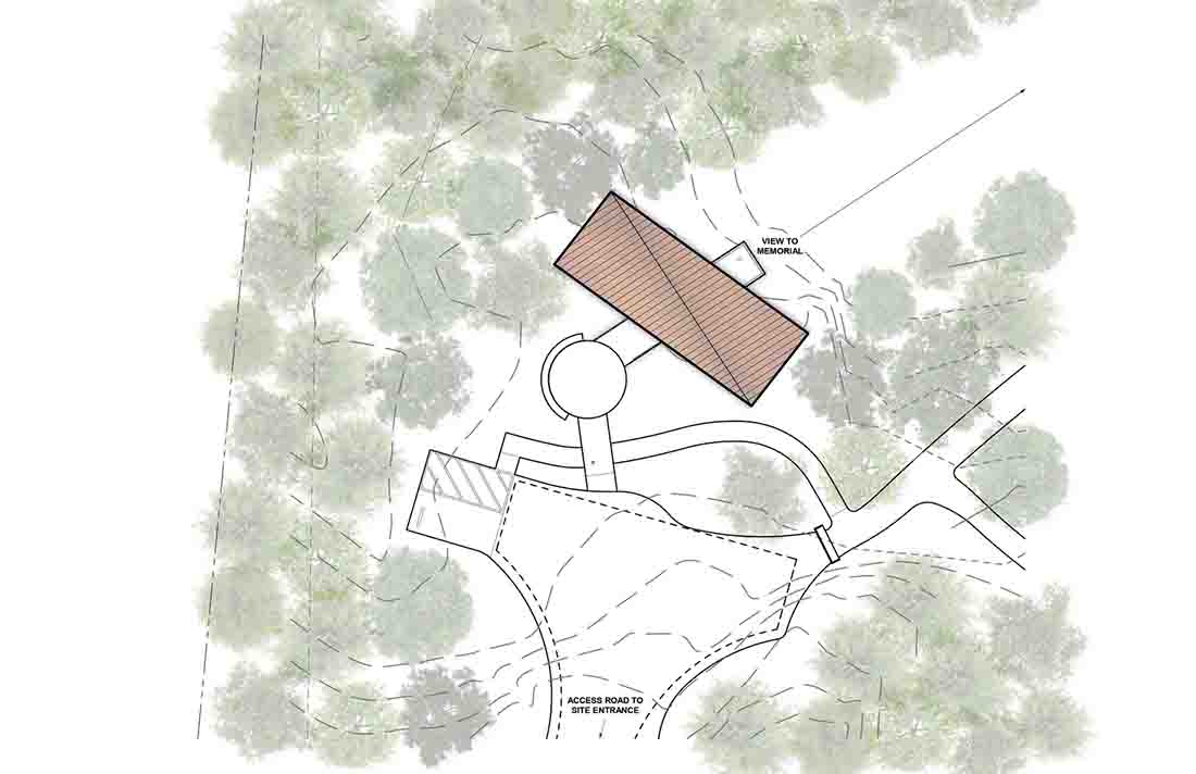 一条水泥路引导人们穿过游客中心,最终到达可以一个远眺草场和森林的有顶平台。当一个人接近森林时,这个平台将自然限定起来。走过边界,访客进入了纪念林。起初被用于伐木的旧木栈道定义了通过森林的主路,而支路将引导人们进入更加私密的空间。小径和开口的网络在护林员和当地工人知识的引导下,随着地面的起伏流动,最终到达一个可以远眺大海和地平线美景的山丘顶部。