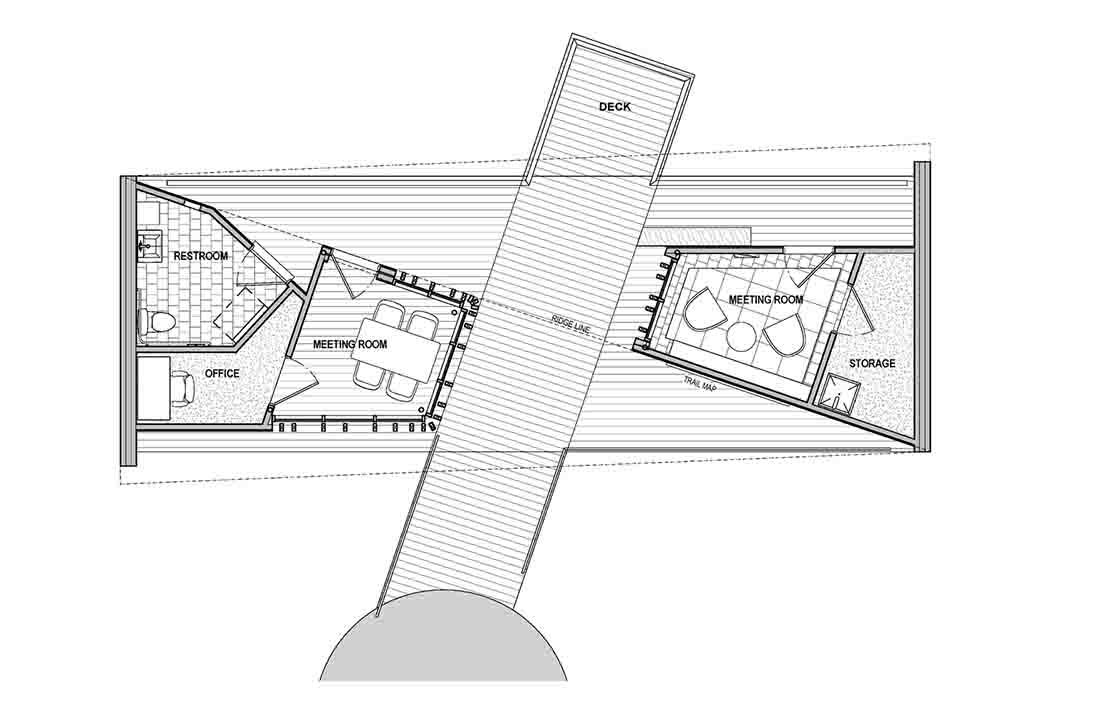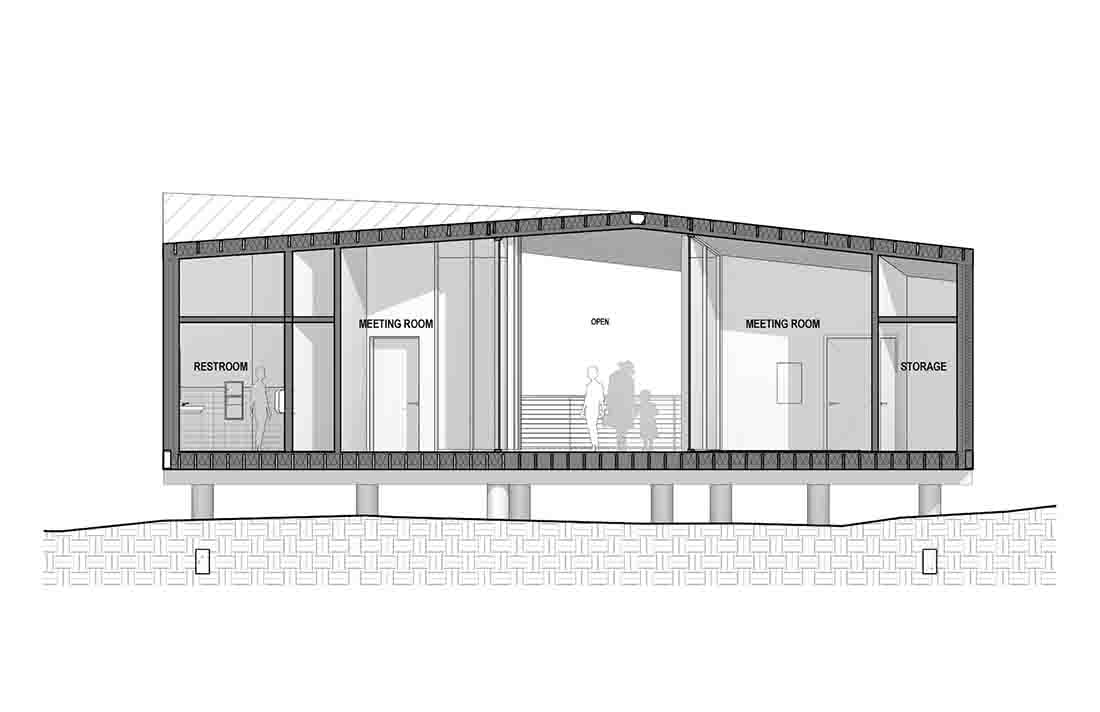 游客中心是20英亩场地中唯一的建筑,其中包含了两个小会议室,一个洗手间和一个员工用房。带顶平台为小团体提供了非正式聚会的场地,访客同时可以俯瞰周边森林和草场的全景。