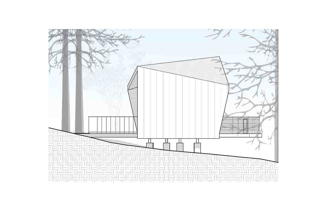 此设计的目标是创造一个确定的界限,以便在森林的边界进行体验的过渡。建筑建在山坡的木桩上,分隔结构的路将访客从地面直接带到树冠层。折板屋顶盖过木平台,提供了大进深的悬挑空间遮蔽并保护平台,同时红杉木的格栅为会议室提供了