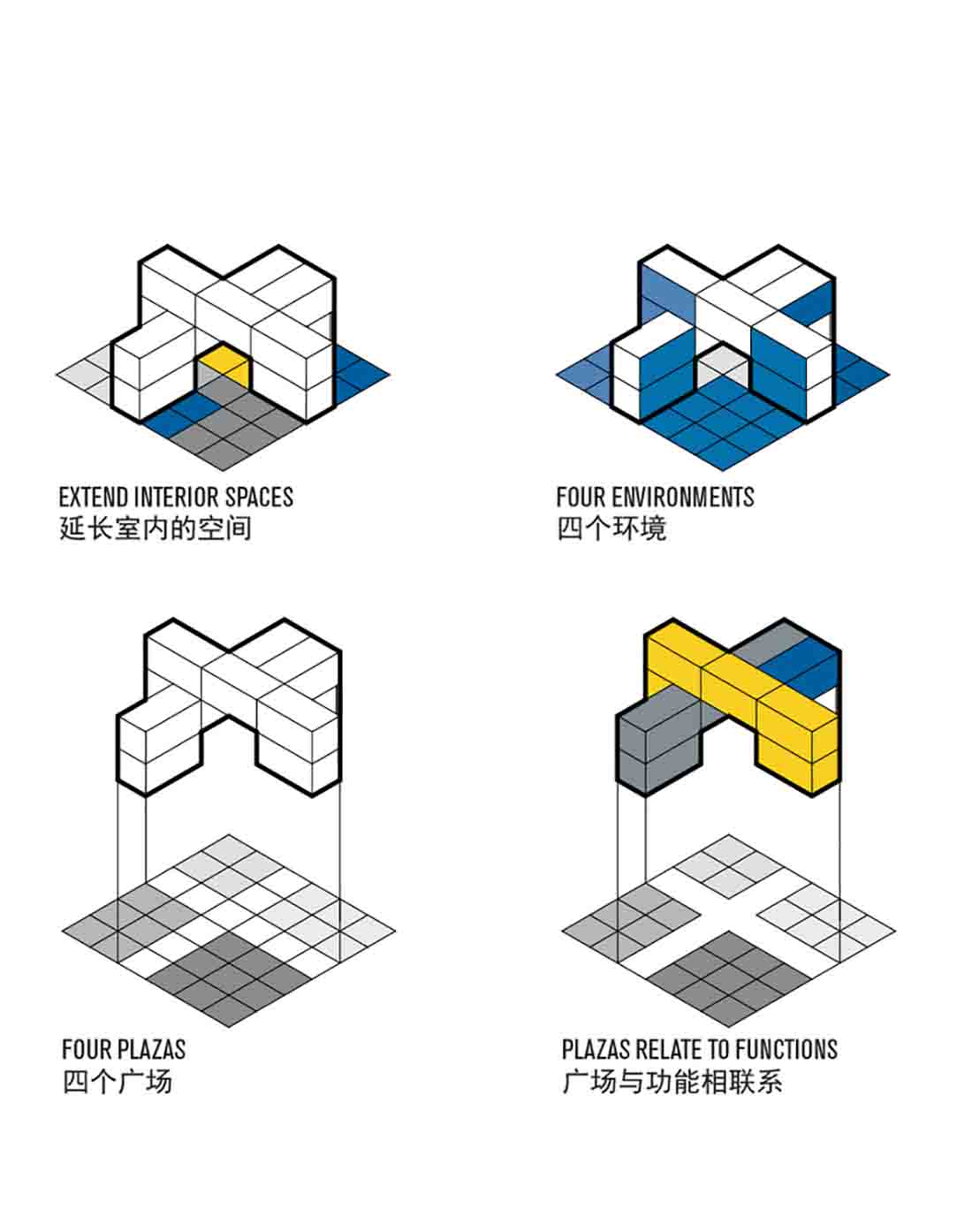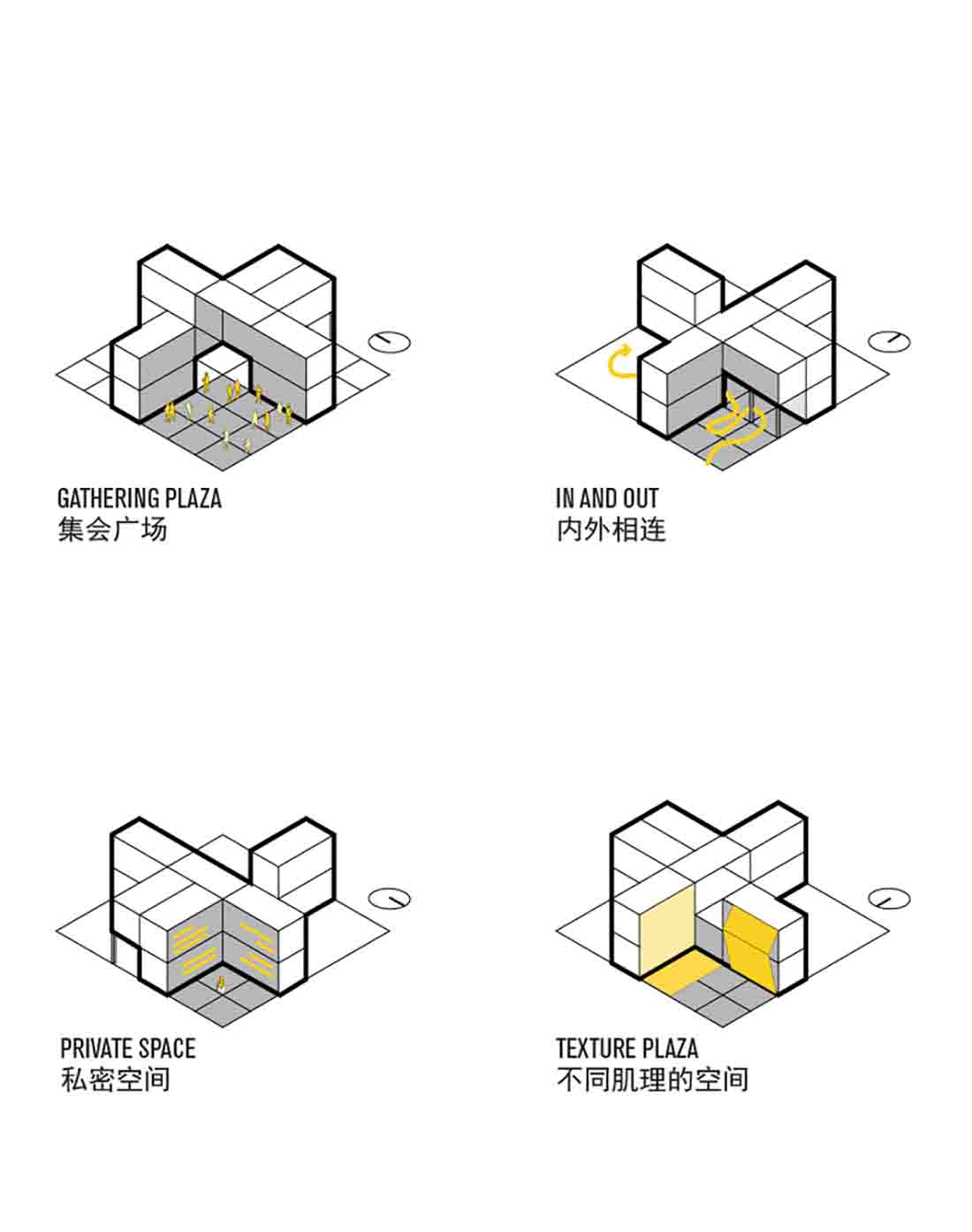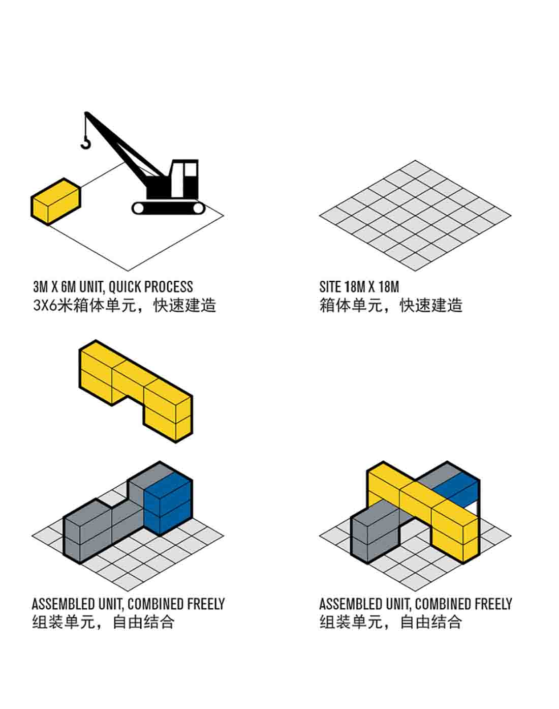 “X”形状创造了不同空间,整个结构呈现开放状态,每个单位模块为一个完整空间,多处开放性链接,可以无限添加更多的标准箱式单元模块,多个模块组合起来,可以在三维向度上无限生长,建筑就能变成一个个无限空间,来灵活适应不同的场所和功能的需要。