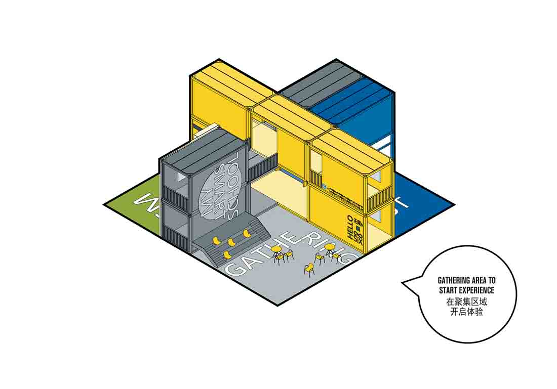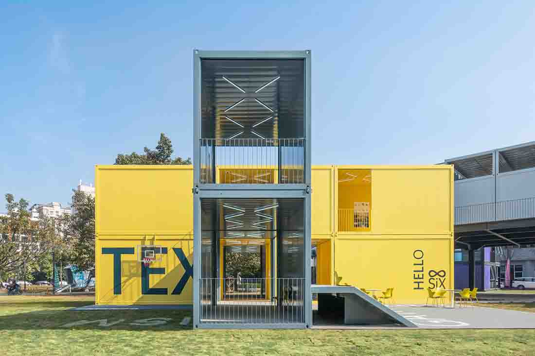 该设施是2019届深圳——香港双年展主题展览的一部分,围绕未来学校的未来教育模式和在教育建筑领域中预制和模块化搭建的可能性。本次组展共设5个展台,均采用中建科技提供的标准箱式单元建成。作品被命名为“无限6”,位于18x18m的场地上。“无限6”平面上十字交叉的“X”形布局,自然地将18x18米的场地划分尾4个独立的小广场。