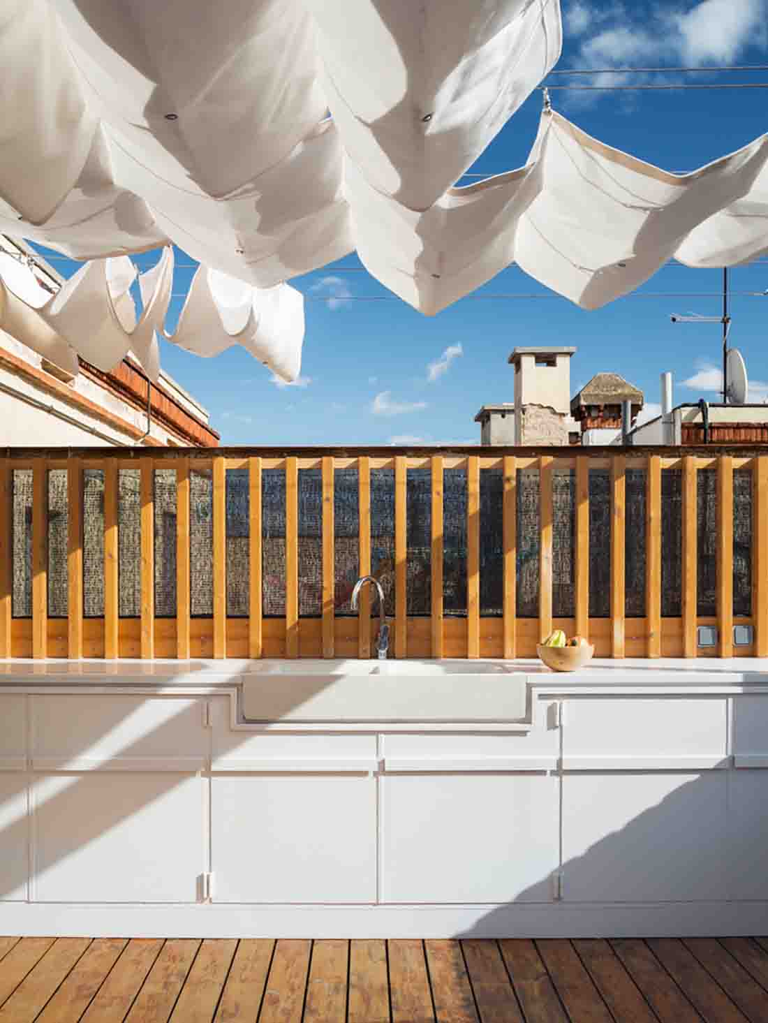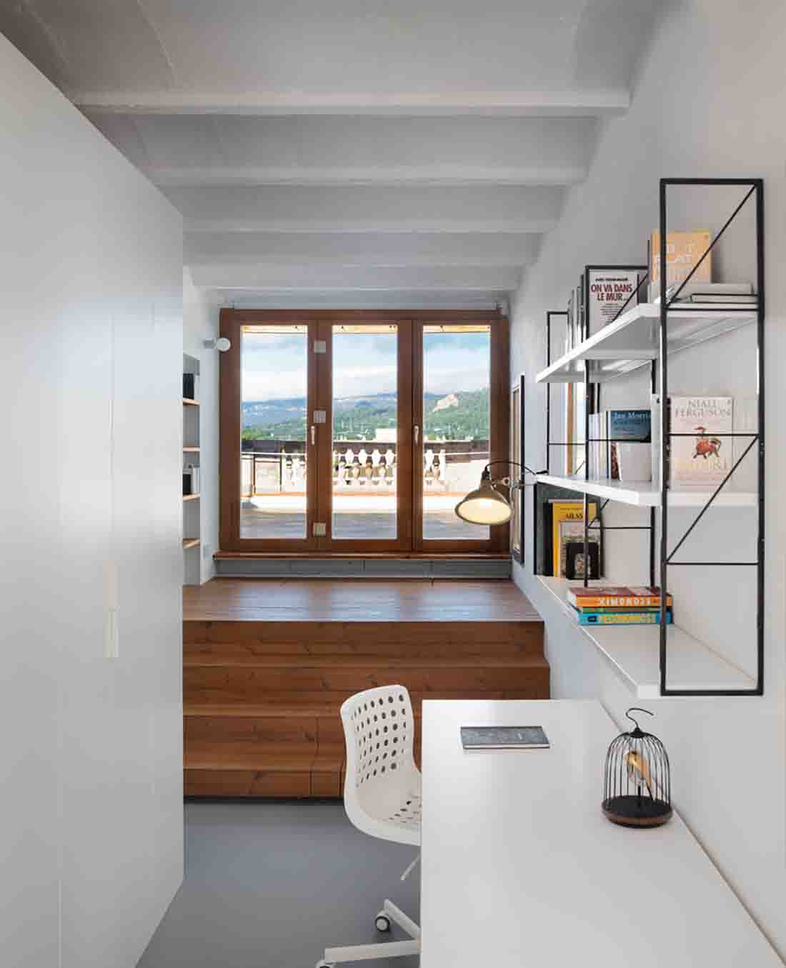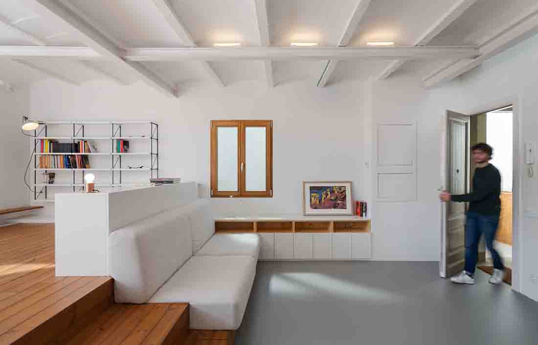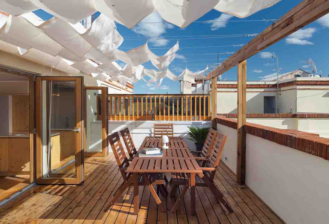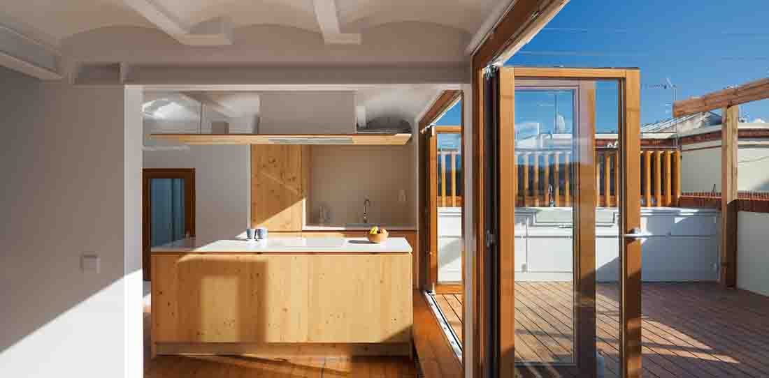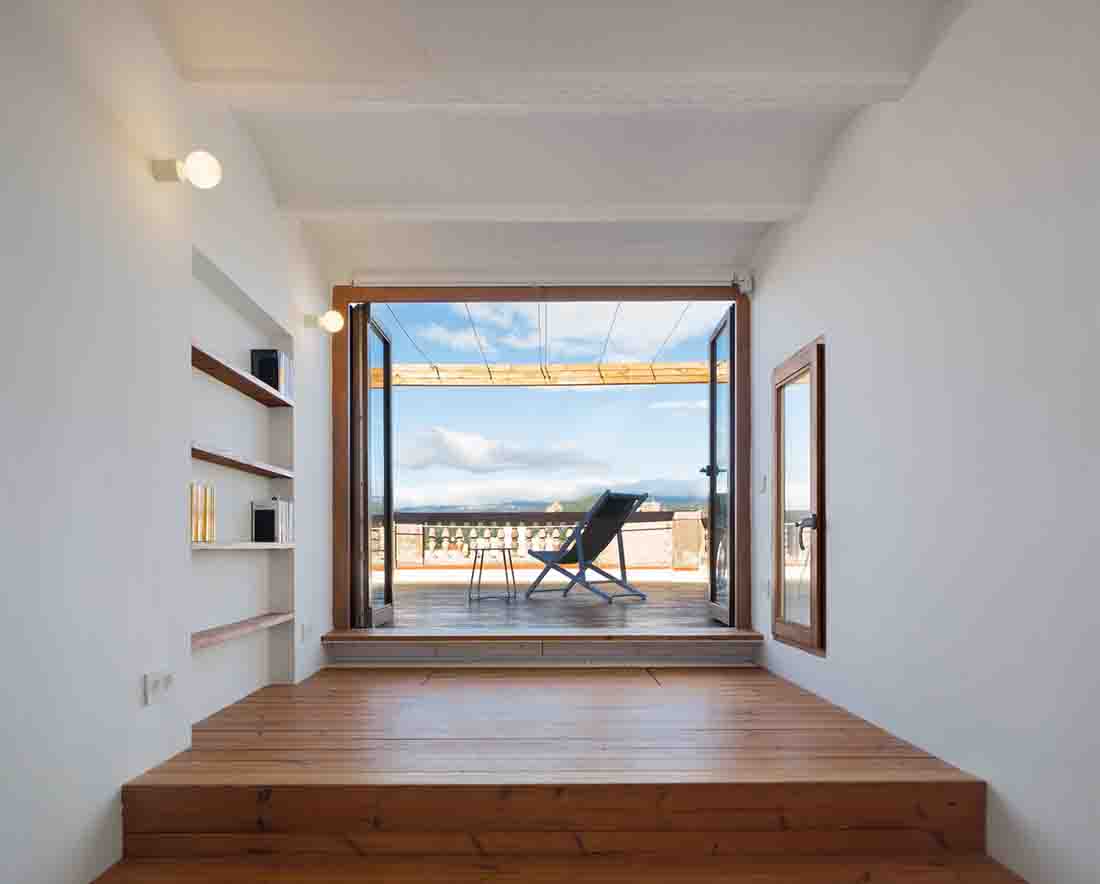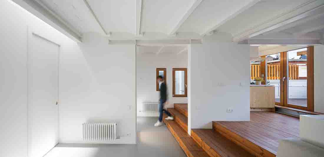 该项目是通过房屋连接建筑物的现有露台,从而使空间之间的过渡尽可能容易。在南北两个立面上打开阳台门,并在两端抬起地面以达到外部水平,从而模糊了内部和外部之间的界限。同样,为了将外部空间引入小公寓,木制人行道被扩展到内部凸起区域,并且定义了一些可以折叠的木工,以最大程度地增加立面中的开口以及与露台的连接。