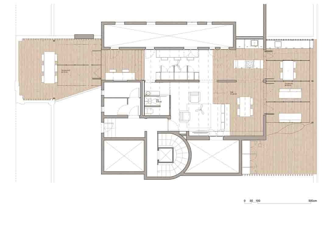 阁楼内部不超过60平方米,连接南北立面而没有任何垂直分隔。露台的尺寸与室内空间相似,是根据方向和用途进行定义的,并为实现夏季晚餐和多种庆祝活动做准备。