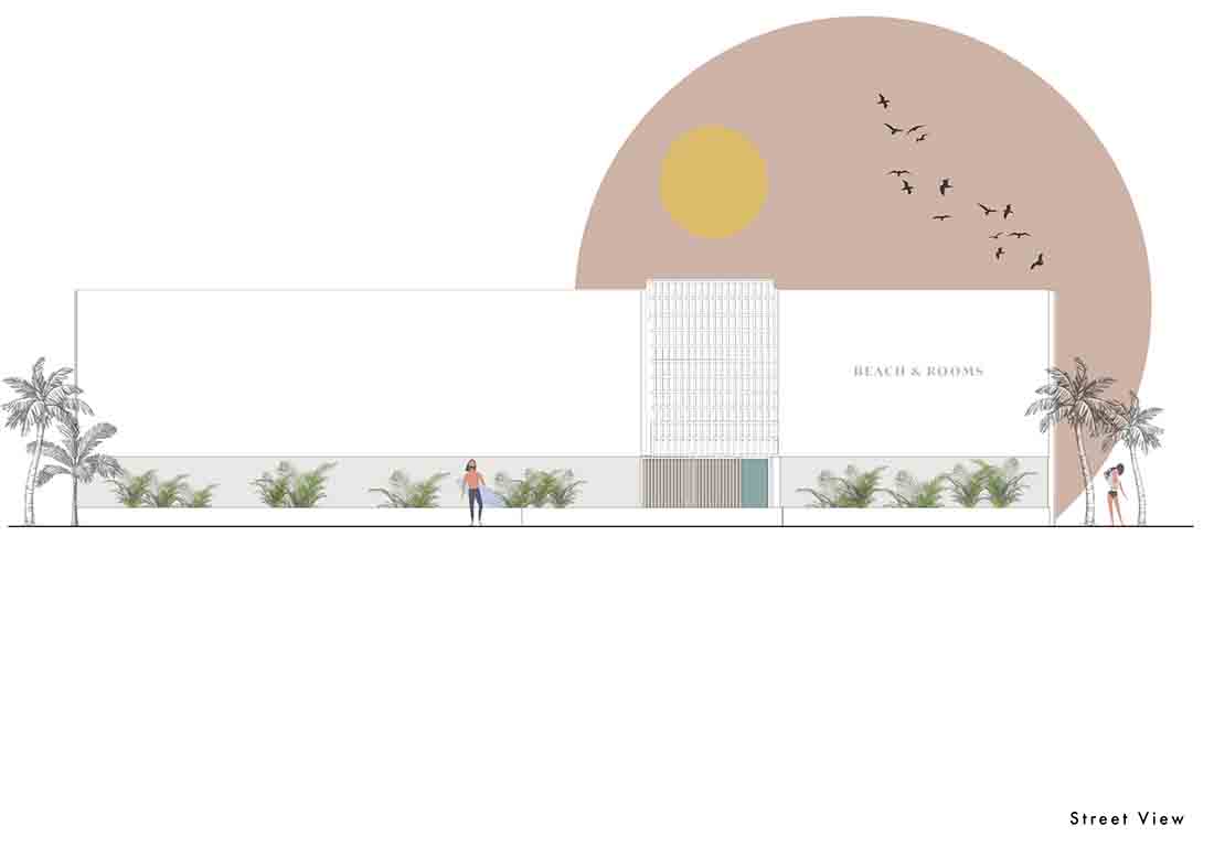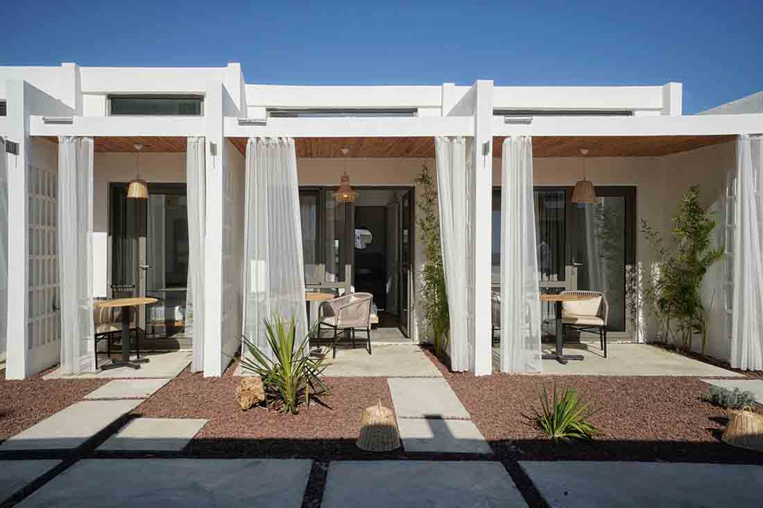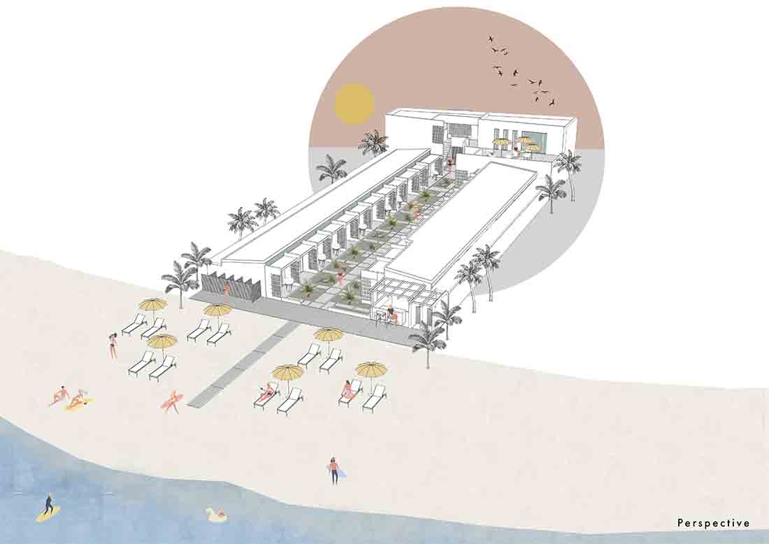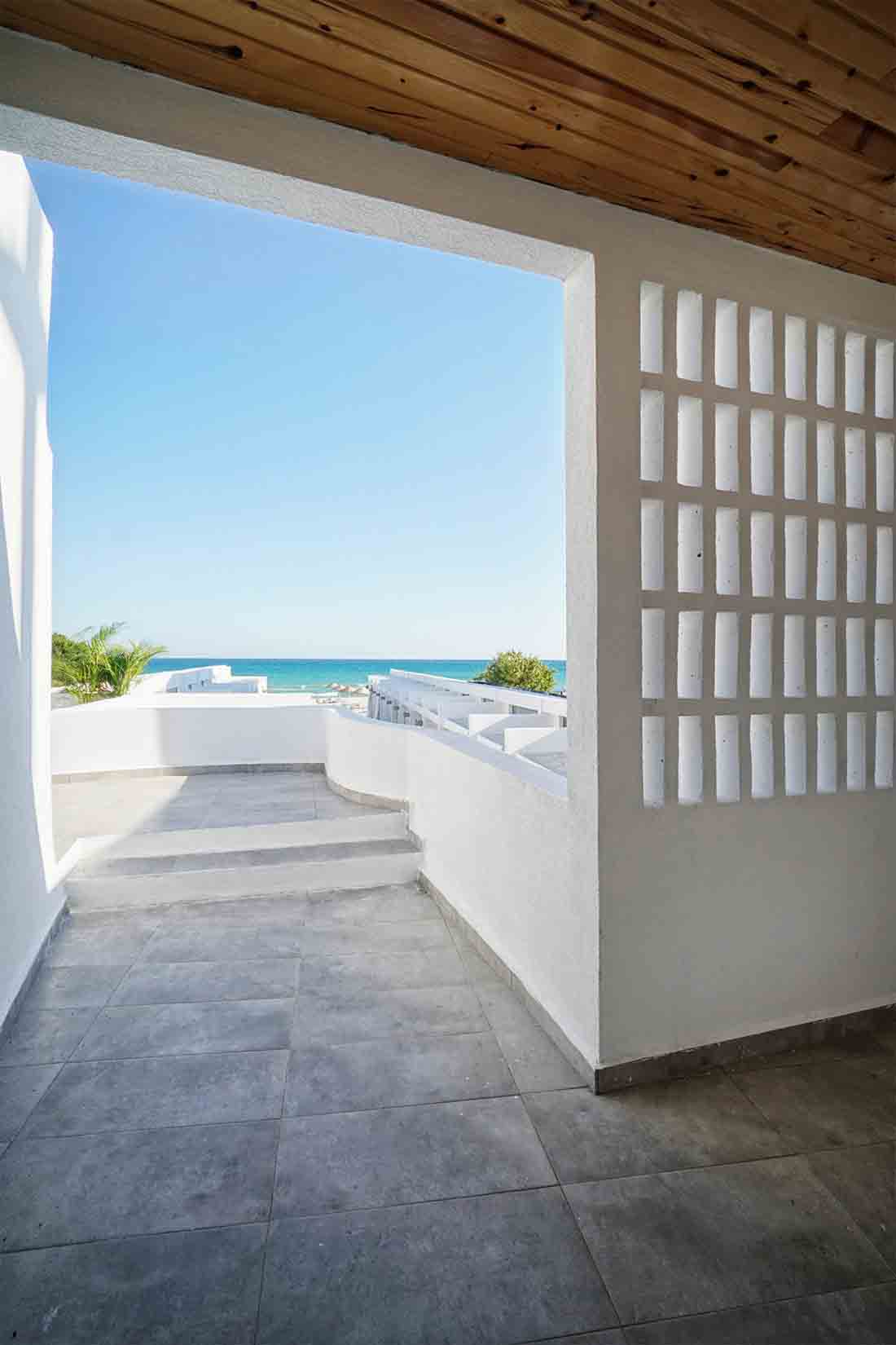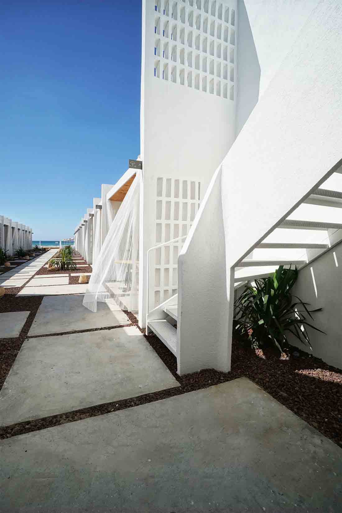 在露台区域的更新改造上,每个露台的开口均朝向中心内院/走廊区域(流通区),连续的房间对向布置而形成独立的两个单元;设计将内院区域作为中心的一条步行轴与每个房间相连,其目的是将步行轴突出出来,并通过景观布置来点缀轴线以外的区域,从而打造一条面向大海的景观廊道。此外,每个房间的露台都直接连接到侧厅单元和内部庭院/走廊。考虑到客房相互间所需的分隔,在设计中采用了镂空的半透墙和遮阳帘。