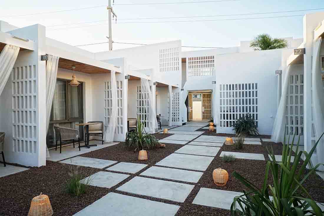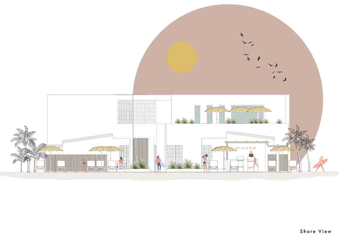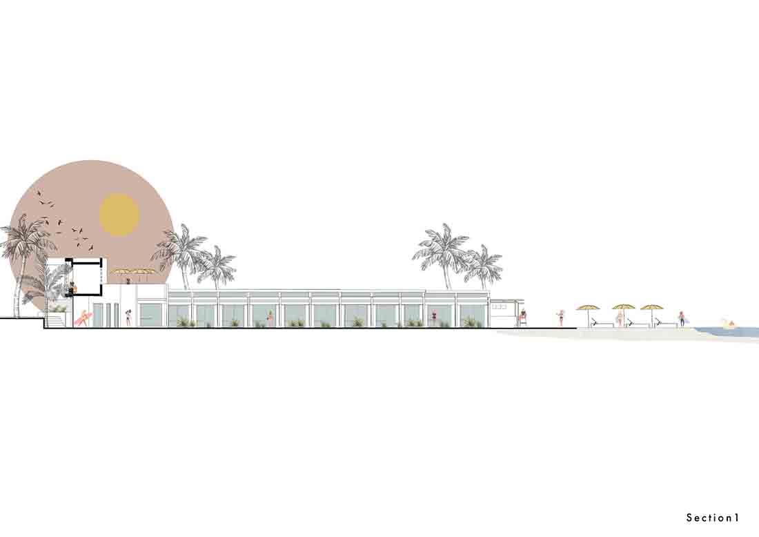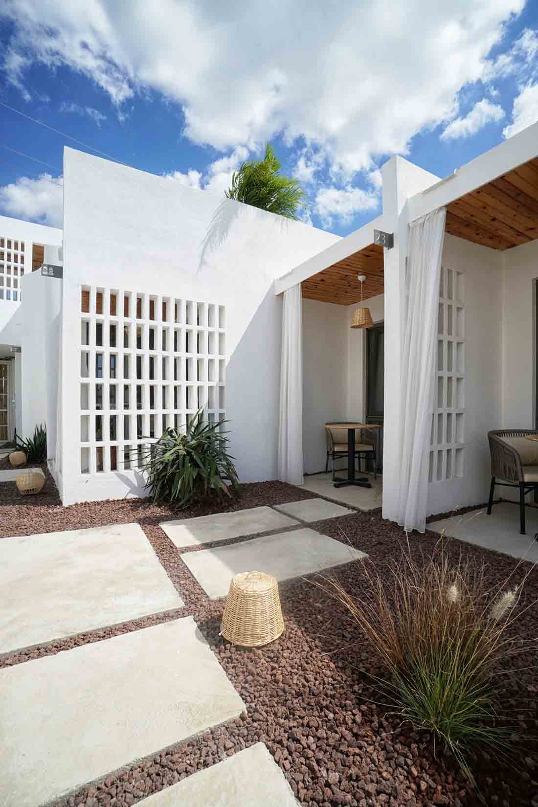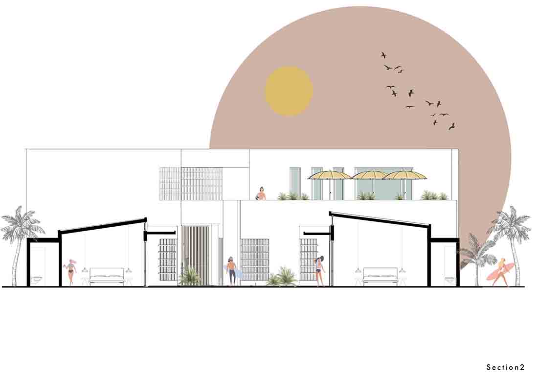 在露台区域的更新改造上,每个露台的开口均朝向中心内院/走廊区域(流通区),连续的房间对向布置而形成独立的两个单元;设计将内院区域作为中心的一条步行轴与每个房间相连,其目的是将步行轴突出出来,并通过景观布置来点缀轴线以外的区域,从而打造一条面向大海的景观廊道。此外,每个房间的露台都直接连接到侧厅单元和内部庭院/走廊。考虑到客房相互间所需的分隔,在设计中采用了镂空的半透墙和遮阳帘。