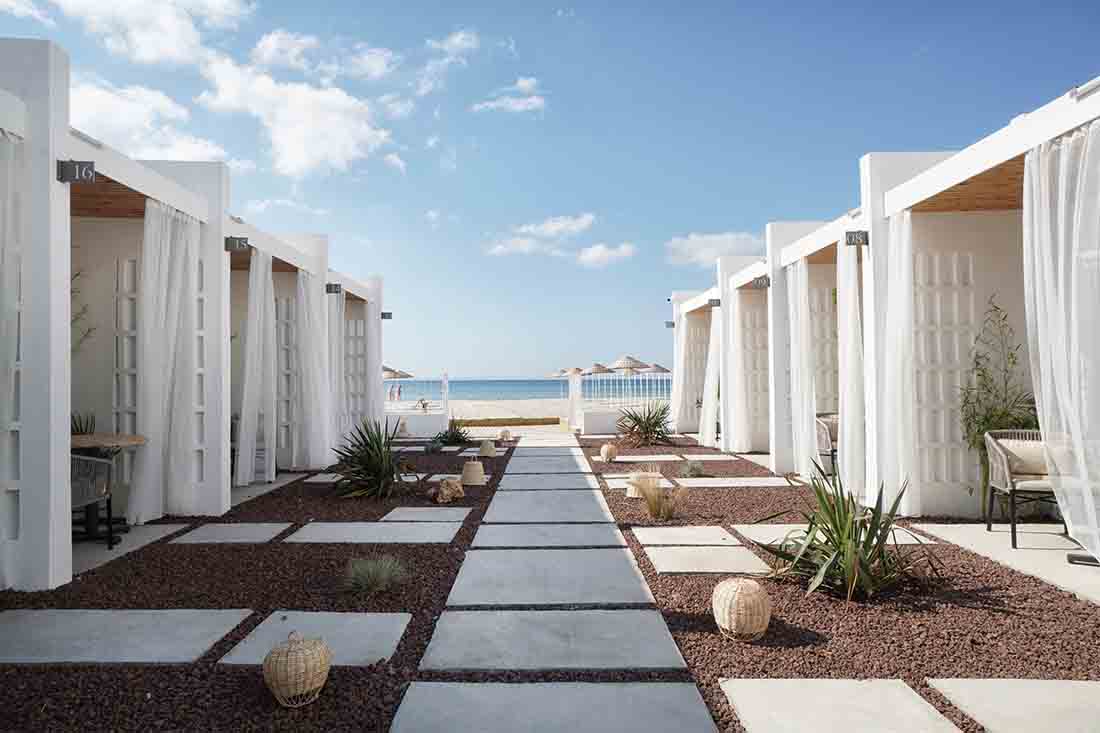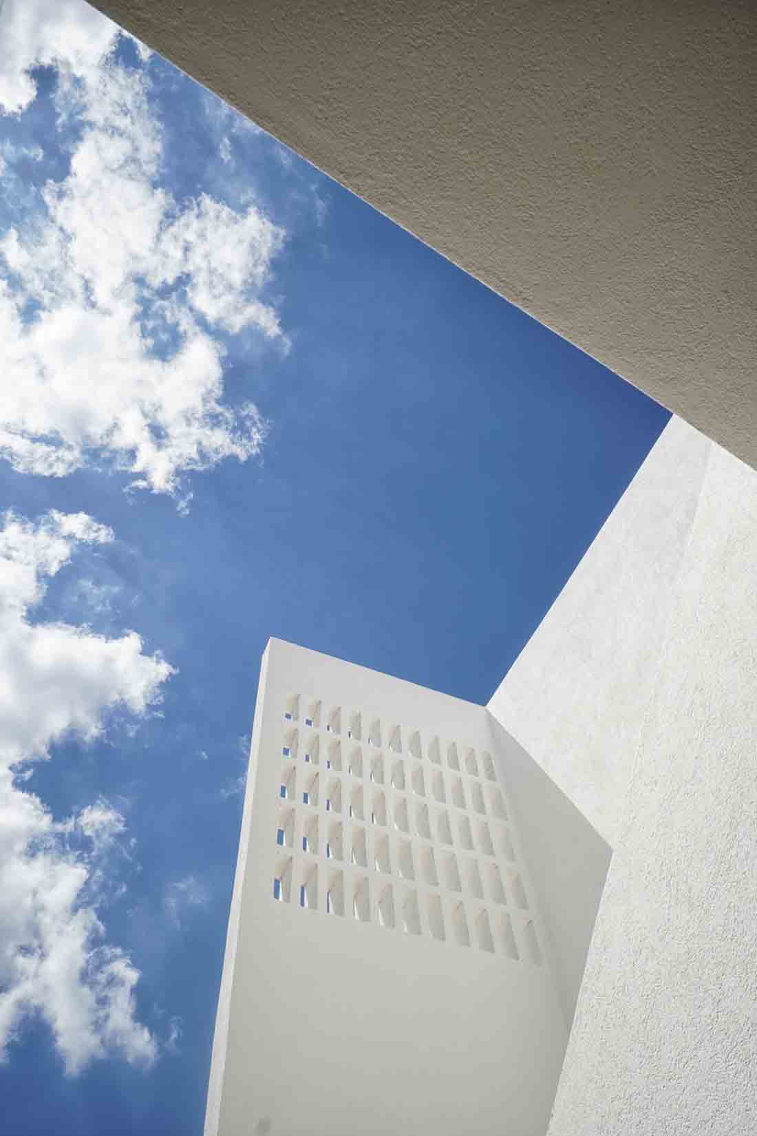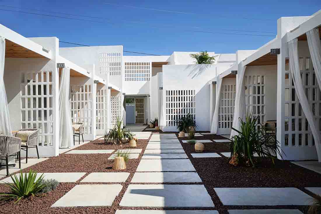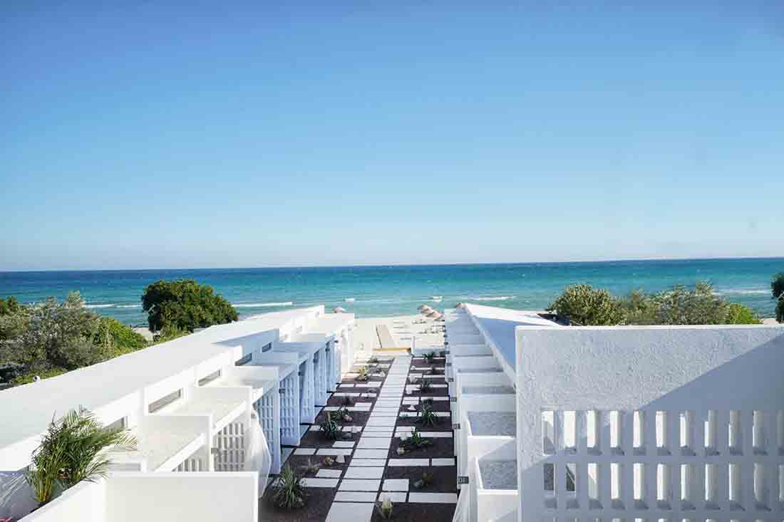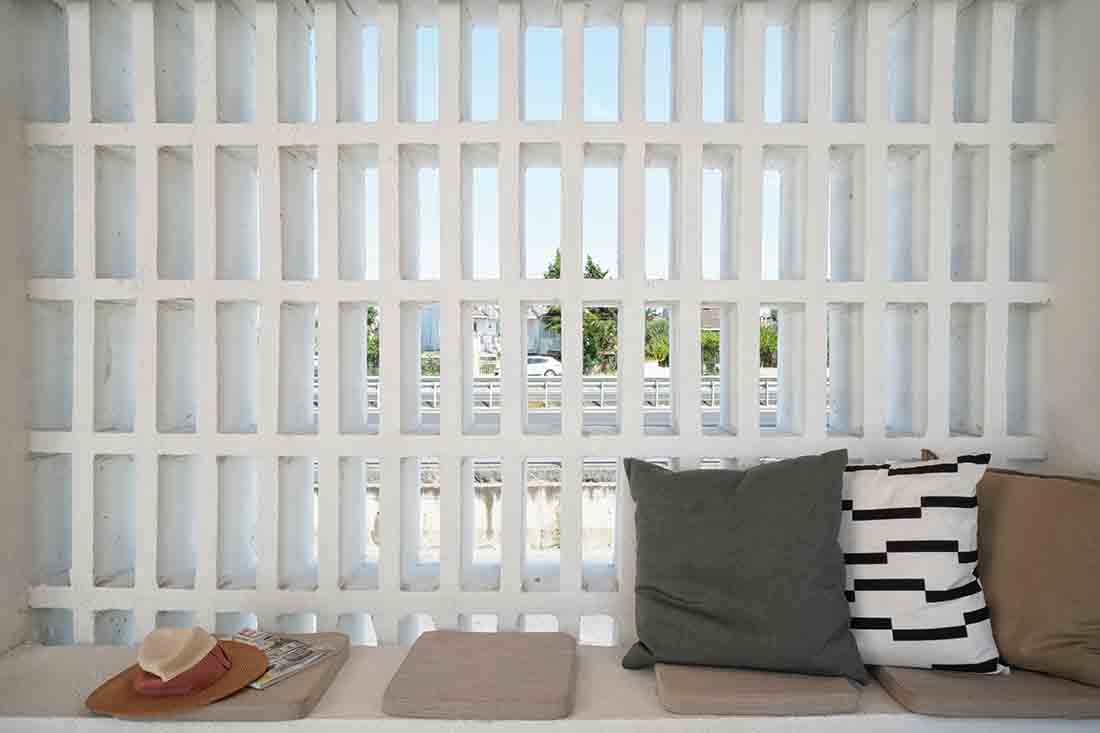 在露台区域的更新改造上,每个露台的开口均朝向中心内院/走廊区域(流通区),连续的房间对向布置而形成独立的两个单元;设计将内院区域作为中心的一条步行轴与每个房间相连,其目的是将步行轴突出出来,并通过景观布置来点缀轴线以外的区域,从而打造一条面向大海的景观廊道。此外,每个房间的露台都直接连接到侧厅单元和内部庭院/走廊。考虑到客房相互间所需的分隔,在设计中采用了镂空的半透墙和遮阳帘。