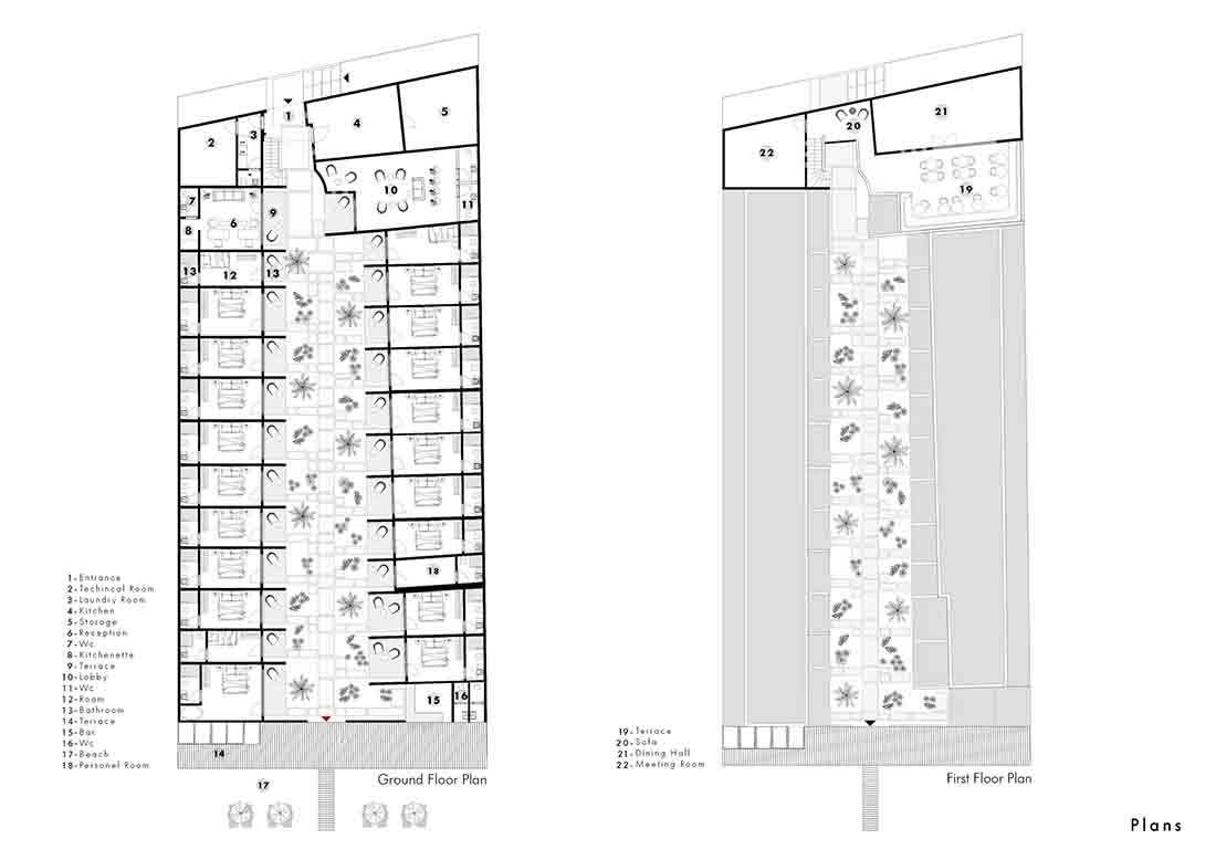 度假酒店位于距离欧洲伊斯坦布尔公路(Europe-Istanbul road)和马尔马拉海(Marmara Sea)海岸线不远的一个地方,建筑沿着地块连续排布。酒店房间呈两排布置,中间的空间便形成了一条通向大海的宽阔内院/走廊,由遮阳露台和房间前面的硬质庭院共同构成。
