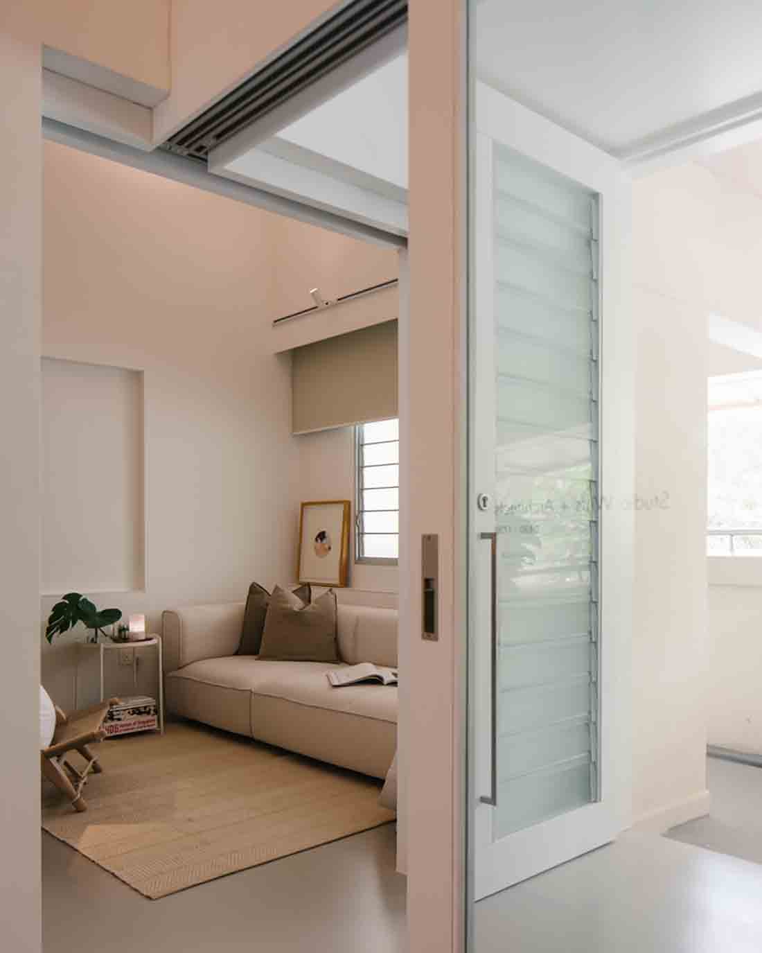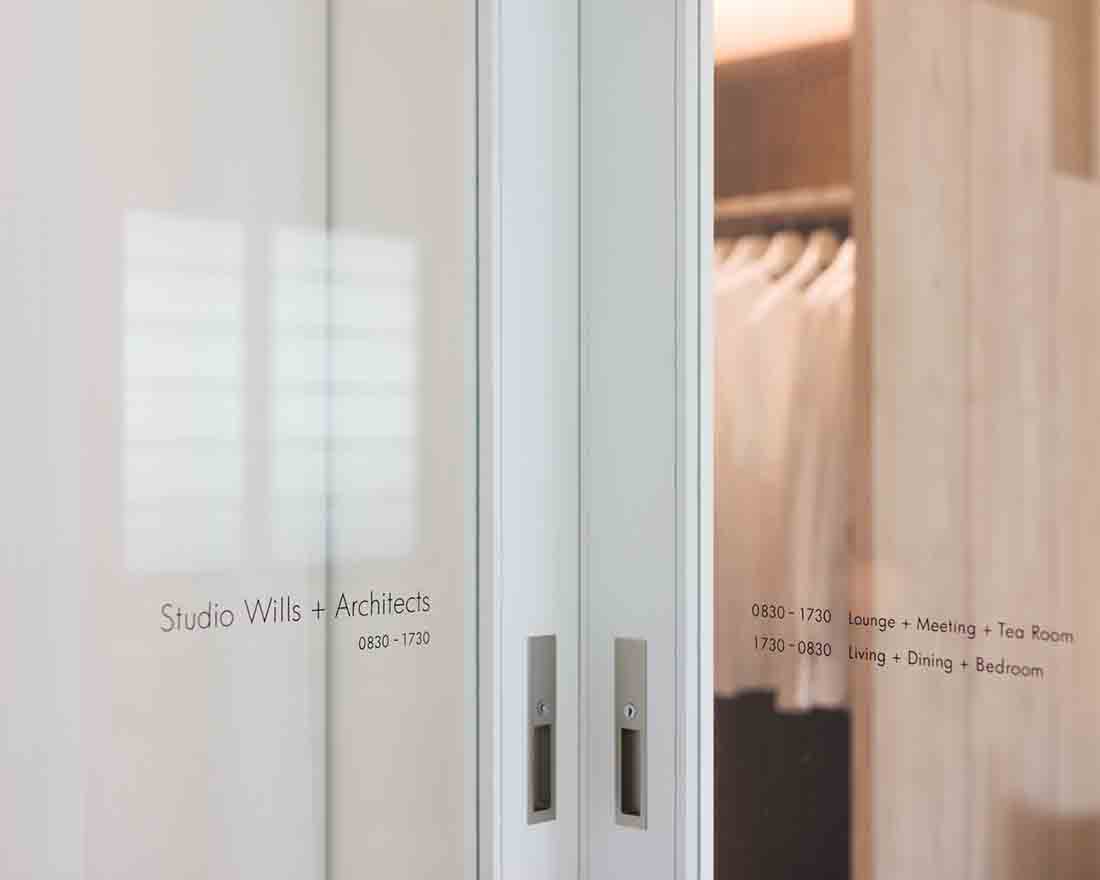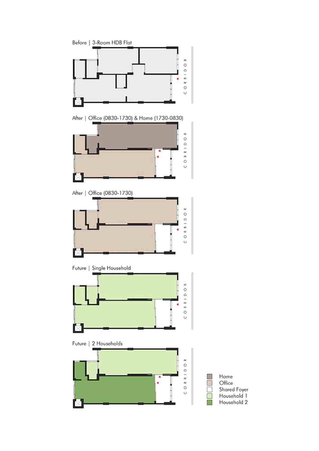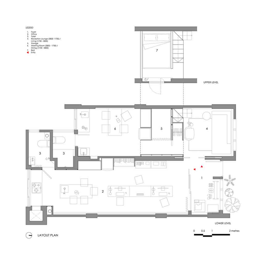 门厅的引入是走廊的第一个空间,在公有和私有领域之间形成了一个“缓冲区”,并设有两个单独的入口点,使内部空间可以独立运行。需要满足办公室和家庭的需求,导致在战略位置共同共享设施和节省空间的空间节省策略。
