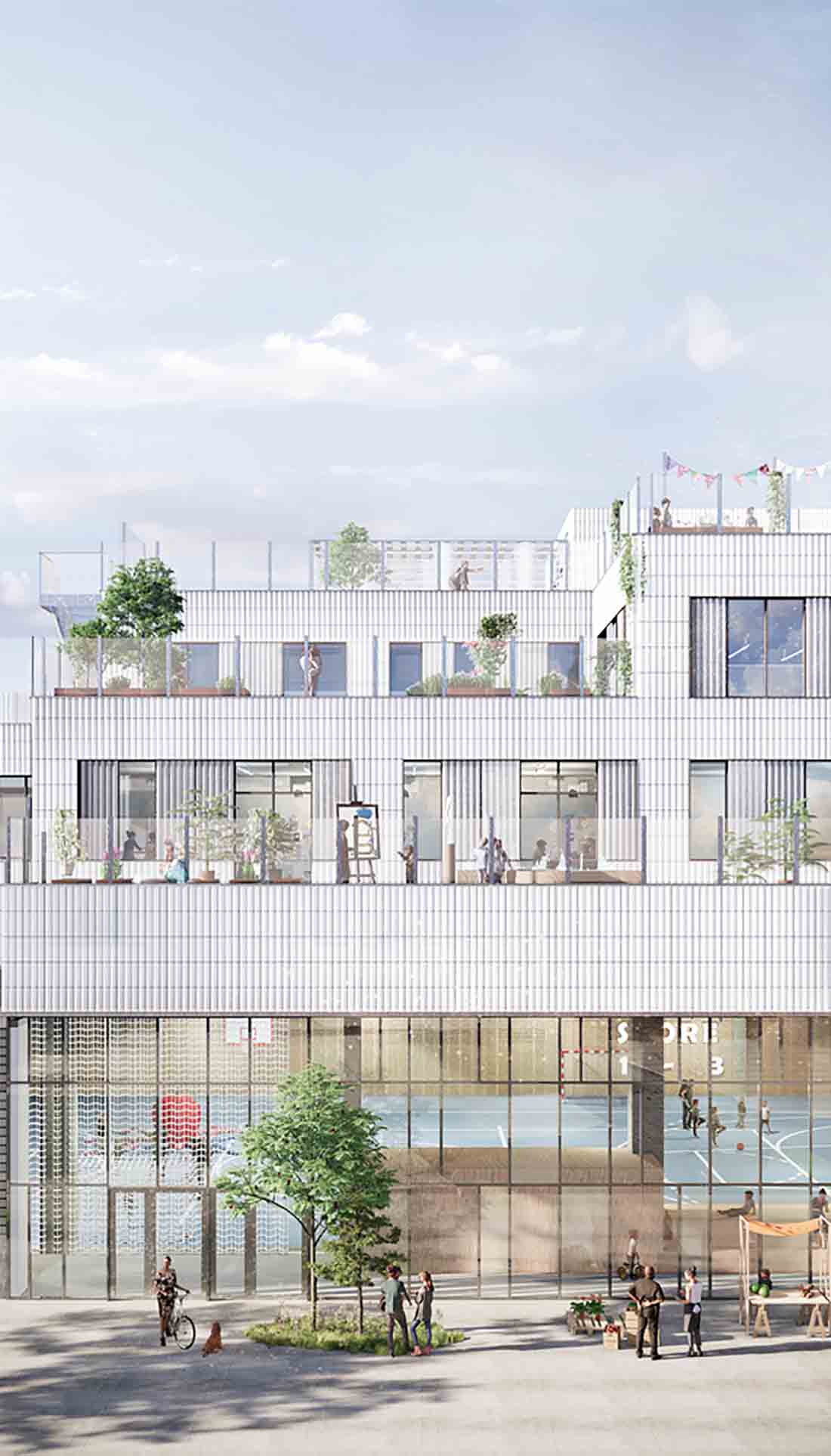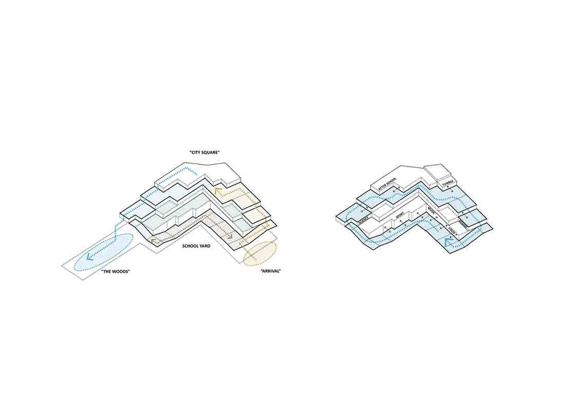 学校周围是几个室外露台,从最高点到肉类包装区的内部一直下降。它的白色屋顶设计有不同级别的娱乐空间,城市花园和游乐场。