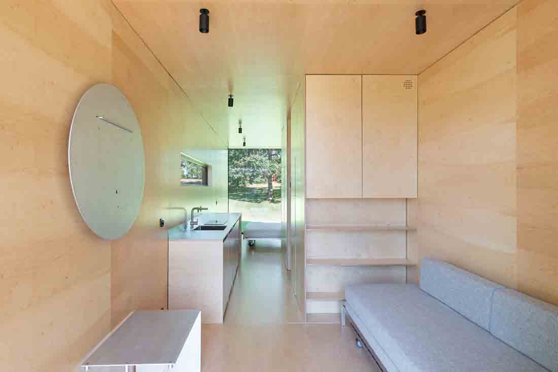 23平方米的房间设有两间双人卧室,一间客厅,一间厨房和一间浴室。可变形的家具使这种广泛的功能成为可能。