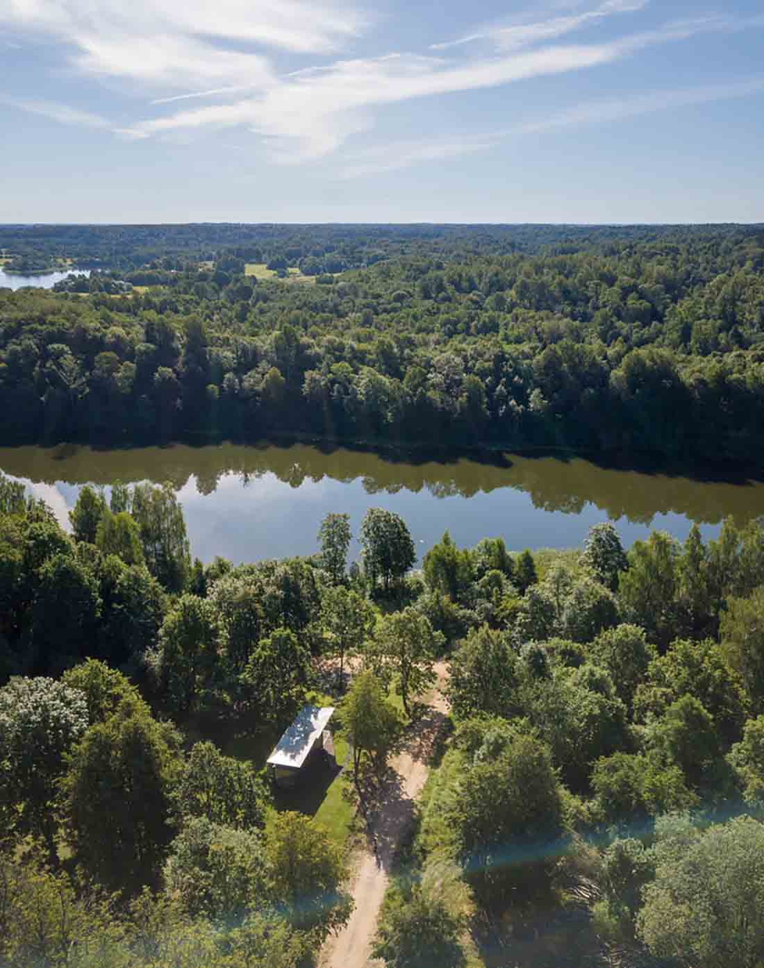 建筑和立面中使用的金属是无色的,在制造过程中留下了独特的图案。这样,所有模块化机舱的立面图形都会稍有不同。金属壳内部是温暖的天然胶合板饰面。第一个客舱以出色的自然环境,独特的地形和本地树木进入立陶宛的湖岛“苹果岛”。