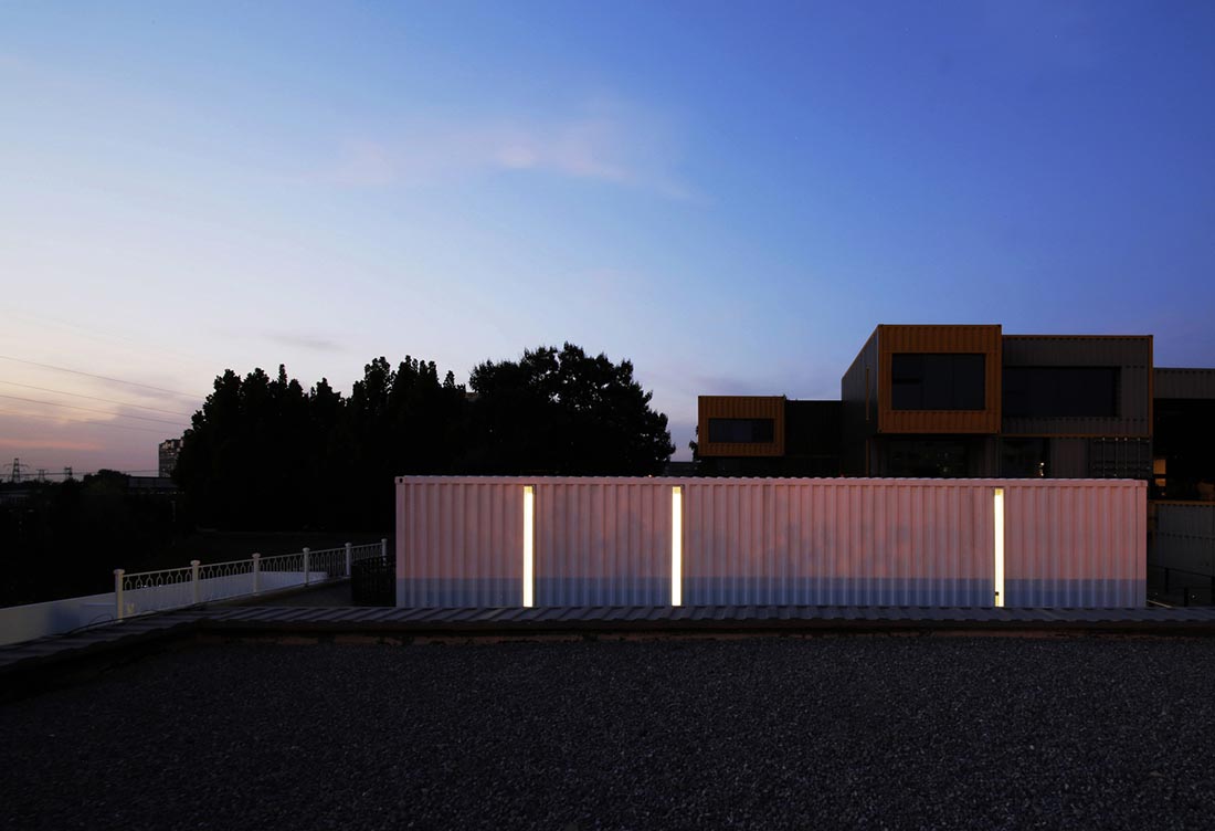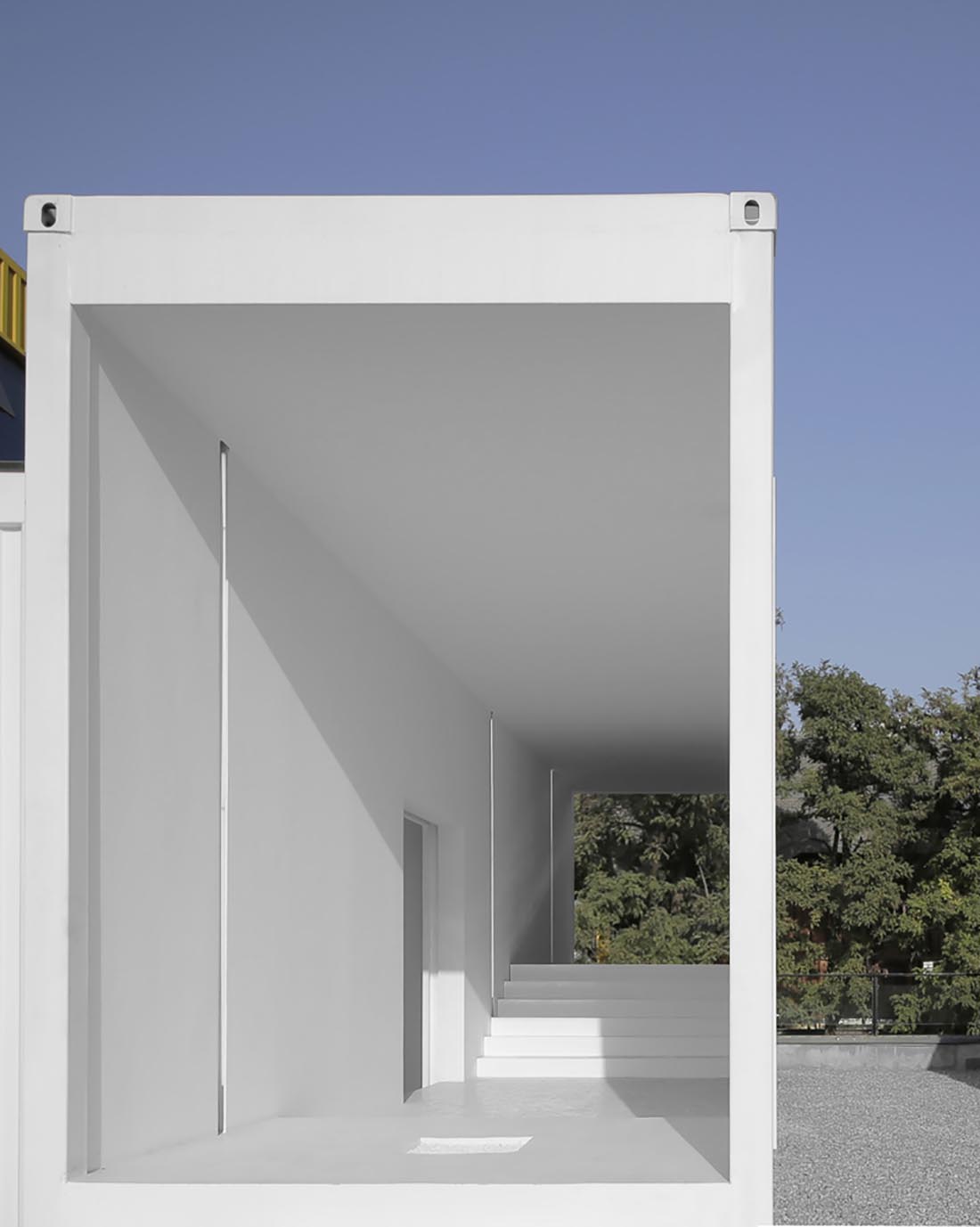 上文所提及的这个艺术中心是一个由彩色集装箱堆砌而成的建筑。建筑师在其中置入了一个白色的集装箱箱体,以其较短的尺寸来象征封闭空间的存在。同时,建筑师还设计了一个客房空间,来将这个封闭空间与外部的环境进行联通。这样一来,住户在这个集装箱空间内部所具有的视野是相当有限的,其只能通过面朝天空的一个开口与外部的环境进行交流沟通。而天光也恰好可以通过这个开口进入空间的内部,来提供充足的室内照明。