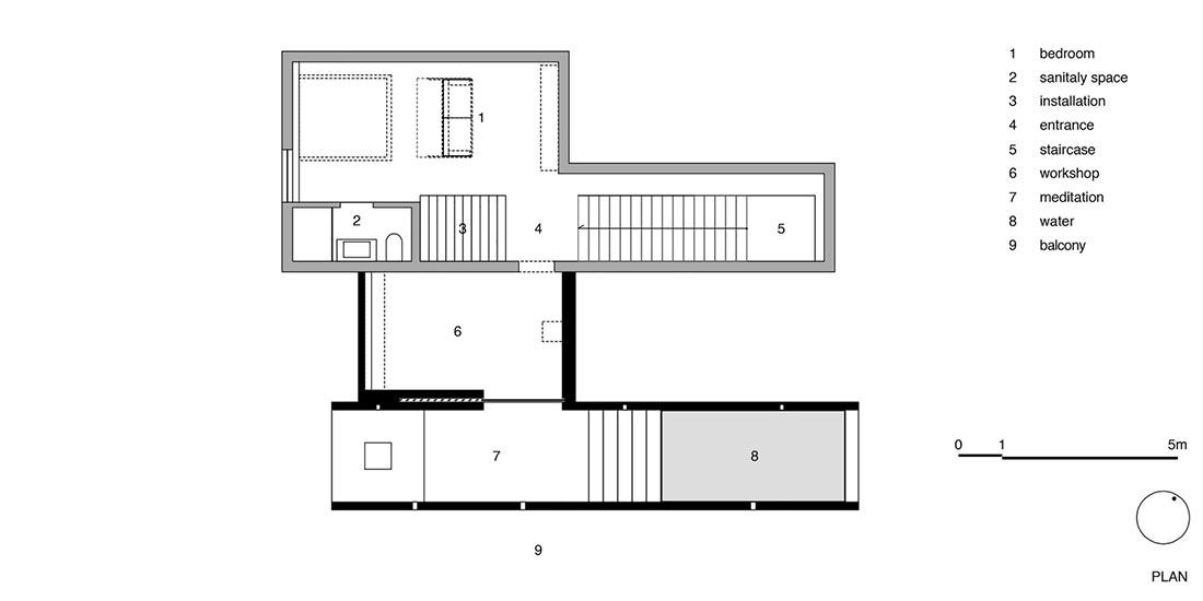 此外,一个名为“隧道”的较长集装箱将这个密闭空间与外部环境进行了连接。建筑师并没有在这个空间设计东西向的墙面,从而使内部的住户可以看到外部的绿植和景色。同时建筑师还在集装箱的南侧预留了一条缝隙,这样一来,外部的天光就可以垂直地射入空间的内部。建筑师在东侧小楼梯的顶部设计了一个水塘,这样一来,花园中的树木绿植就可以完美地反射在水塘之上,每当微风拂过,水面都会泛起粼粼波光,从而给人以独特的自然之感。