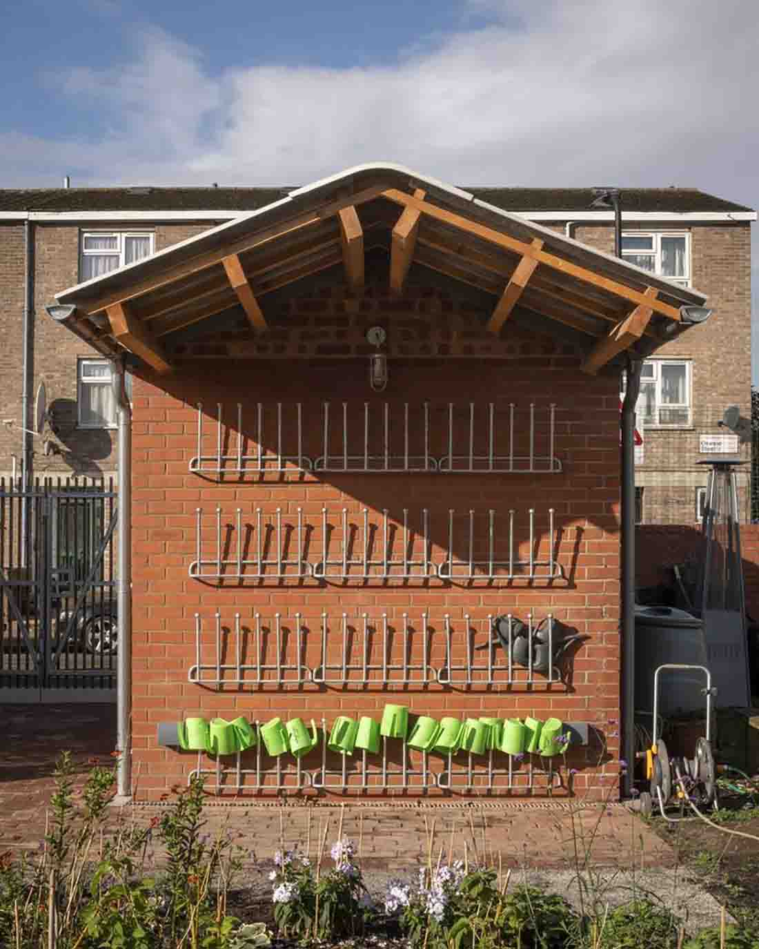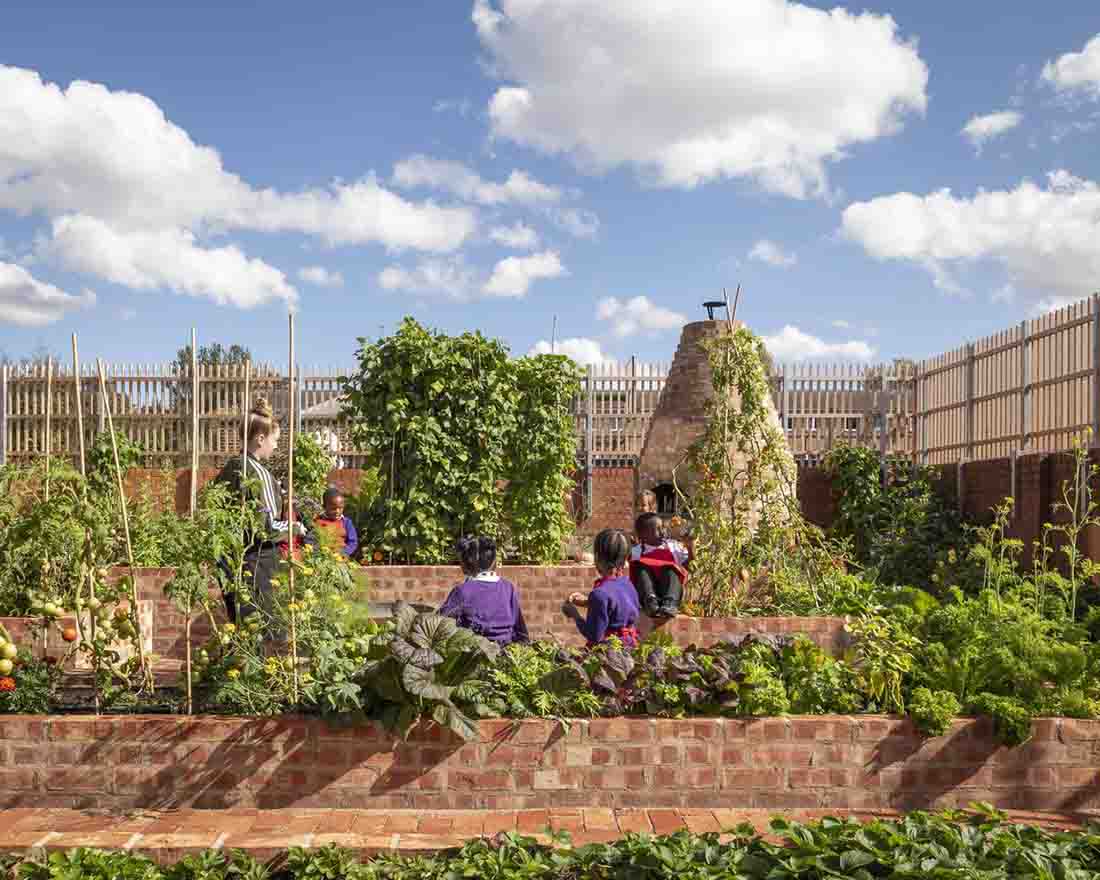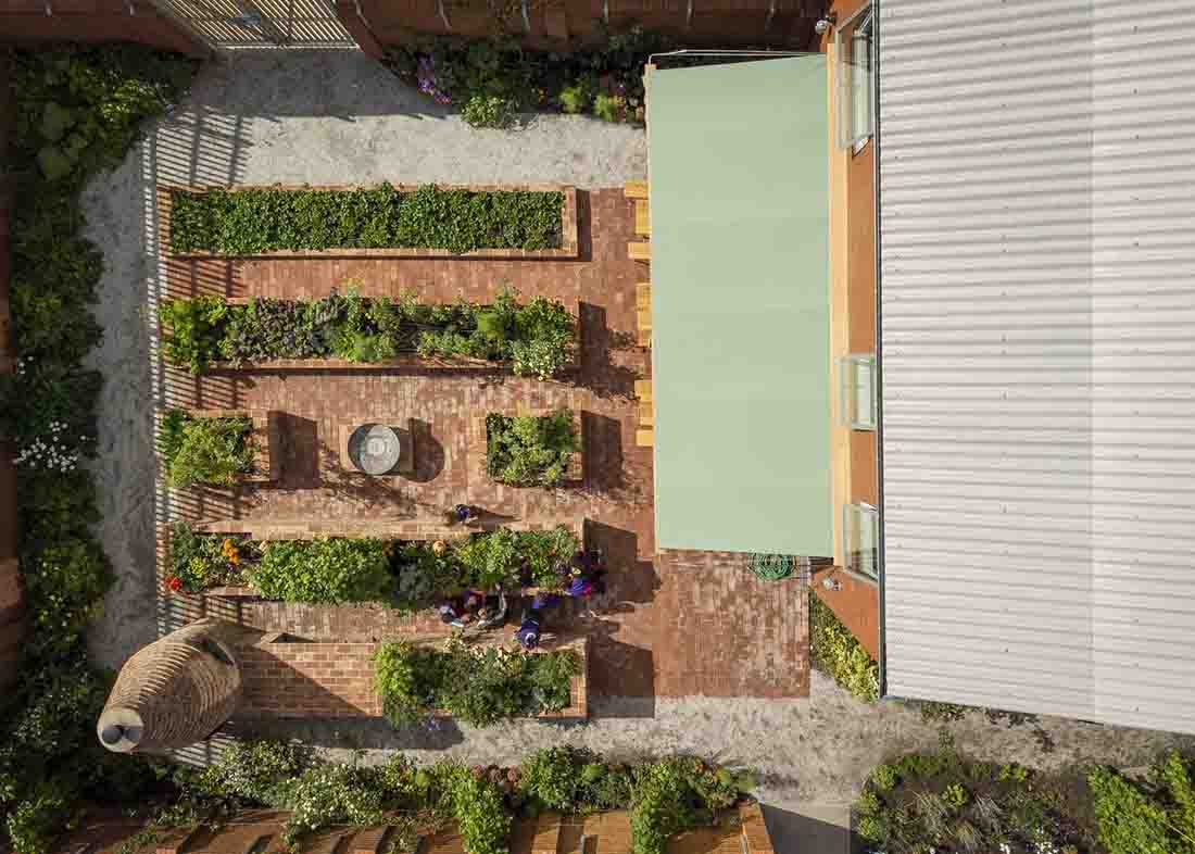 建筑师在新的装饰性厨房菜园和街道之间引入一道板条木门,形成二者间的视觉连通并作为直接进入共享菜园的入口。厨房菜园既是一处多产的种植空间,也是一处学习和娱乐空间,可以进行户外授课,或举办派对和宴会。这里有大型花坛、阳光露台、篝火坑和燃木披萨窑炉。为了让各年龄段的孩子和成年人都能参与到该项目中来,砖砌花坛的高度在一定范围内有所区别,可以作为备用座位在户外课程及露天用餐时使用。