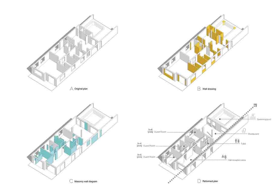 原建筑为当地人一家四口居住,因其对于居住条件要求不高,室内空间分区随意且不合理:建筑西北面开窗巨大,一来正对后海村街道非常嘈杂,二来下午西晒严重;建筑东南面正对沙滩,开窗太小,影响室内采光和视线;一层沿海平台原有通往二层的室外楼梯严重影响采光,并造成一层室外空间的流线混乱;建筑一层空间拥堵,没有设置开敞的公共空间;不适合酒店的功能需求。