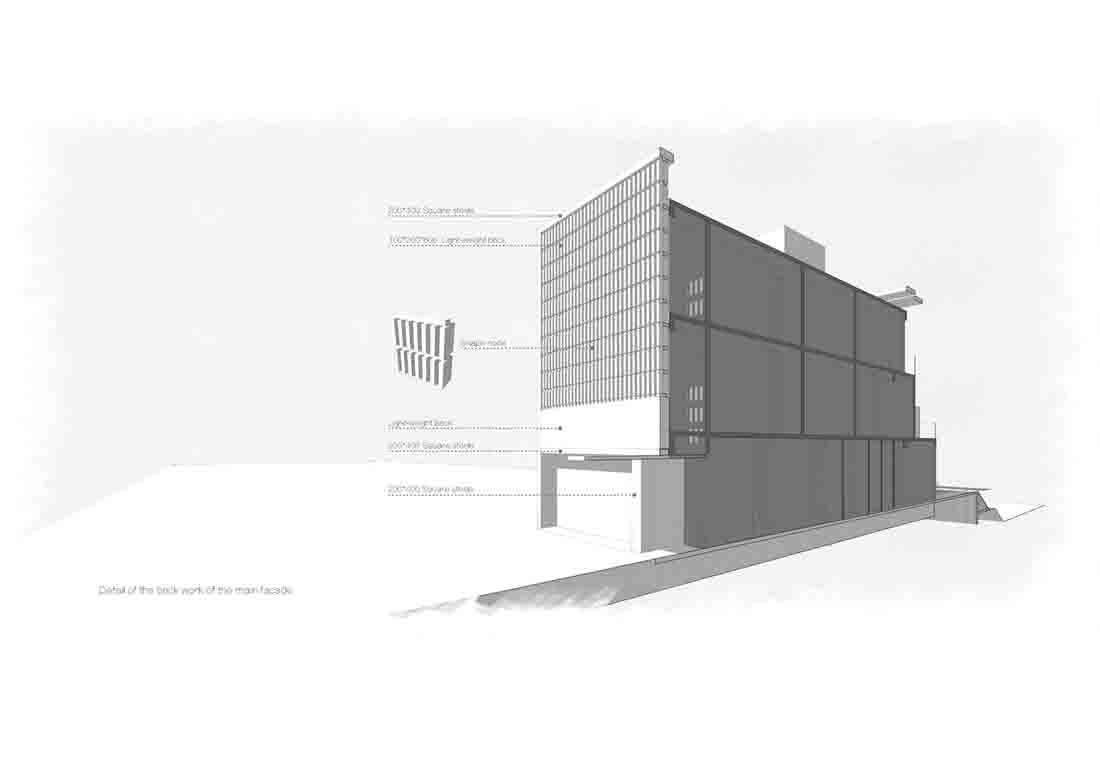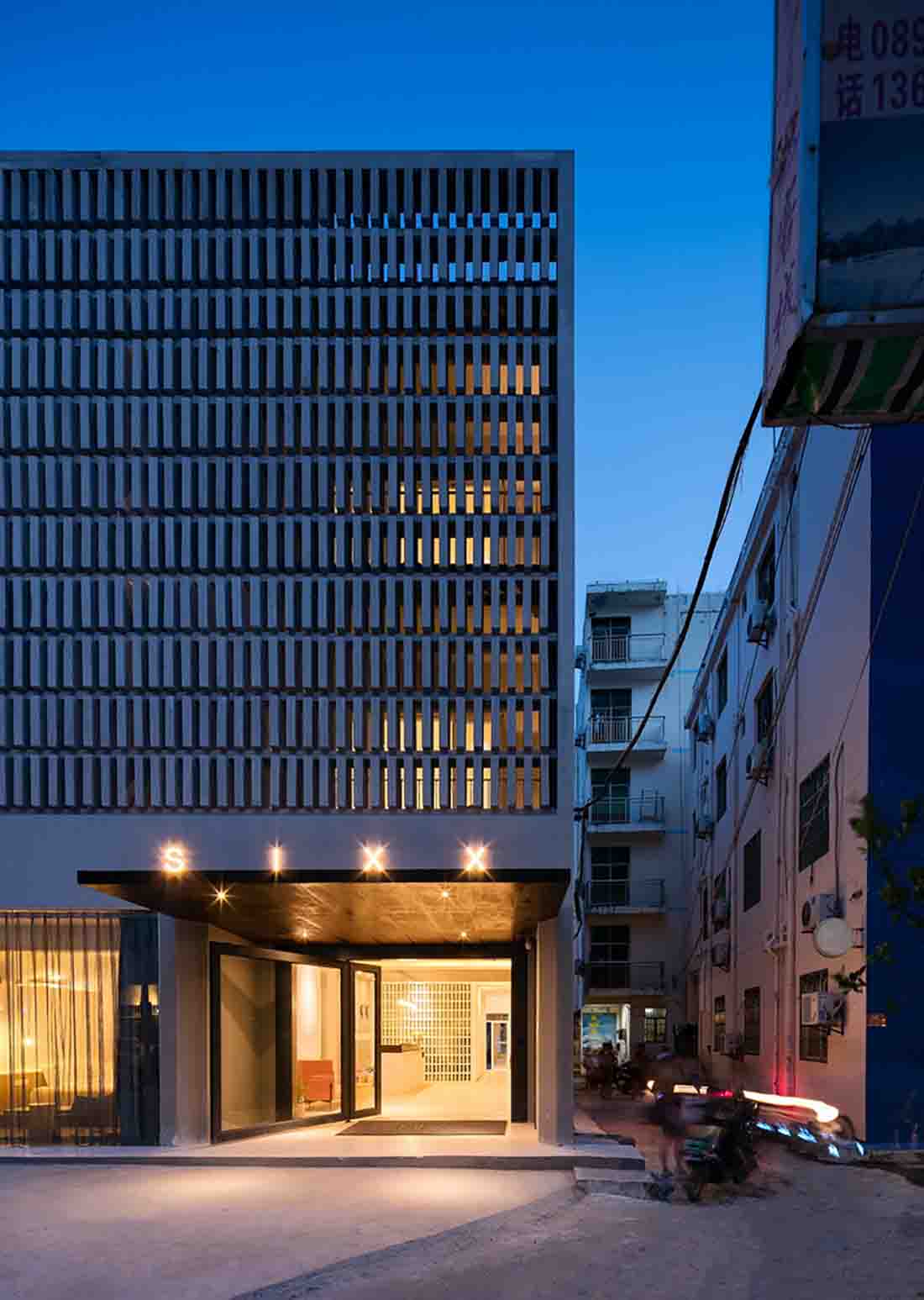 对于面朝繁华后海村街道的建筑主立面,我们将原有建筑的弧形阳台进行了拆除,建筑外形轮廓被还原成简洁的方形。另外,建筑师将550块水泥轻质砖用阵列堆栈的方式将建筑正立面完整的遮掩起来,这样既保证了沿街客房阳台的私密性,又解决了正立面下午西晒的问题,同时提升了整体建筑的气质。