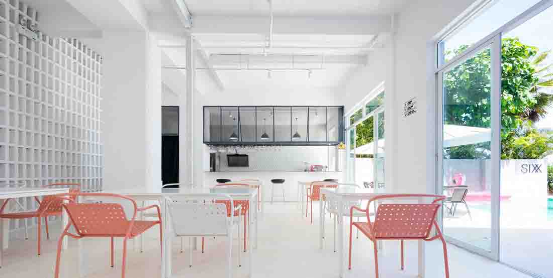 三亚·六甲酒店(SIXX Hotel)位于海南省三亚海棠区后海村,酒店门前正对的是后海村街道,酒店背后紧邻沙滩,从酒店建筑通往海滩距离10米不到。酒店原是一栋三层的当地渔民的自用住宅楼,建筑师通过结构加固、空间改造,将原有民宅改造成以冲浪为主题的度假酒店。
