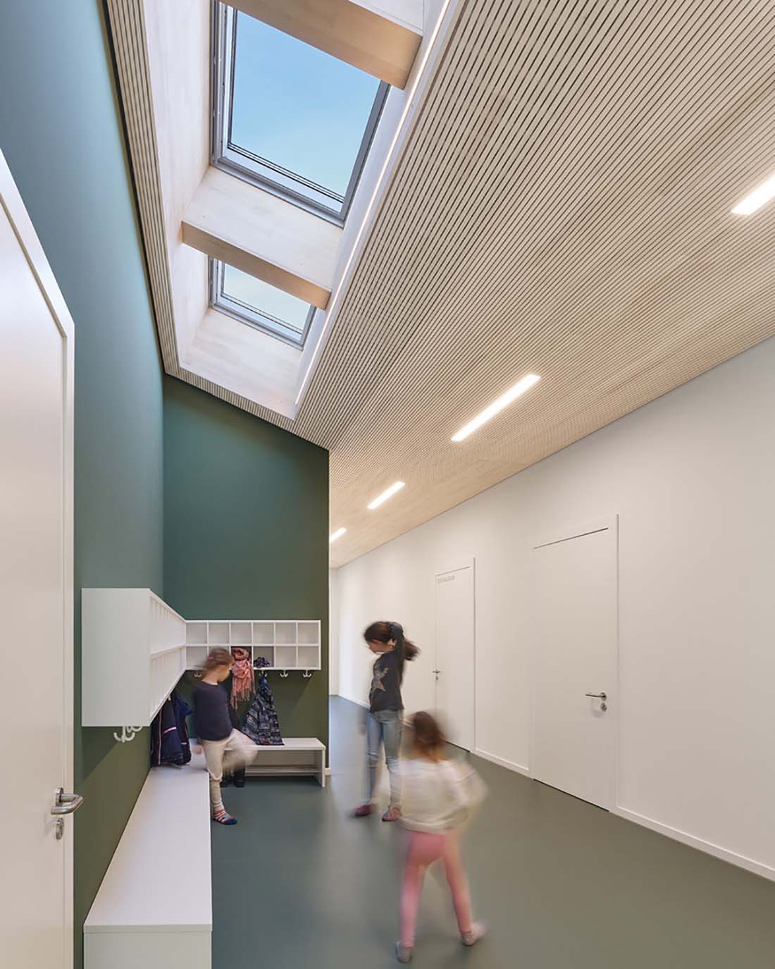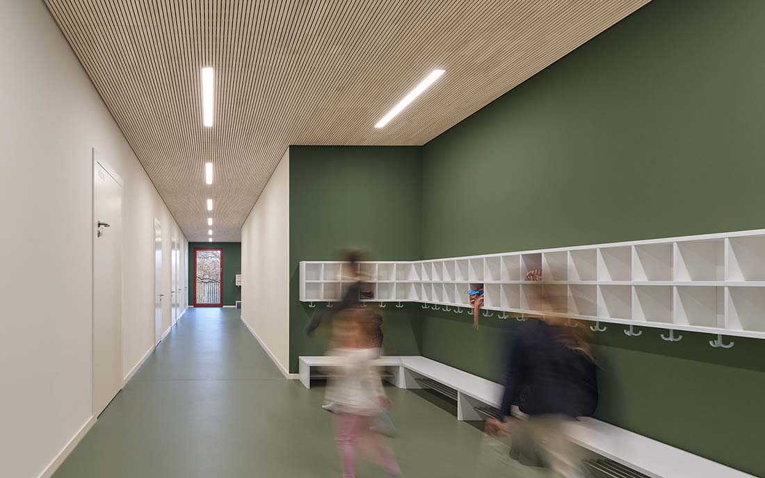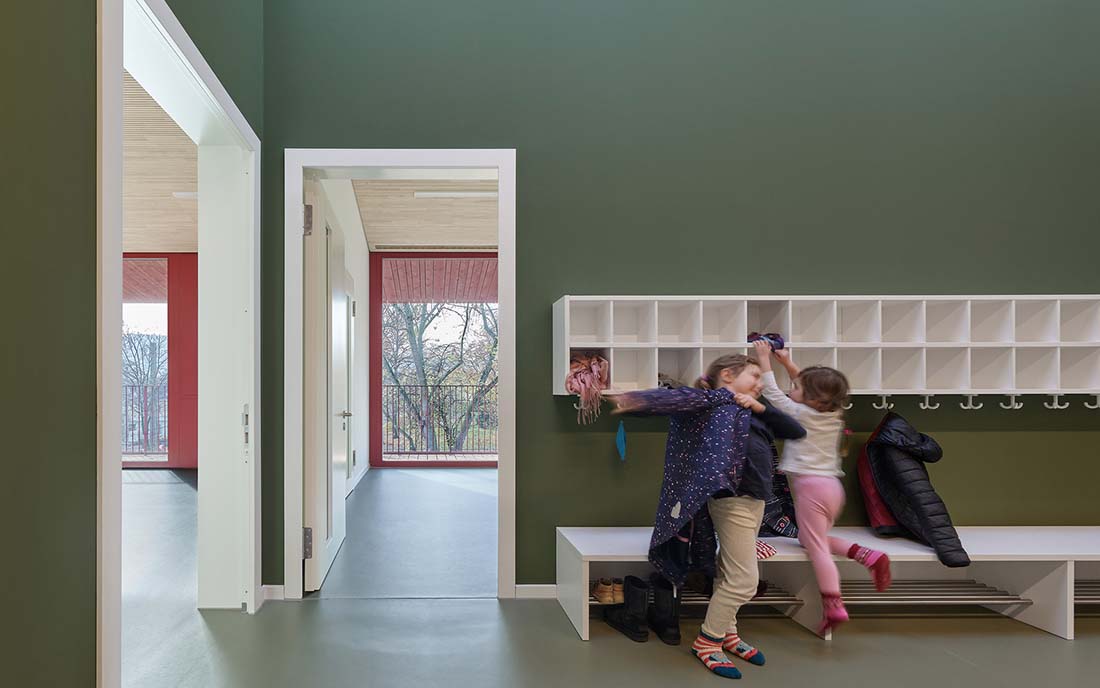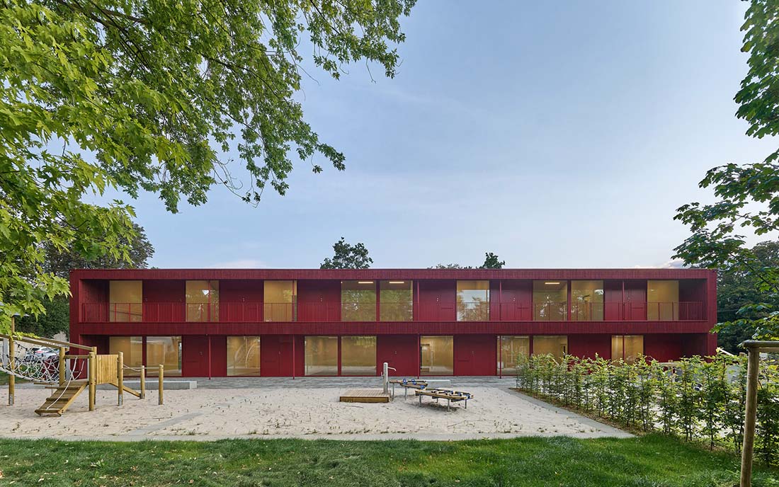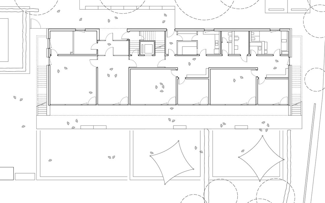 KiTa Parkstrasse的财产位于斯图加特东部的Berg文化公园附近。四人保育园的新两层楼建筑是绿色走廊的一部分,绿色建筑的走廊上有历史悠久的树木。建筑物的位置,建筑物尺寸,建筑物和材料是根据房屋的特殊特性而定的:当地建筑物规范指定建筑物深度为12米。它的位置和方向是施工线和从西向东倾斜的地形的结果。现有地下掩体的基础使轻质木材结构成为唯一的选择。