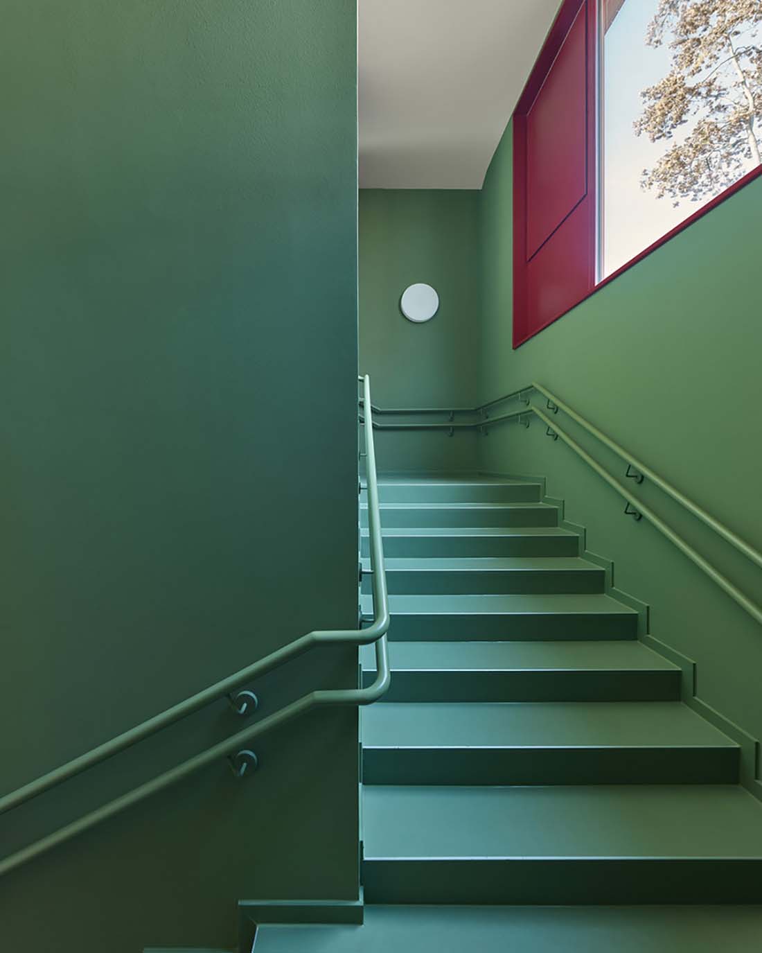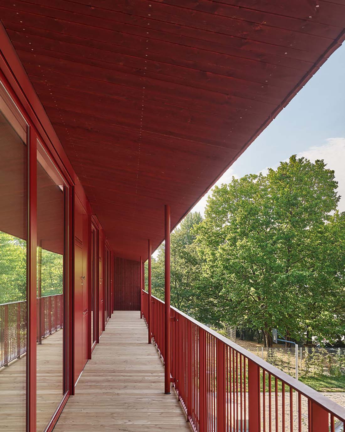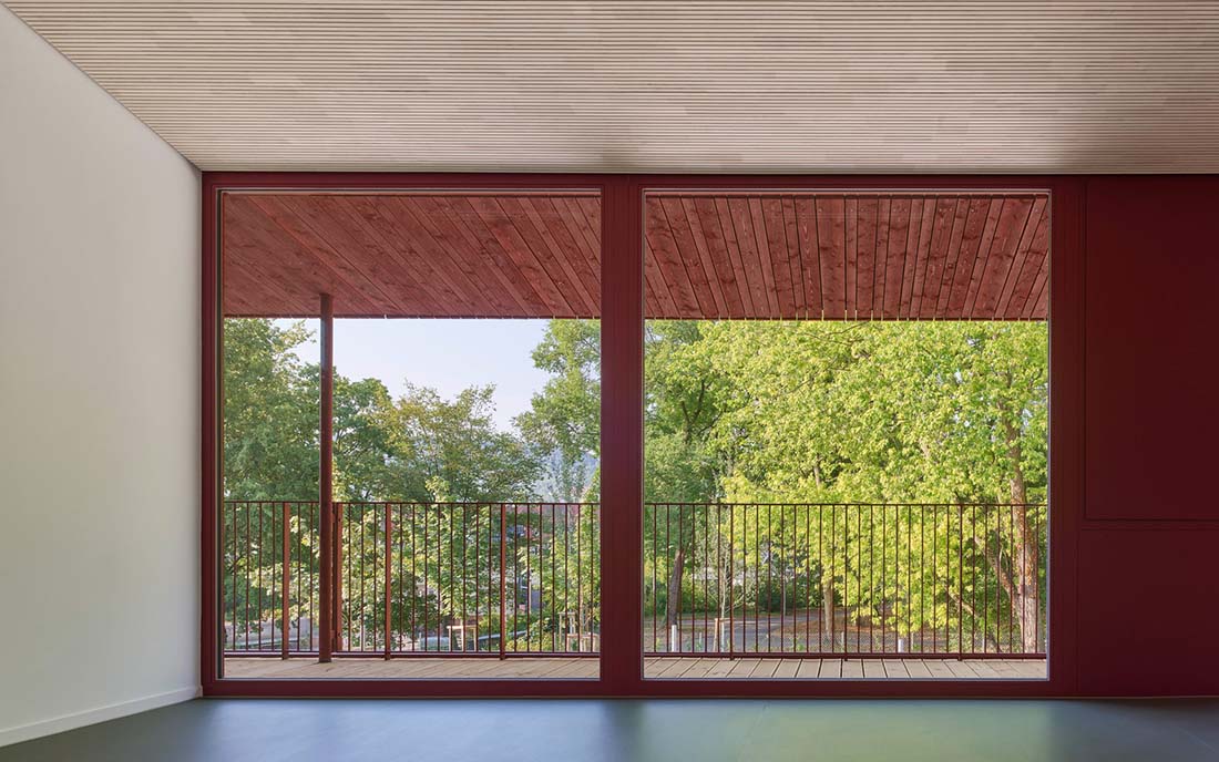 KiTa Parkstrasse的财产位于斯图加特东部的Berg文化公园附近。四人保育园的新两层楼建筑是绿色走廊的一部分,绿色建筑的走廊上有历史悠久的树木。建筑物的位置,建筑物尺寸,建筑物和材料是根据房屋的特殊特性而定的:当地建筑物规范指定建筑物深度为12米。它的位置和方向是施工线和从西向东倾斜的地形的结果。现有地下掩体的基础使轻质木材结构成为唯一的选择。