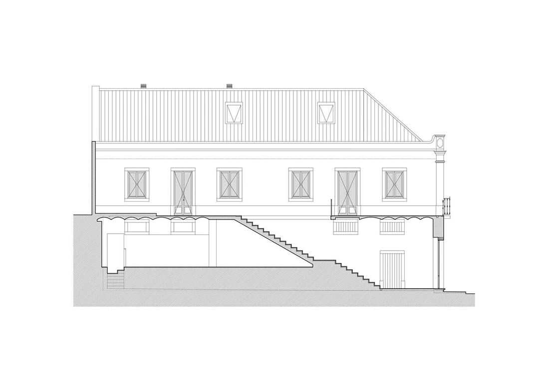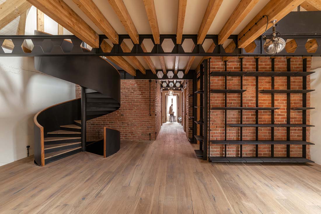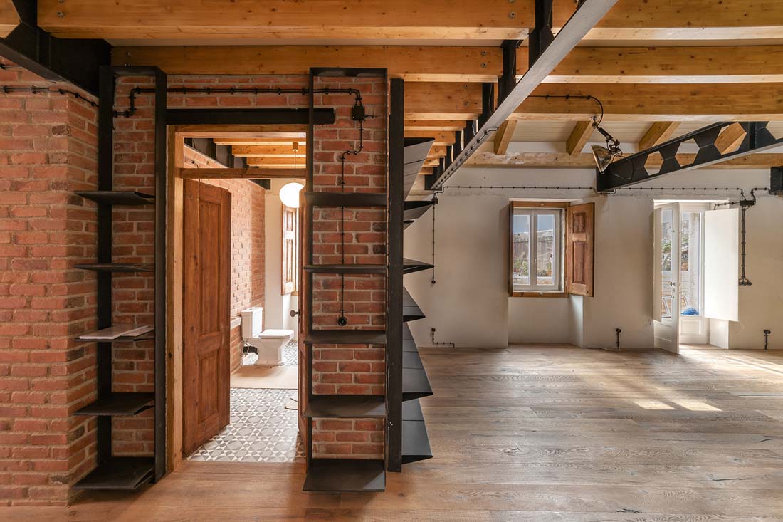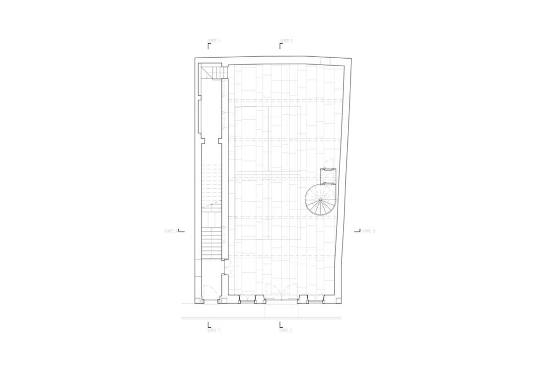 干预是在一栋两层楼的建筑中,其中一楼是以前的葡萄酒仓库,楼上是两间公寓。现有结构的严重破旧状态导致必须彻底拆除内部和屋顶。