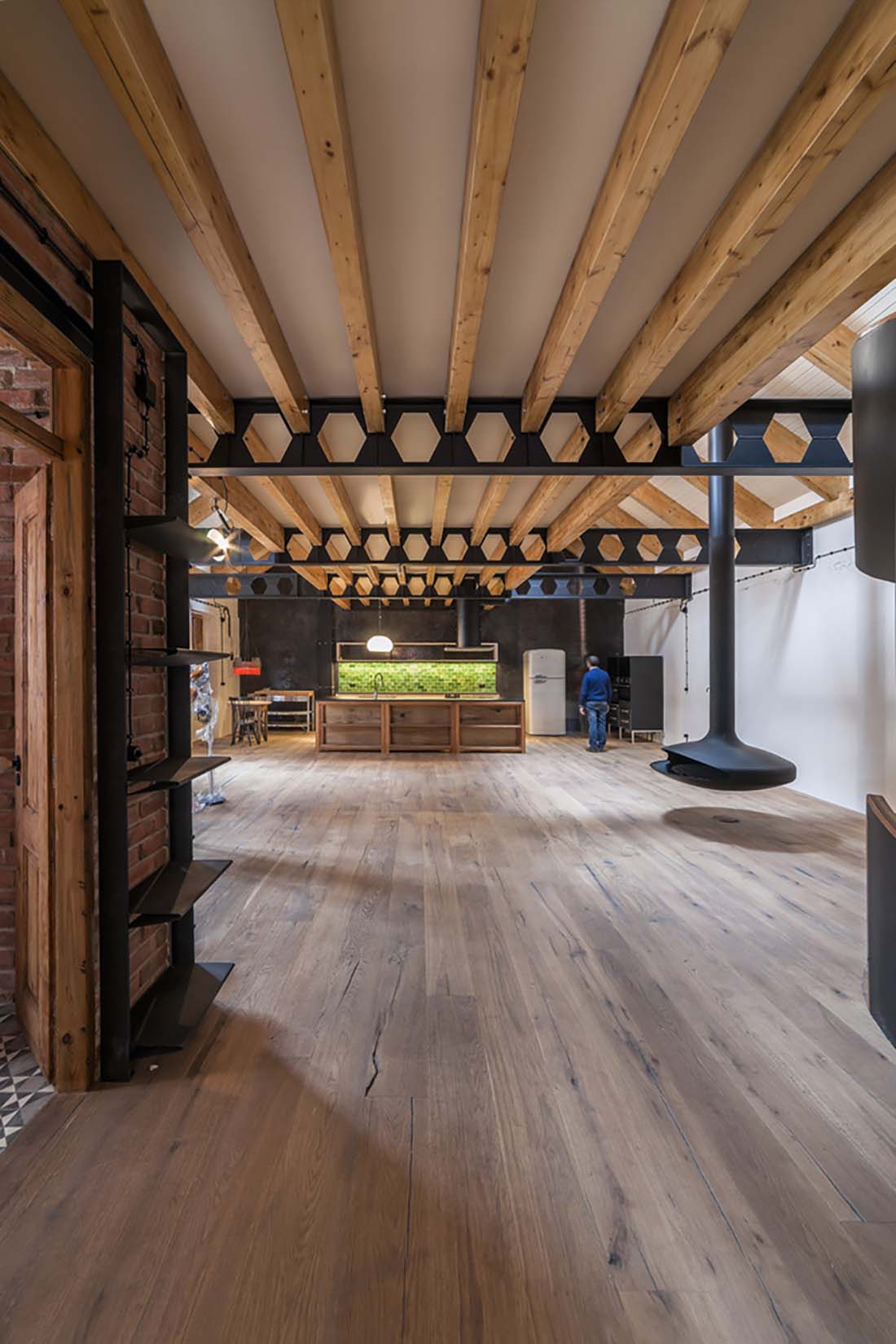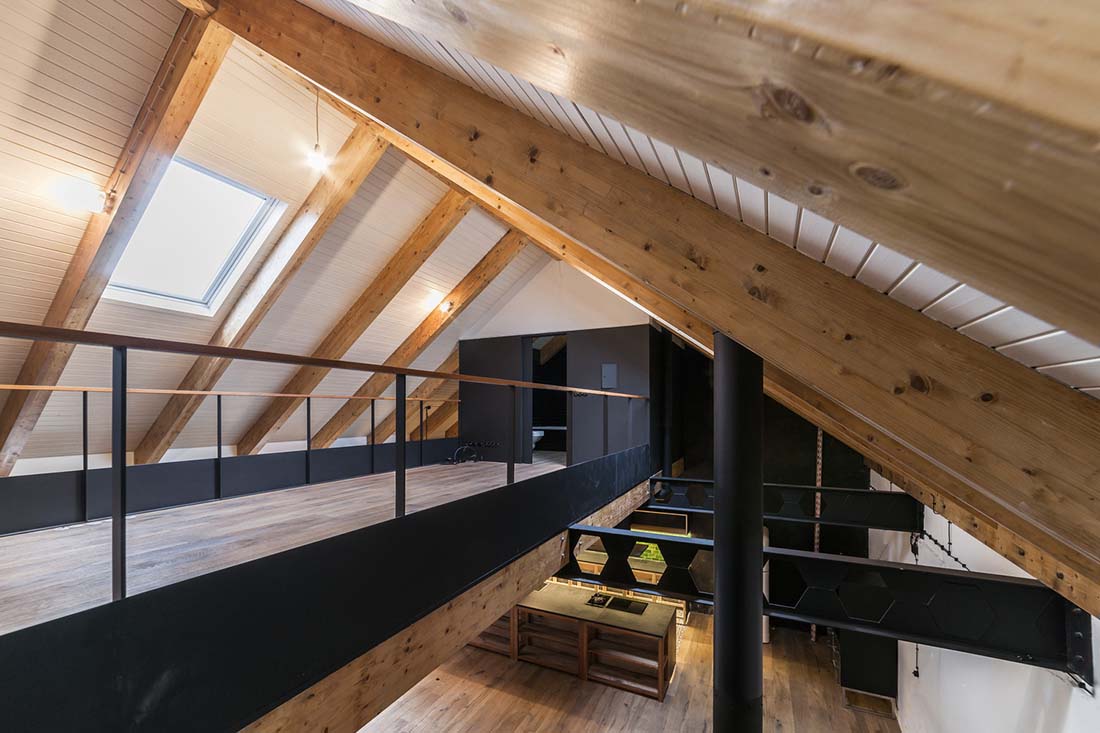 在重建过程中,复制了原有的屋顶以及分隔地板,但是它们的结构有所不同–屋顶的木梁可以完全腾出屋顶下方的空间,而混凝土地板分隔楼层。充分利用屋顶上的空隙并移除一楼的分隔墙(除了一些封闭空间,例如一间卧室,洗衣区和两个浴室),这为夹层楼板的铺装提供了足够的空间。直接在屋顶的山脊下方,因此可以全面读取空间。