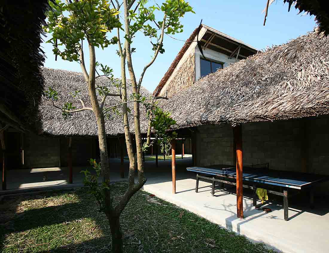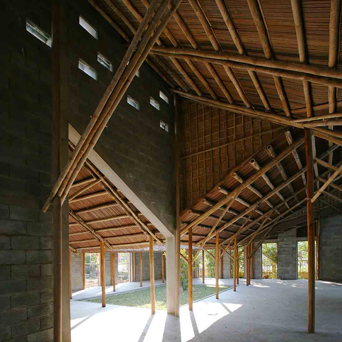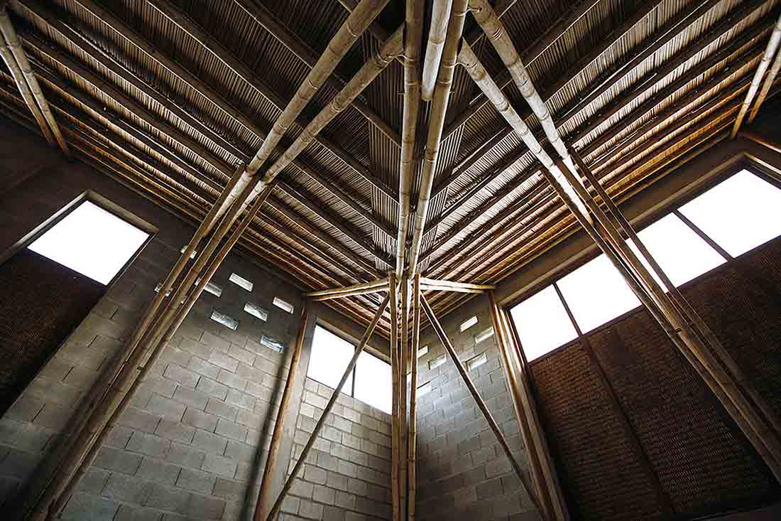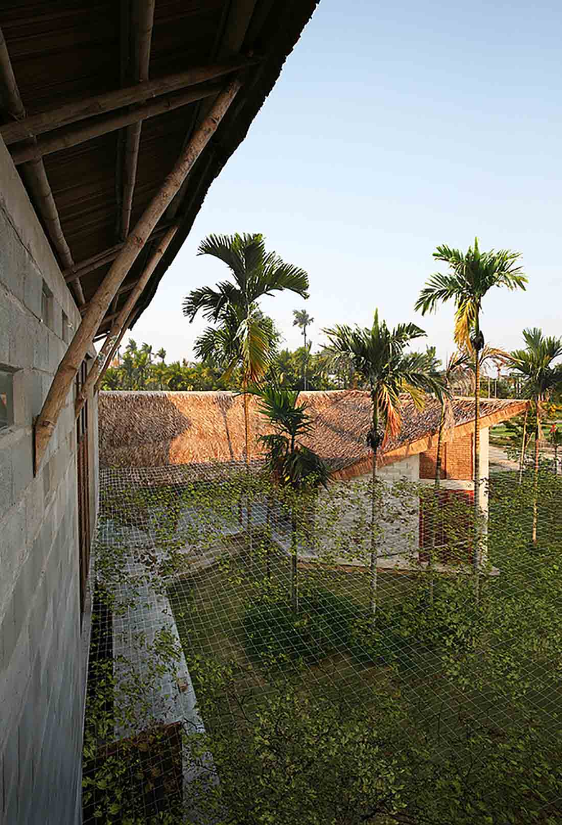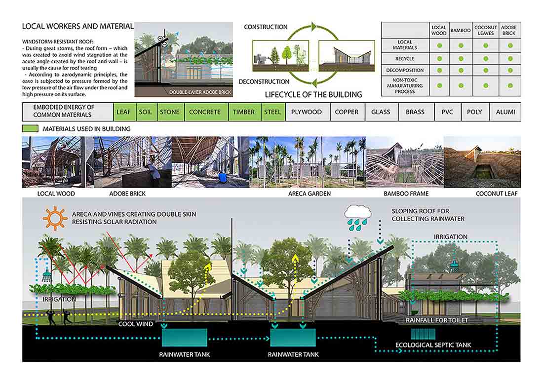 建筑的结构很简单,本地资源和材料的有效的被利用。植物藤悬跨槟榔园,连同椰子树叶屋顶,可以大大减少太阳辐射,并提供遮荫。强大的木柱和竹框架支撑的大型倾斜式屋顶,雨水收集可以用于灌溉和日常活动。周围的墙壁,采用双层砖土坯,创建气垫和绝缘层。这种结构可以帮助建筑物抵御风暴。