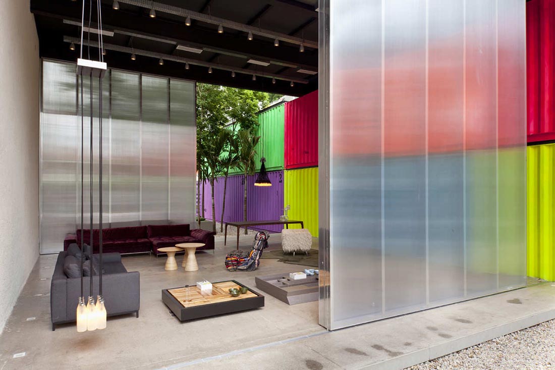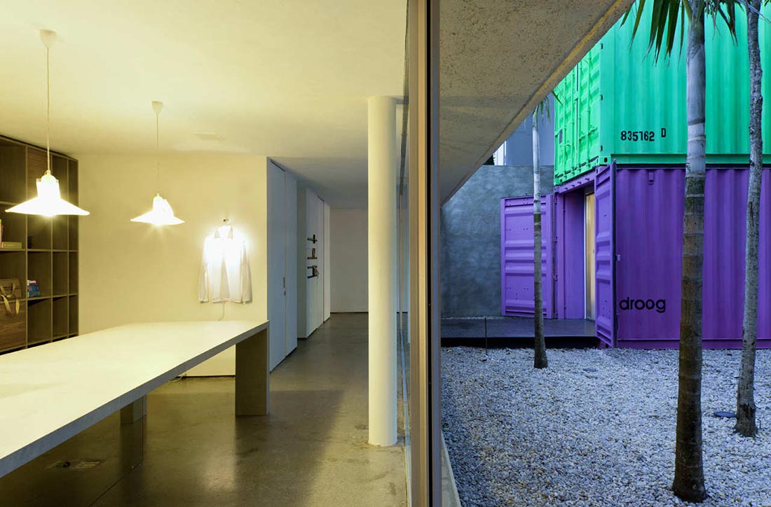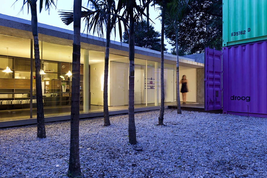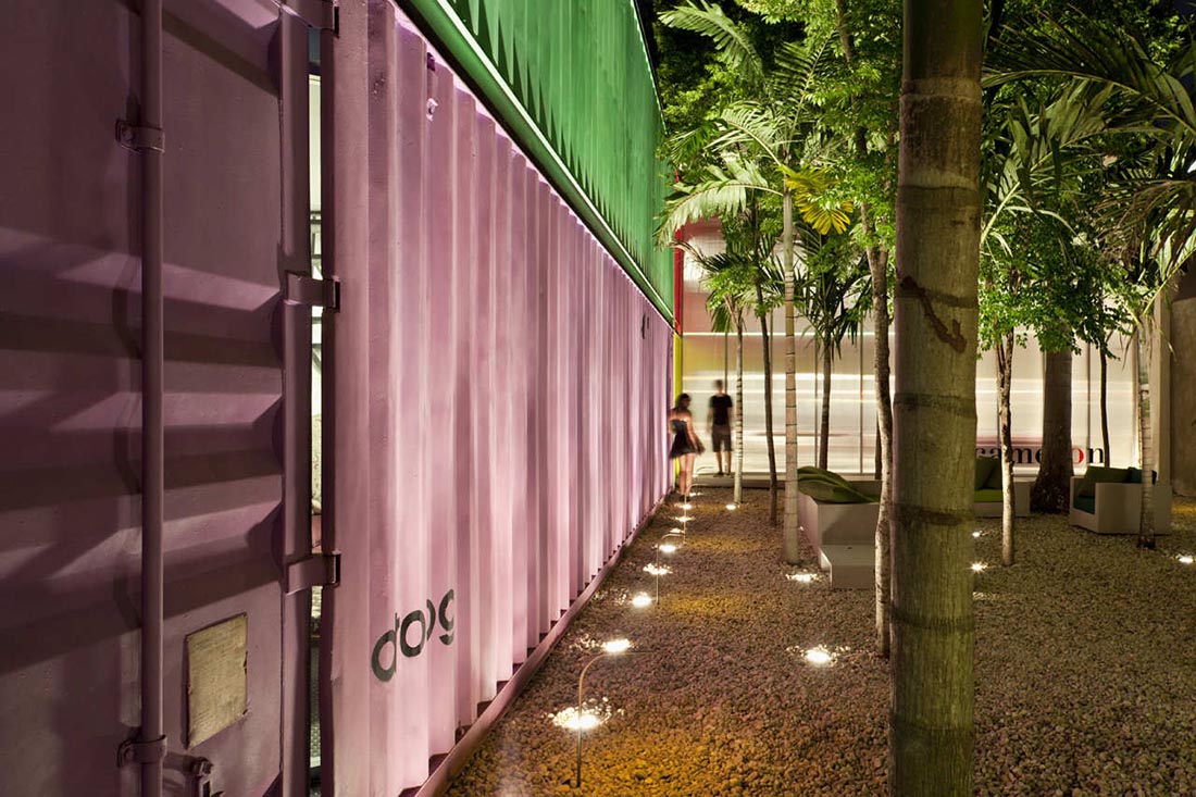 当时的想法是用废弃的容器,重新组成一个现成的对象。该项目利用废弃容器组织了两条通道,同时其内部空间发挥线性的优势,和一个双层高度的体量依附于它,对比立方体体积。巨大的聚碳酸酯推拉门连接商店与城市的一个内花园。
