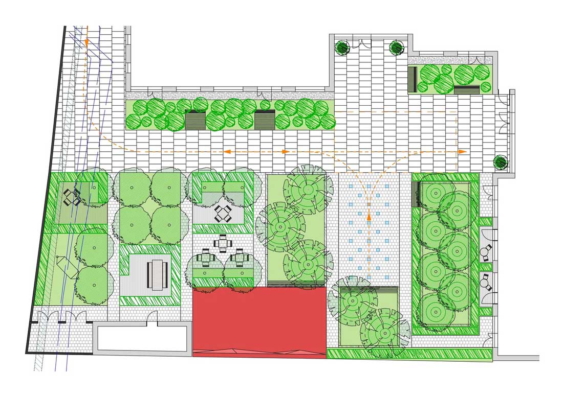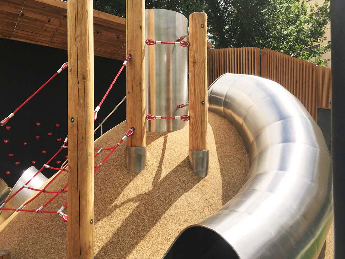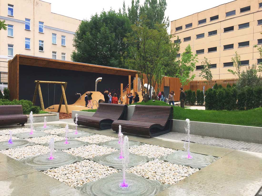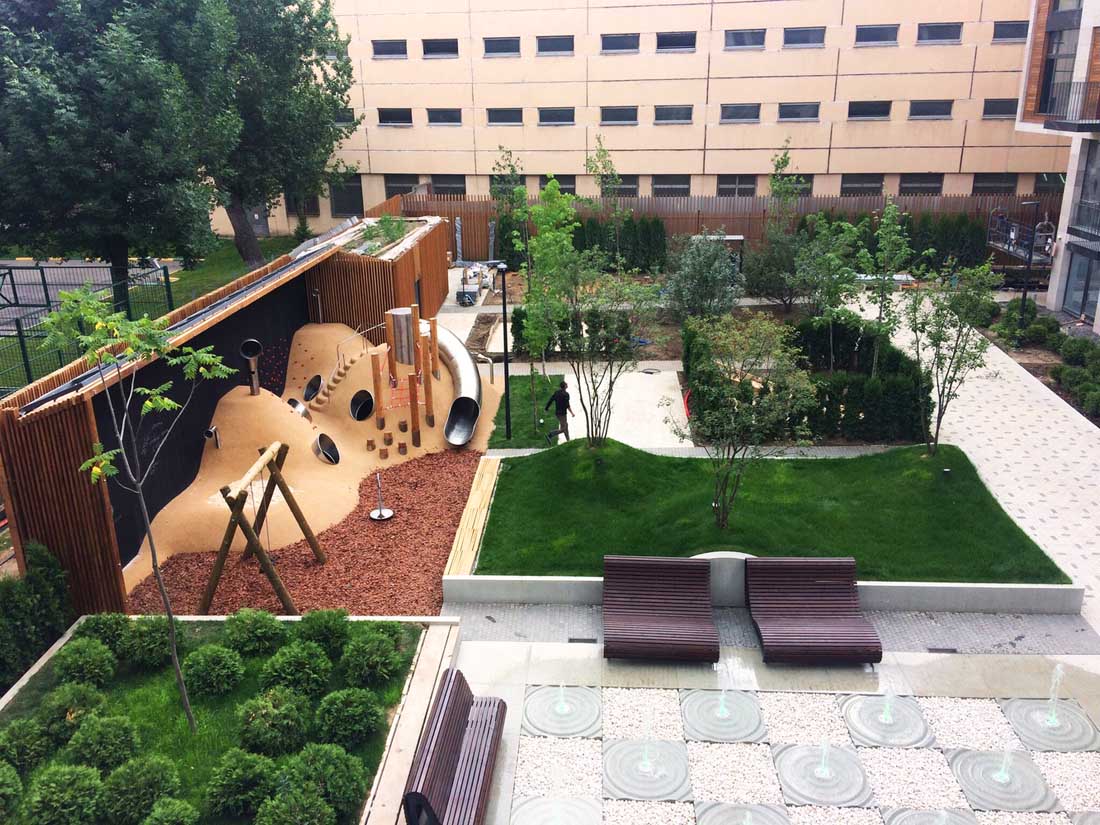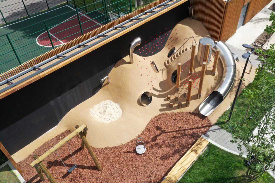 100平方米现场的常规游乐设备。是:一个秋千、一个小转盘和一个沙坑。考虑到孩子们的感知,则可以在同一空间中创建整个世界。