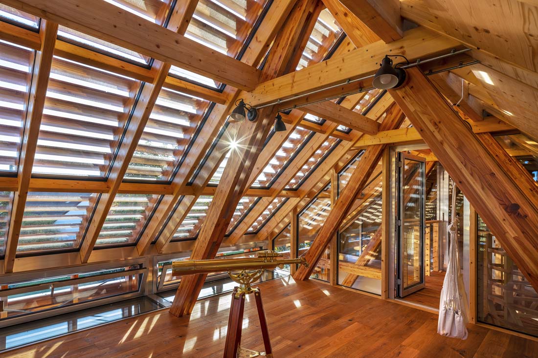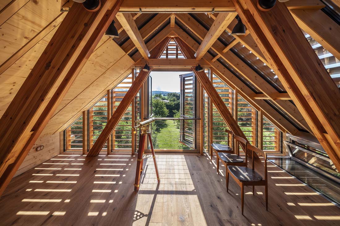 另一方面,在旧阁楼中的天文台是昏暗的空间,可提供很大的私密性,因为光线只能通过狭窄的窗户进入。但是,屋顶的一部分可以在夜间移动,并且可以安静地观察星星而不会受到干扰。