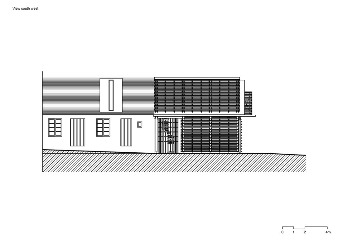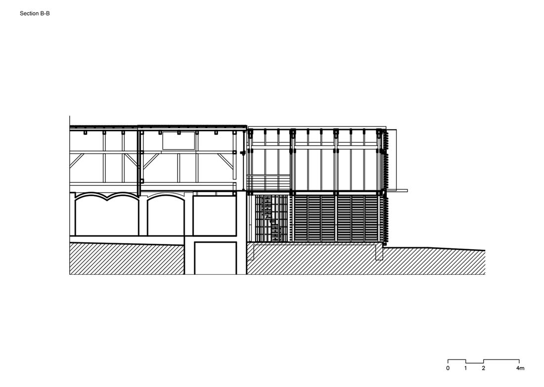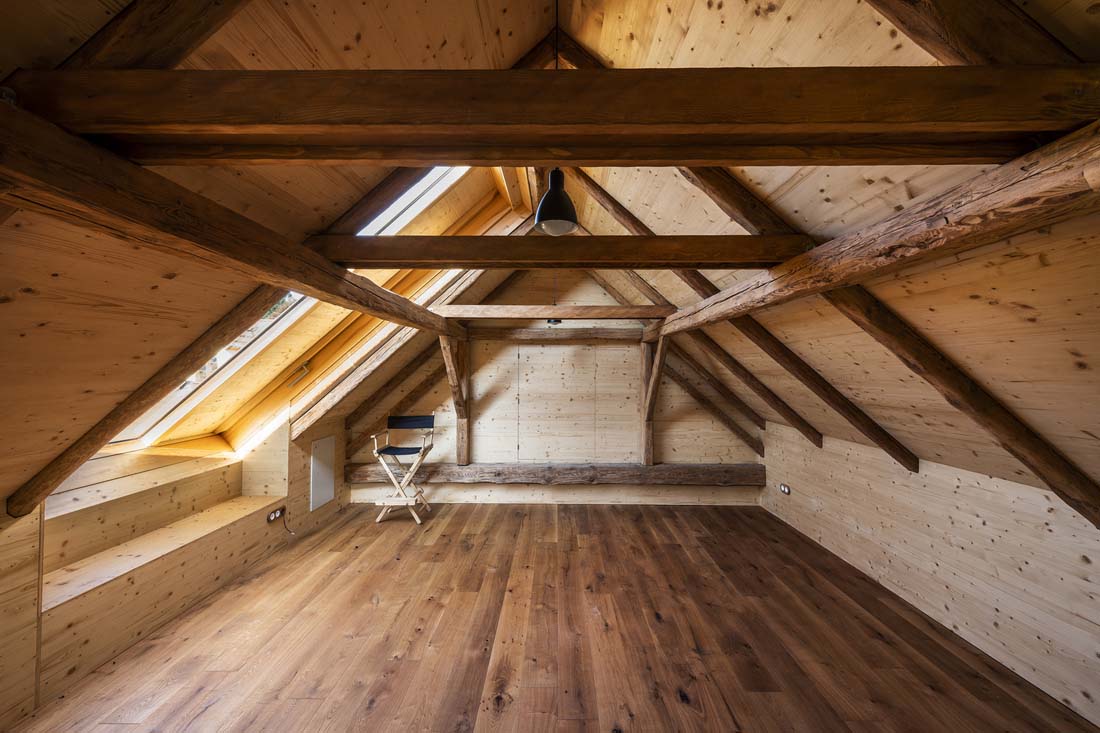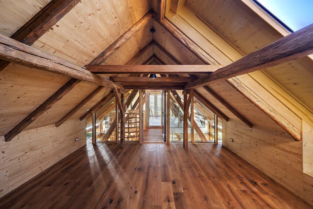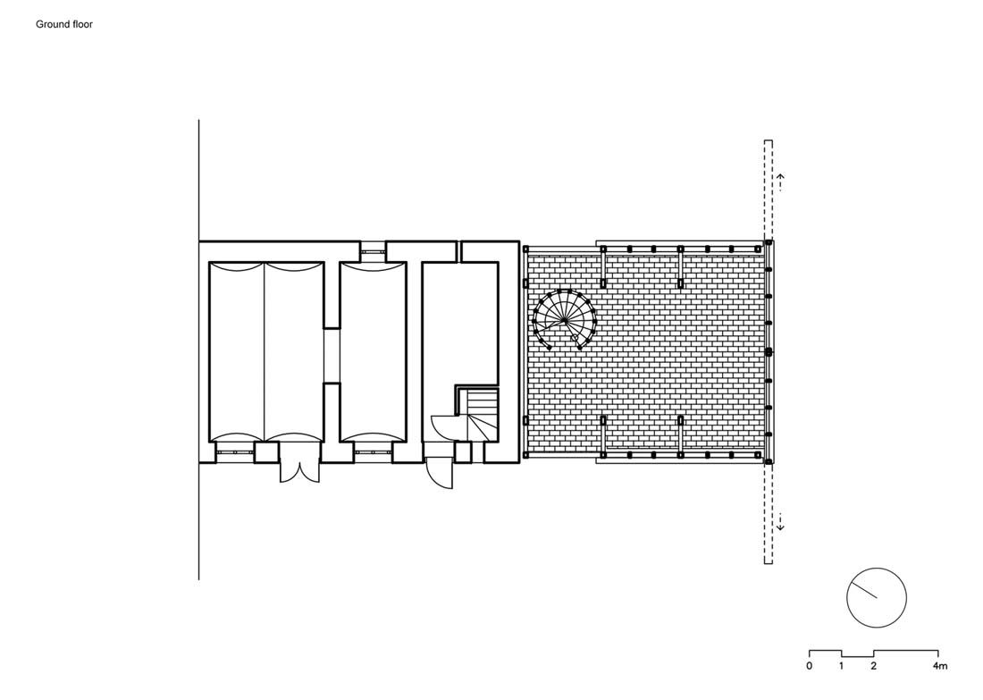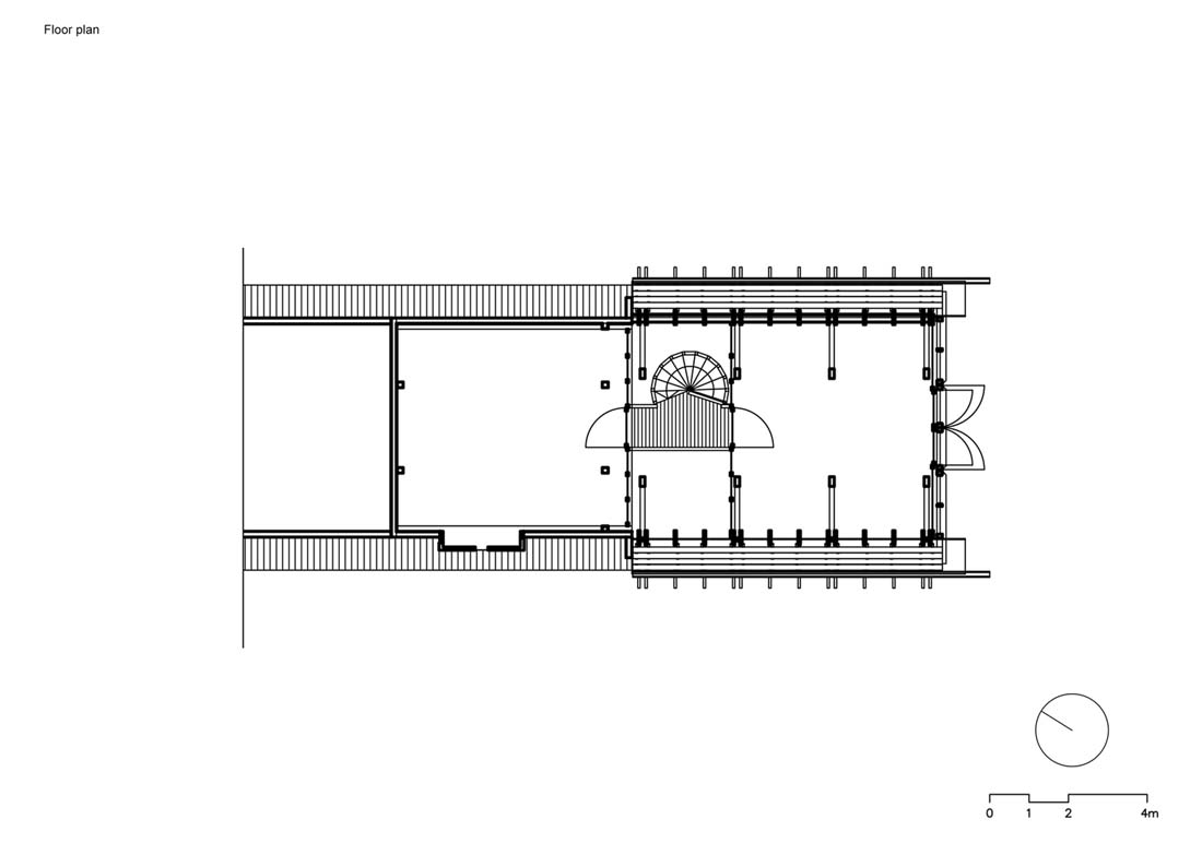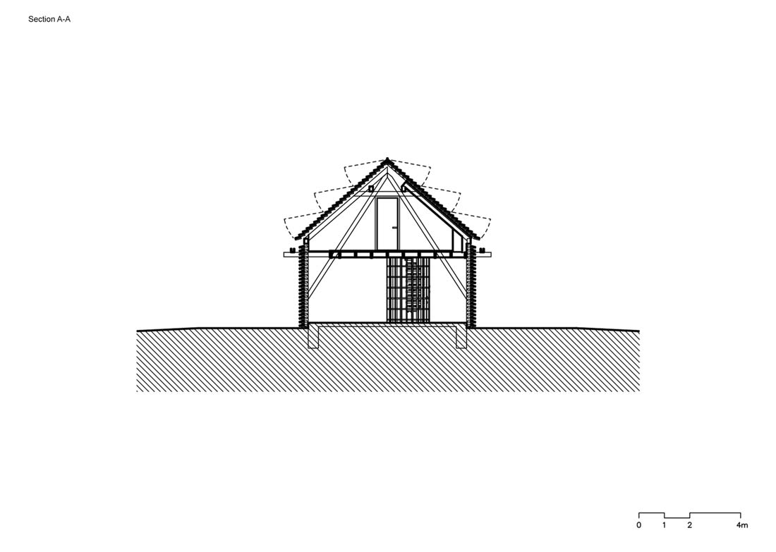 一楼用作柴火的存放处。穿过后,您可以沿着螺旋楼梯爬上连接旧阁楼和新阁楼的桥梁。每个空间都封闭一个房间。旧的阁楼充当天文台,新的阁楼充当瞭望台。新阁楼的木板组装外部阴影使人们可以窥视并观察周围的景观。