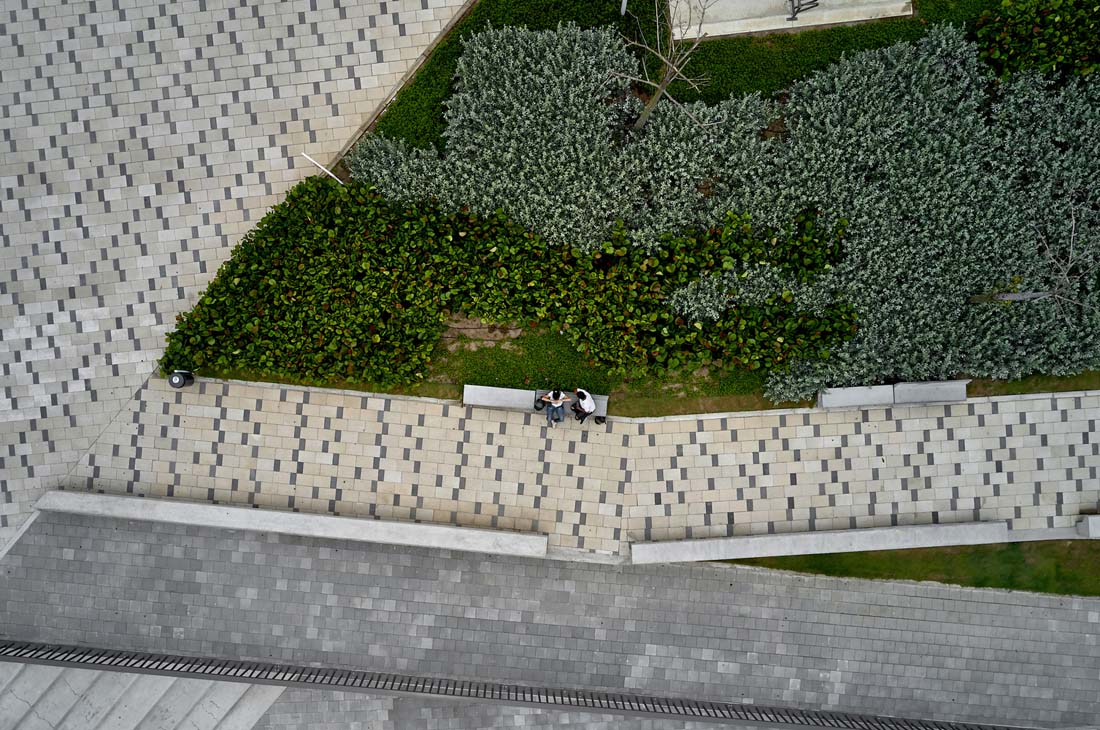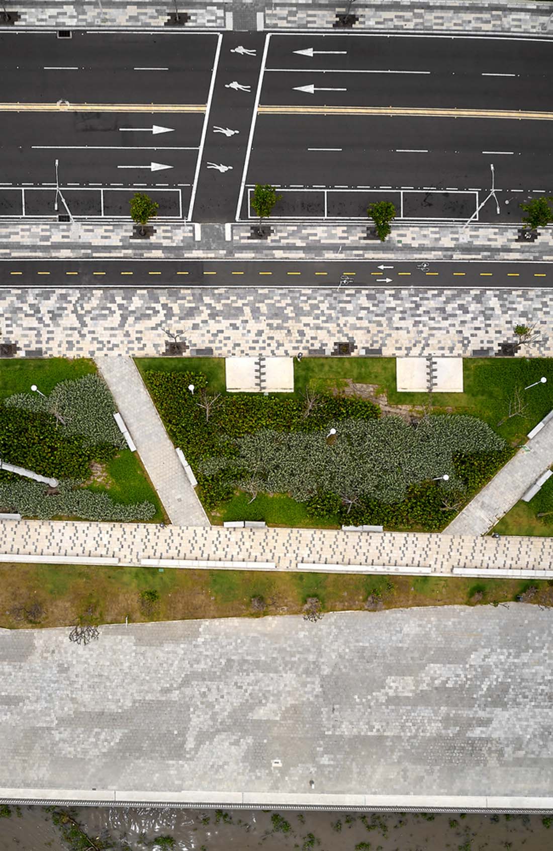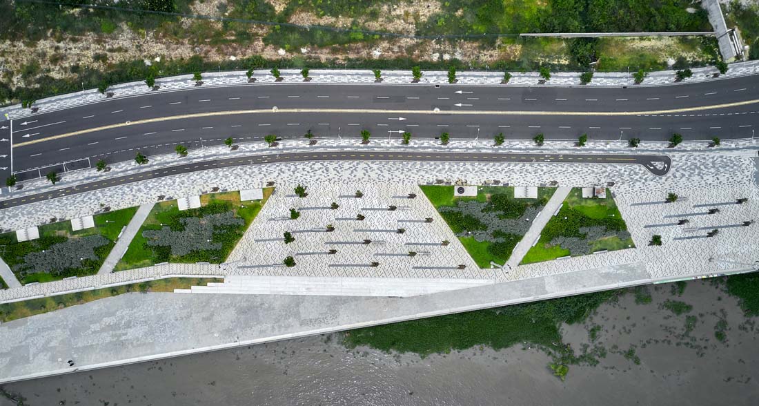 从上方可以看到这三个条带,并以渐变的颜色逐渐消失,从沥青的最暗色调到最后的解构的沙色鹅卵石最浅的程度,与河流的颜色形成鲜明对比。该视图给人的印象是视频游戏的像素化虚拟现实图像。
