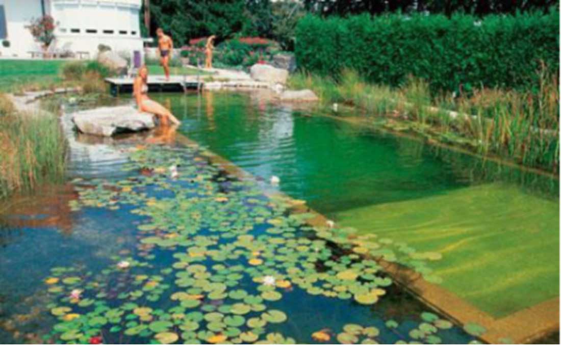 小提示:堆肥处尽量靠近动物棚舍。生态游泳池可不设置常规净化设施,特别是对人体有害的化学净化。但需要一个水生植物种植池(及相关专业物理净化设施),比例约为1:3。也就是说100平米的游泳池最好配置300平米的水生植物种植池(可养鱼)。