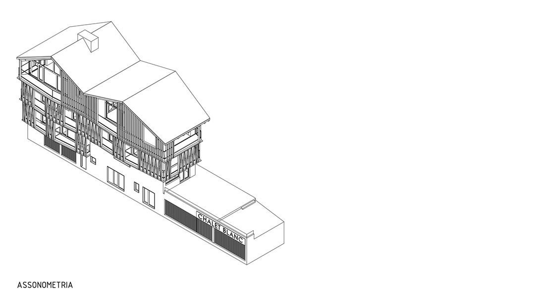 小木屋采用的是由干石外部包裹的砌体基础。木屋的地基除了支撑木屋的三层结构外,还为车库、设备间和滑雪用具储藏室提供了空间。住户可以通过一层北侧的入口进入到这些地下空间。小屋的一层容纳有一间卧室和一个水疗中心。水疗中心内配备了带漩涡的浴缸、休闲室,桑拿浴室和土耳其浴室等。健身区则可以俯瞰外侧的花园和铺有石头的大型日光浴室。