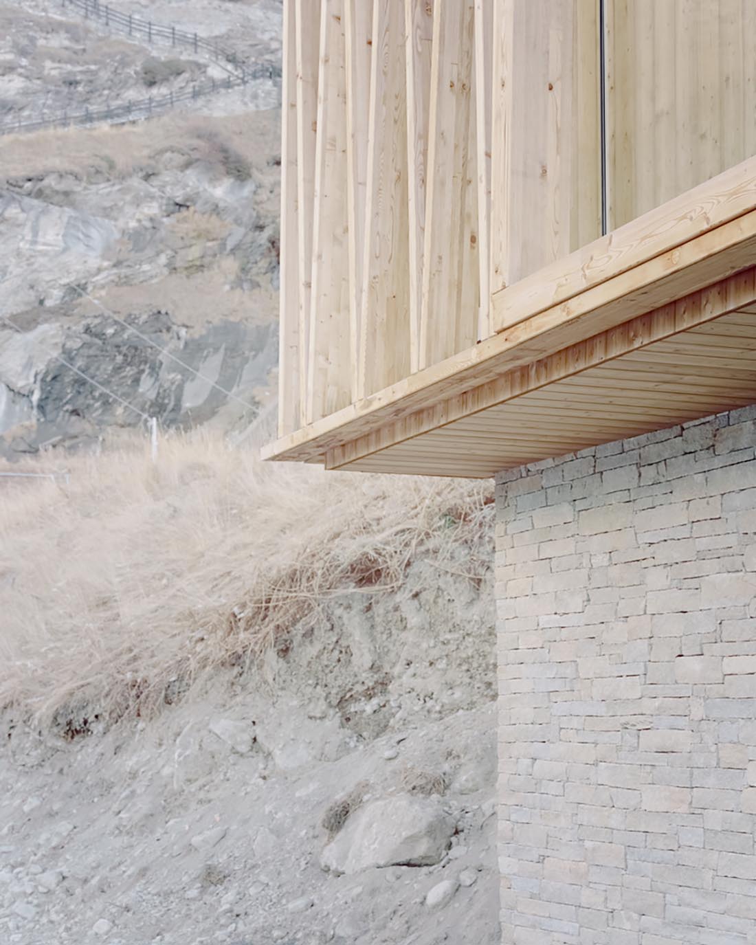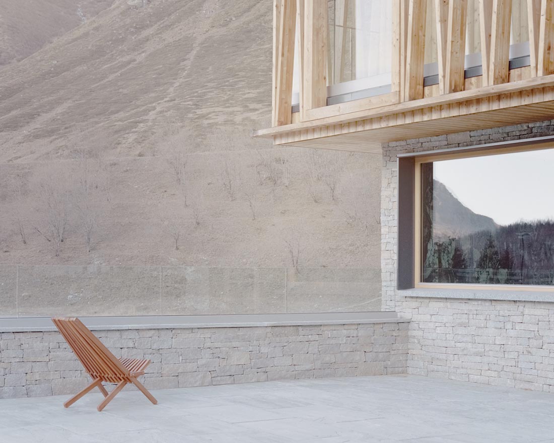 小屋的每个房间都与露台相连,部分的联通路径顶部还设有木制防晒网。小屋西北向的立面采用了全封闭式的设计,以更好地抵御外侧的严酷气候。小屋的墙面也相应地配备了由垂直木梁制成的结构骨架,来给小屋提供必要的强度支撑。小屋的东侧设有一个大型凉廊和围绕阁楼搭建的木制结构。