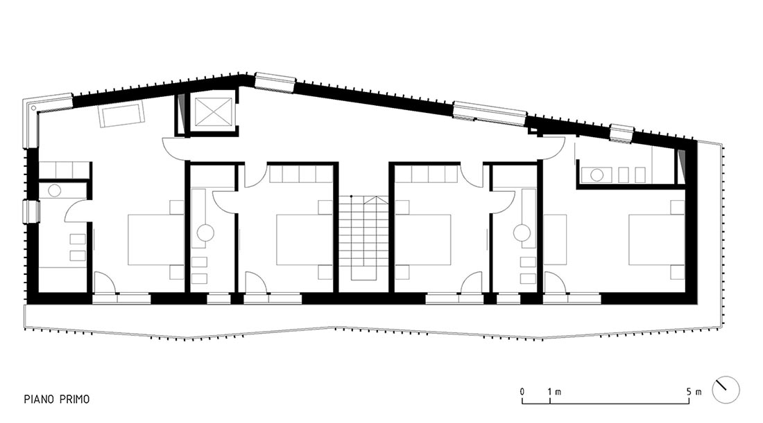 该项目源自一对年轻夫妇希望在切尔维诺山脚下建造一栋可持续小屋的想法。这栋小屋采用了预制的木结构,并以传统的木屋形态为灵感。整栋小屋呈现出W形的外观,以更好地享受室外的天空和瑰丽山峰。这一形态也在无形之中与周围的自然环境建立了一种良好的对话关系。