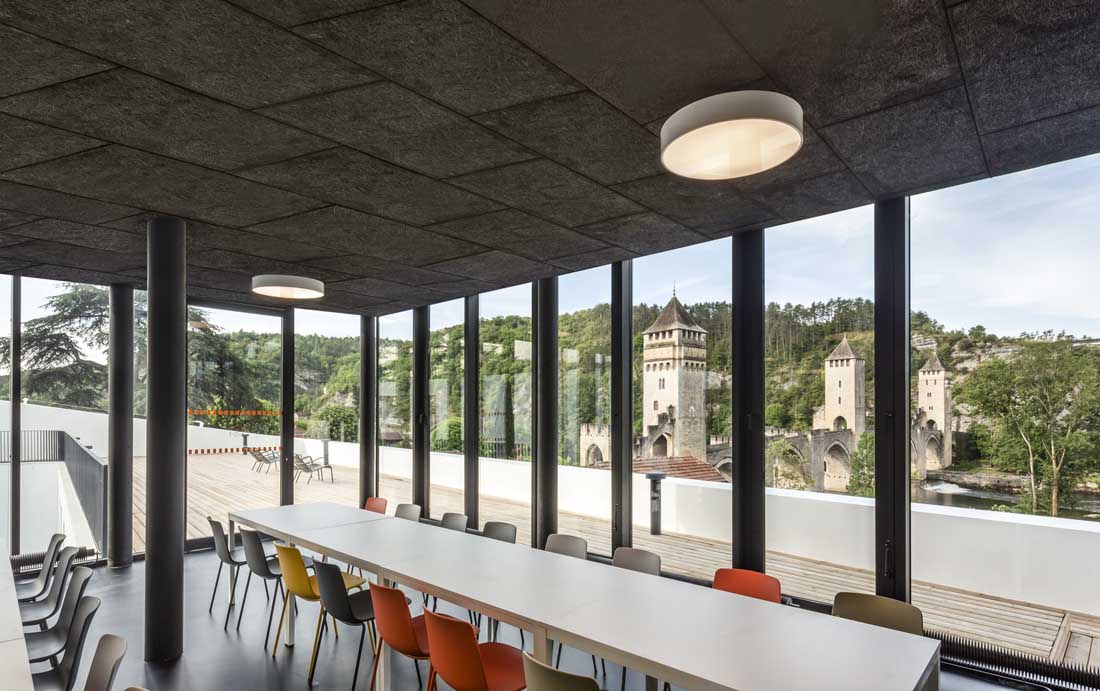 CHAI大楼俯瞰着瓦伦特大桥(ValentréBridge)和洛特河(Lot River),是一座“灯塔”,是沿着河岸延伸的绿色休闲区的新市民心脏。它可以俯瞰这座建于14世纪的坚固桥梁,并一览无遗,并被联合国教科文组织列为世界遗产名录,并与卡奥尔历史悠久的发现徒步旅行联系。