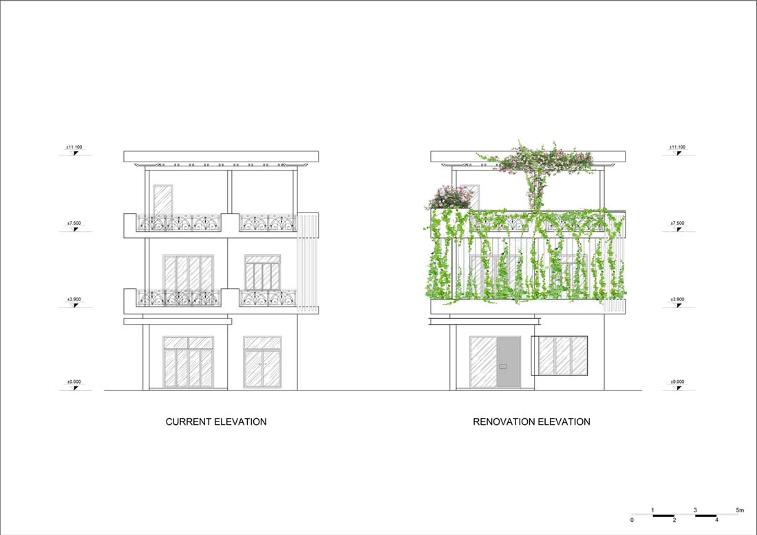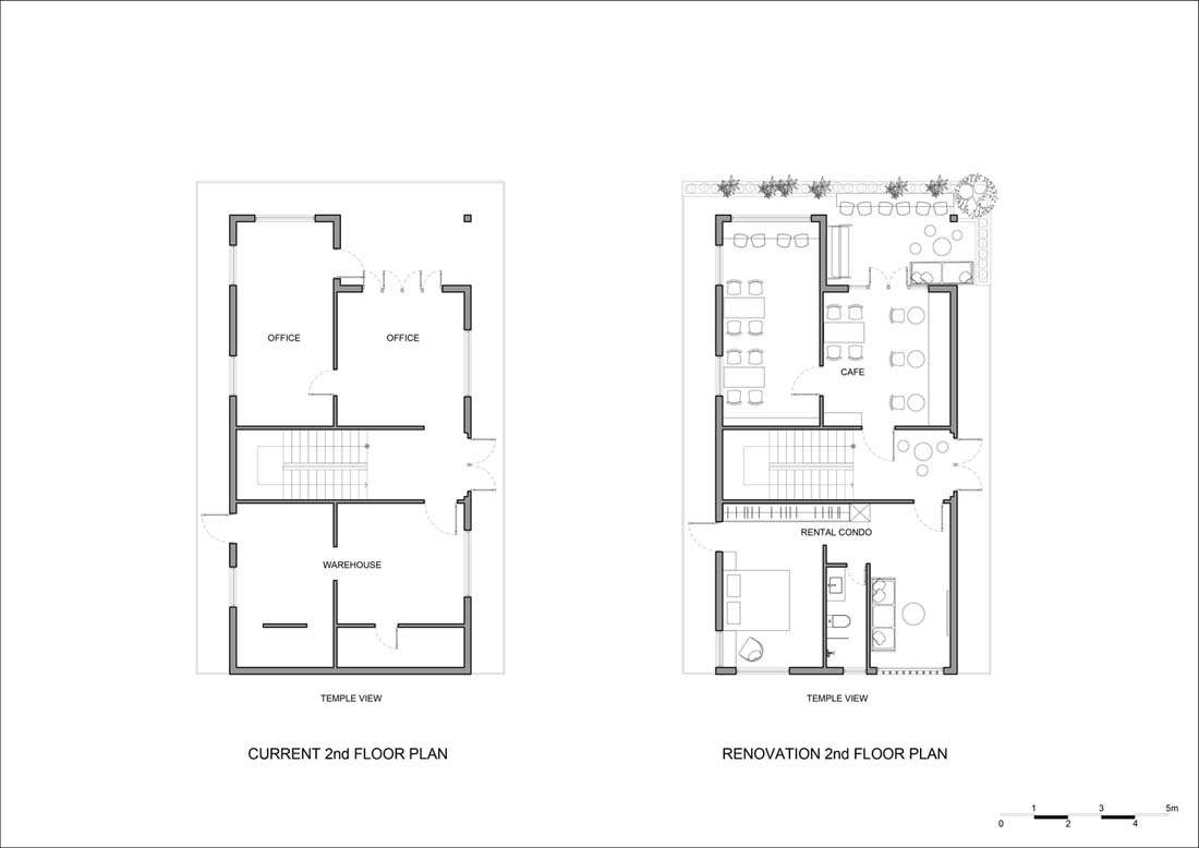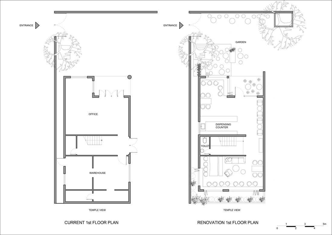 随着设计师发现建筑物后面一座华丽的寺庙的美丽,决定将后壁的整个墙壁拆除,从而露出那座古老寺庙的珍贵景致。尽管将旧建筑改造成咖啡店的理想是满足年轻一代的需求,但设计师希望不要破坏这座房子对家庭的记忆。
