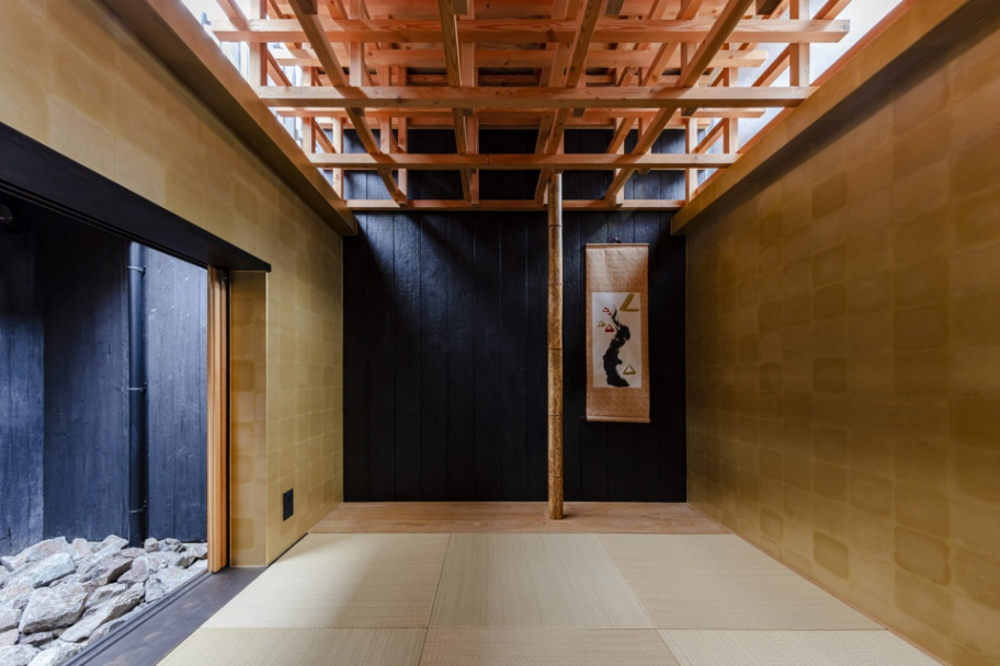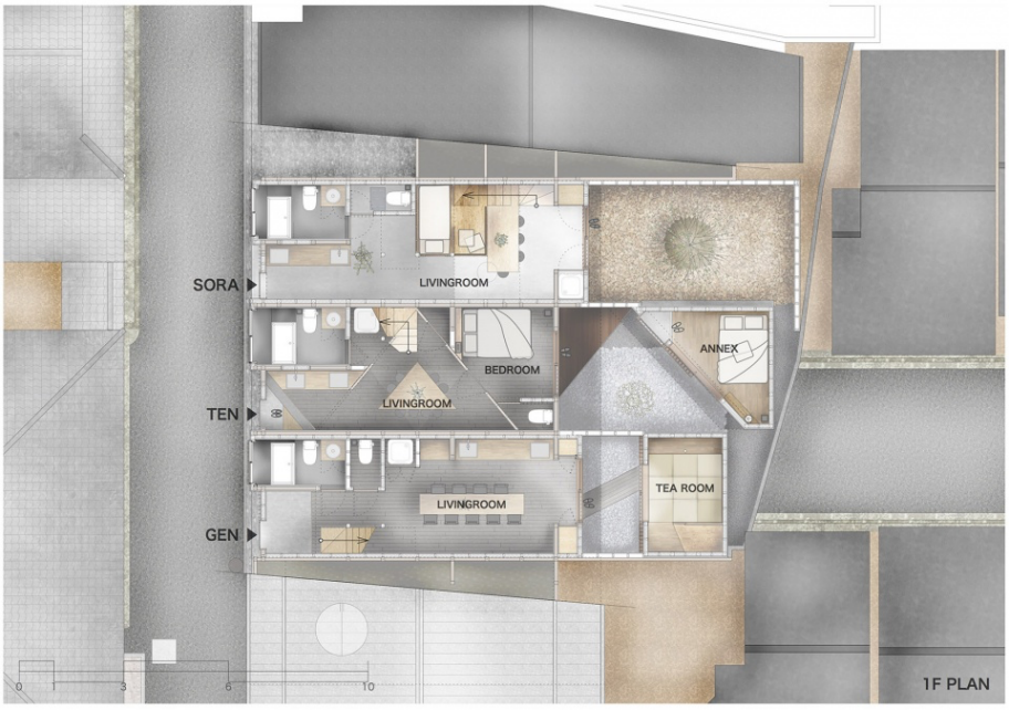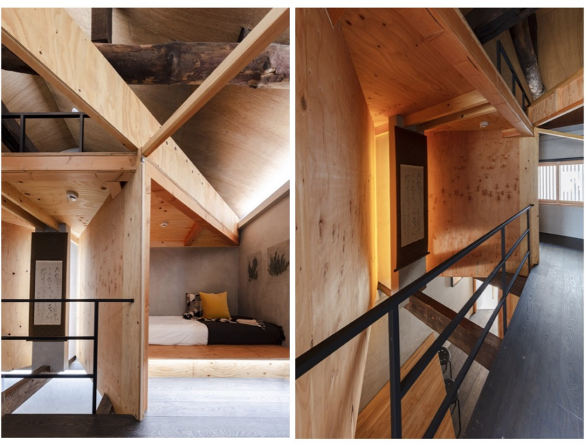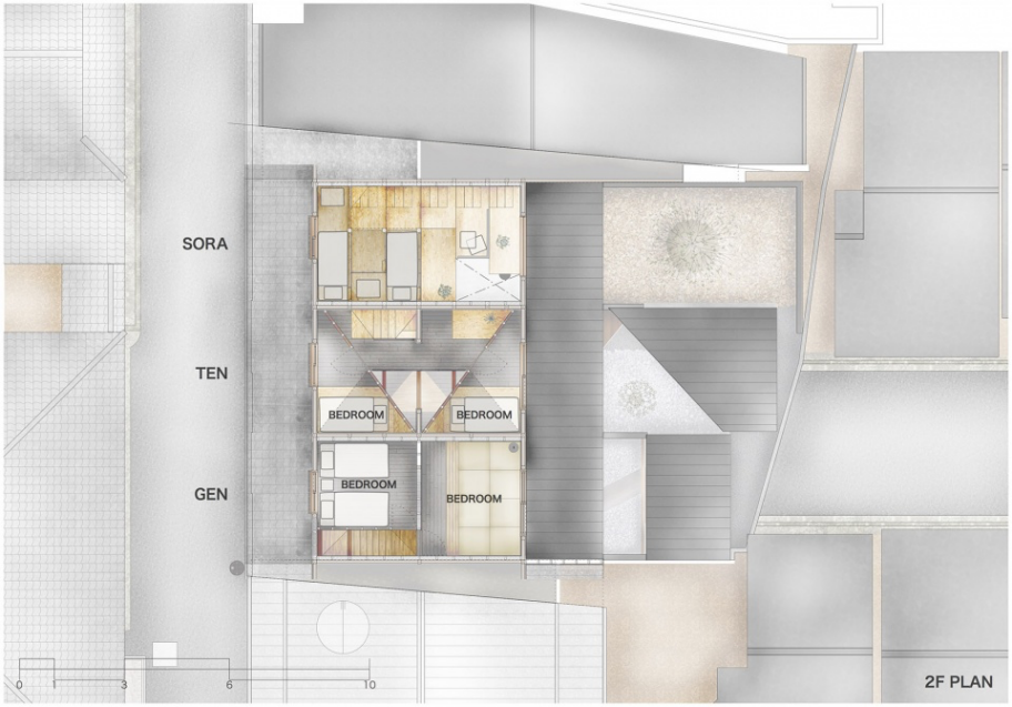 仔细观察建筑上多年来叠加的层层表皮以及背部加建的悬挑后,设计师感受到了真挚的“生活感”。越过过去数年的自由翻新,设计决定恢复大阪长屋本身的框架,再植入必要的元素。考虑到私人出租屋的运营,三间长屋需要各有不同。与酒店不同,每间50平米的屋子要能容纳八人居住。为此,建筑的边界墙需要足够厚重,满足防火和隔音的需求。日夜住在墙壁单薄的长屋里会令人徒增压力,音量控制是需要达到的最低礼节在SORA屋中,已经损坏的房梁和屋顶被替换,床的位置适应现有柱网,八间卧室如台阶一般层层向上。在一层,从街道到庭院的视线被打通;在上层卧室中,人们则可以俯瞰庭院景观。