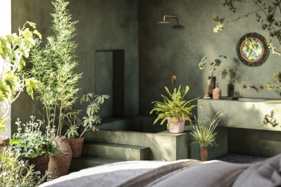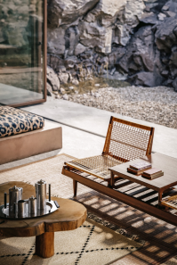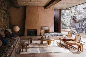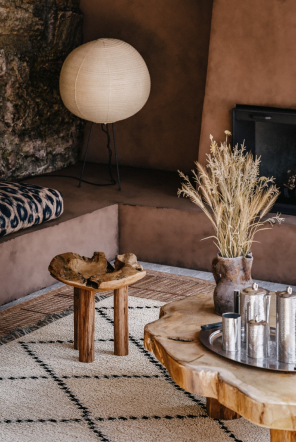 在客厅的混凝土天花和旧木梁下,朴素的壁炉是空间的主要元素。从豹纹座椅到摩洛哥地毯,家具布满各式各样的东方图案,具有原始风格。厨房整体质朴自然,家具尺寸合理便捷,人们可以在桉树餐桌举行温暖而亲密的聚会。沿着玻璃幕墙漫步到相邻的卧室和浴室,这里阳光明媚、绿意盎然。带有壁龛的石板和绿墙包围下郁郁葱葱的植物,提供了沐浴在室外的感官体验。