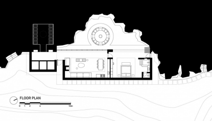 进入这片干旱的巨石群,充足的阳光直射进来,便可惊喜地发现温暖宜居的洞穴,里面是客厅和厨房。土色墙壁的边缘是转动玻璃门,它向岩石一侧滑动,室内外便融为一体