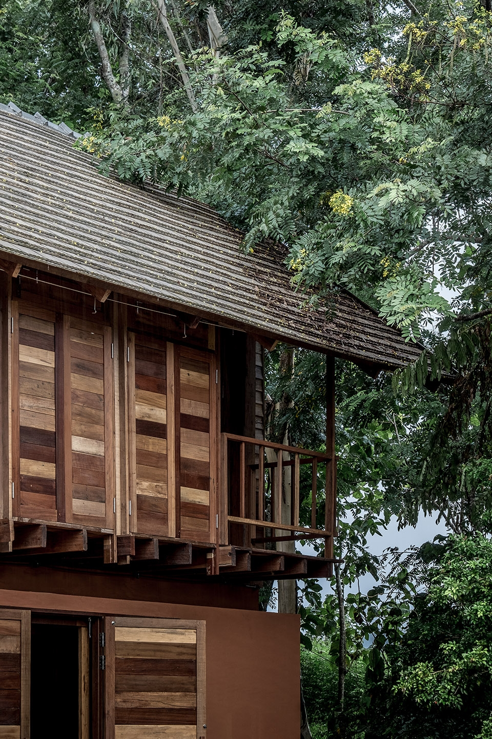回收的旧实木被选为建筑的主要材料。建筑师选择保留原始建筑的精髓,而不是完全复刻。组成原本建筑的材质和构成部分作为独立个体收集起来重新组织,形成新的造型,以服务新的功能。在建造过程中, 为节约成本减少浪费,每一片旧实木都被记录在案。一些旧木留有之前的木工痕迹,形态也不同,这些都被保留。每个痕迹都讲述了该片木板的故事和旅程。建筑的部分细节采用传统建筑工艺,另外的一些为了结构的完整性进行了改良优化。