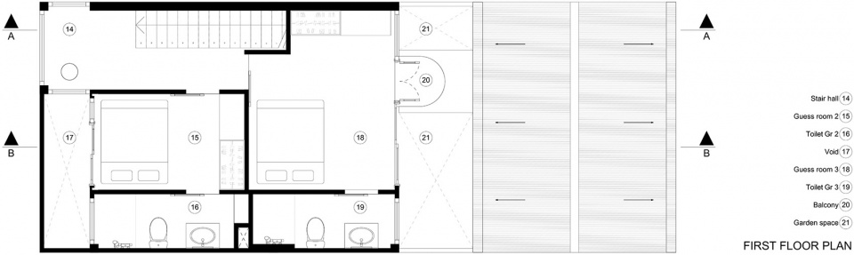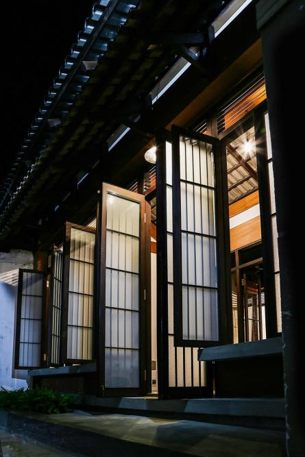 建筑使用了传统房屋的典型两层屋顶系统,包括仰合瓦和浮动框架天花板。其中,天花板是由覆盖着粗麻布的木框架制成的。屋顶和天花板之间是流通层,墙壁两侧为柱形系统。这种系统在屋顶和天花板之间形成了被动对流,以更好地隔热和提供极具日式特色的视觉效果。房间的一整面墙壁都被带百叶窗的半透明玻璃门替换,该设计在让光线易于在内部扩散的同时也为居住者提供了必要的私密空间。